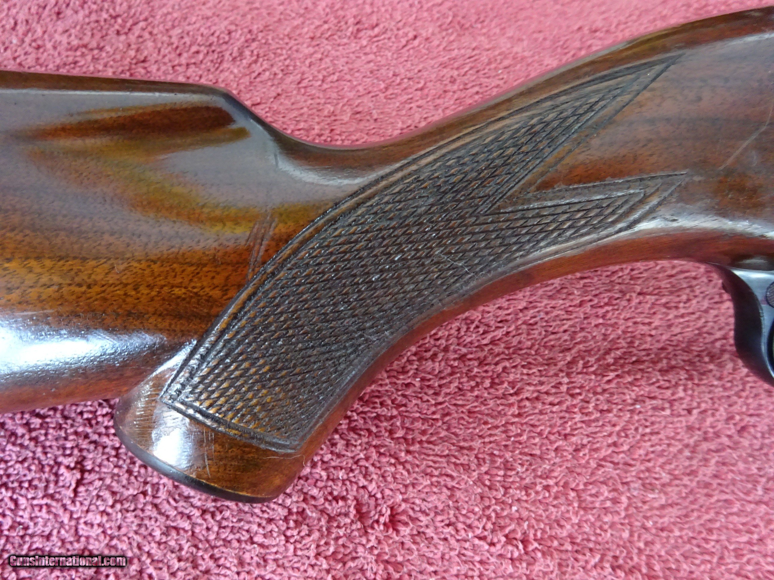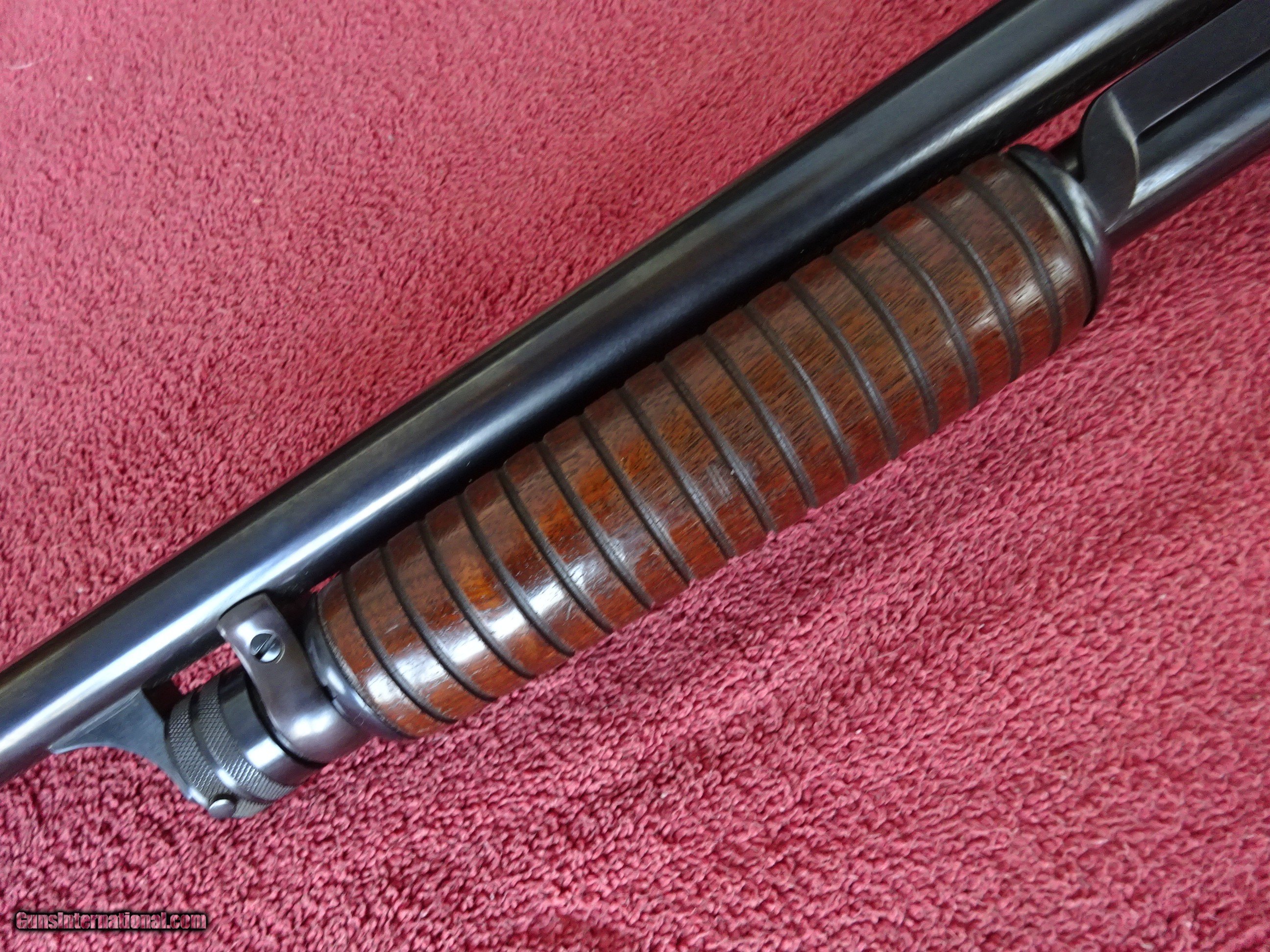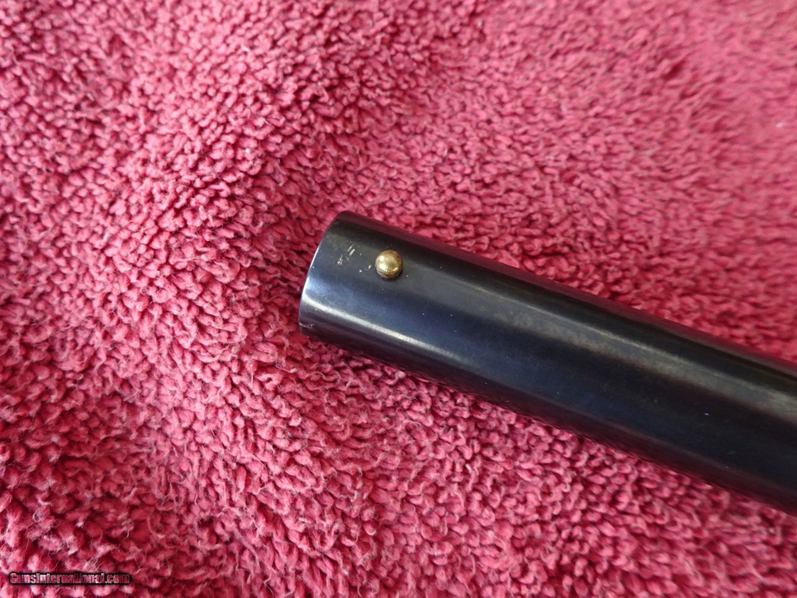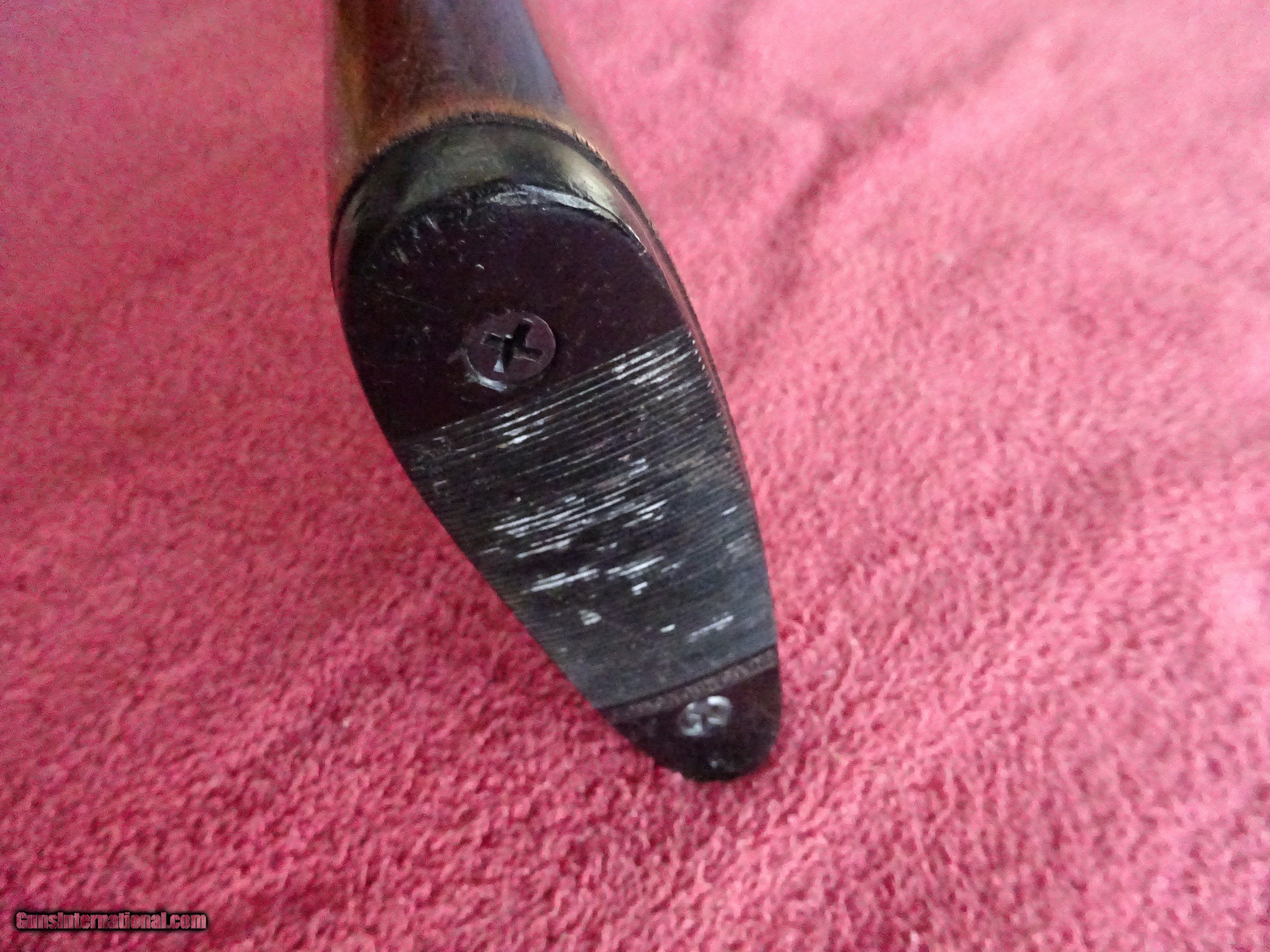 Description: ITHACA MODEL 37 FEATHERWEIGHT 16 GAUGE. MODIFIED 28" BARREL, 2 3/4" CHAMBER, SINGLE BEAD SIGHT, MIRROR PERFECT BORE, EXCELLENT OVERALL BRIGHT ORIGINAL BLUE. STANDARD ENGRAVING PATTERN WITH HUNTING DOG AND PHEASANTS ON RIGHT SIDE AND DUCKS IN FLIGHT ON LEFT SIDE. PISTOL GRIP STOCK, SMALL RIBBED FOREARM, ATTRACTIVE DARK FIGURED SOOD, SHARP CHECKRING. NORMAL HANDLING MARKS IN THE VARNISH. ORIGINAL GRIP CAP AND ITHACA MARKED BAKELITE BUTTPLATE, 14 1/4" LENGTH OF PULL, 6 POUNDS 4 OUNCES. MADE IN 1948, 100% ORIGINAL CONDITION. $775.00 + $70.00 Insured shipping to an FFL address. Layaway is available. See all Pats gun listings on this site! We also have hundreds of ORIGINAL gun company advertising & memorabilia pieces available for sale on our site SPORTINGCOLLECTIBLES. We have no reprints or reproductions. Email for more information. If you need to call, morning or evening is best, and please note the Seller's Inventory number. SOLD Curio/Relic: Yes |