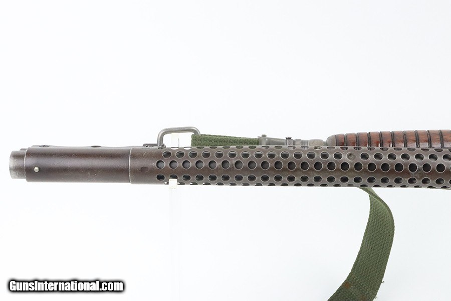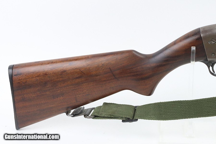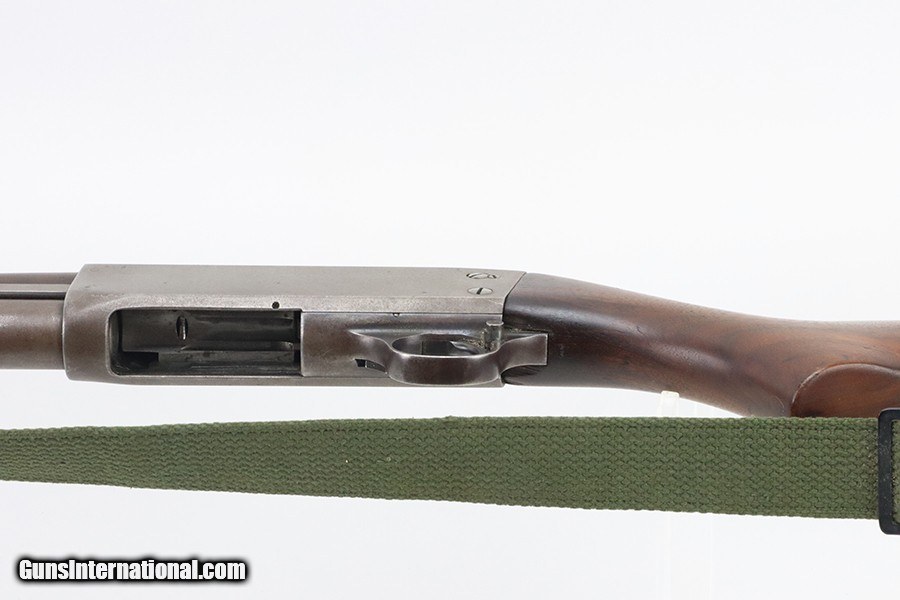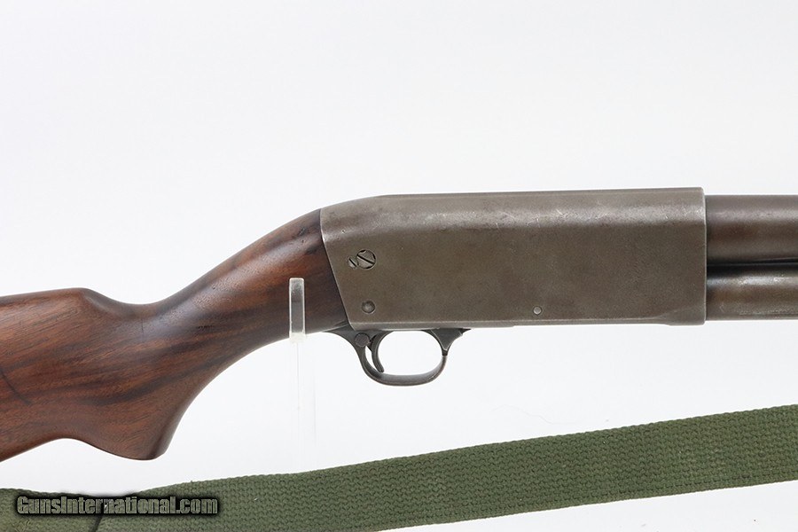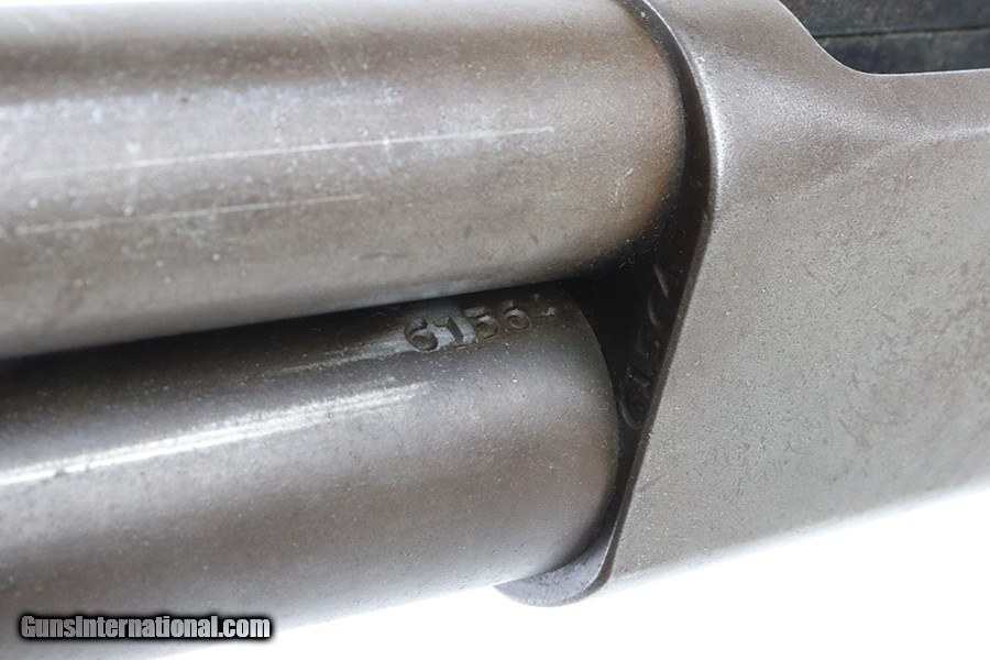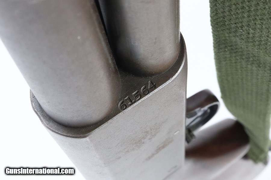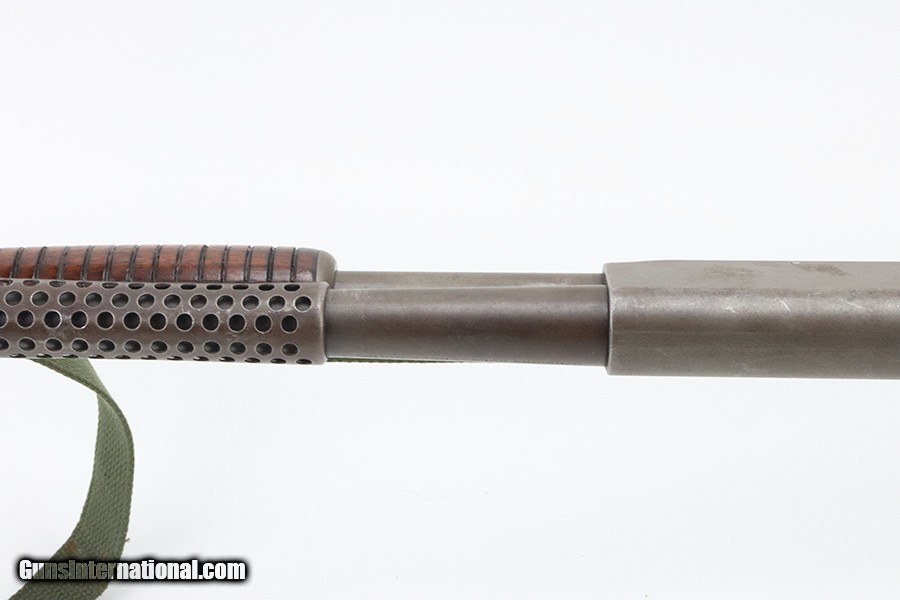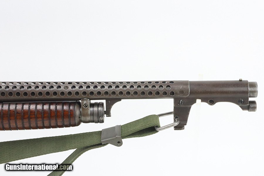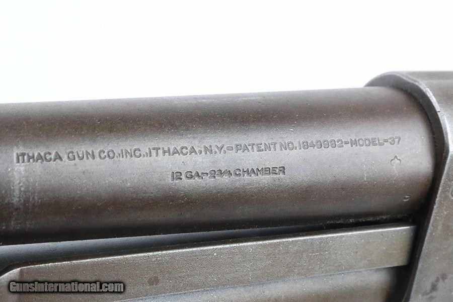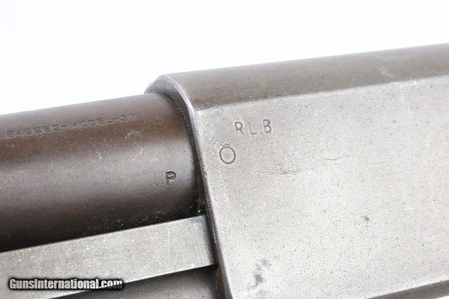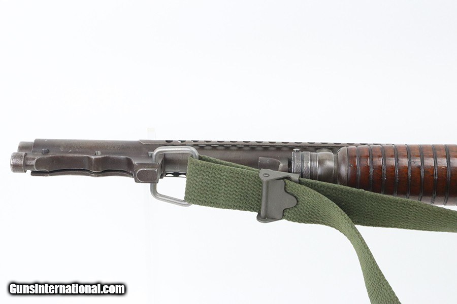 Description: This is the Holy Grail of the trench shotguns, the Ithaca Model 37 made in 1942. It is estimated that only about 1,400 were issued and far fewer are in collectors hands today. This gun is in the proper serial range of 61038-61856. Matching serials on barrel and receiver. The gun has been parkerized, so refinished at some point after the war and it's unknown whether by an arsenal or a collector. It is maker marked on the barrel as seen in the photos and flaming bomb proofed on the receiver, showing it was accepted into the US Military. It comes with the original heat shield and military bayonet lug. RLB marking on receiver indicates it was inspected by Lt. Col Roy Bowlin. Single brass bead sight on bayonet adaptor. Barrel has 12ga and 2 3/4 inch markings. Plain walnut stock with no cracks, just a few dings. Bore has minor frost. Unmarked canvas sling. SOLD Curio/Relic: Yes Shotgun Gauge: 12 Gauge |