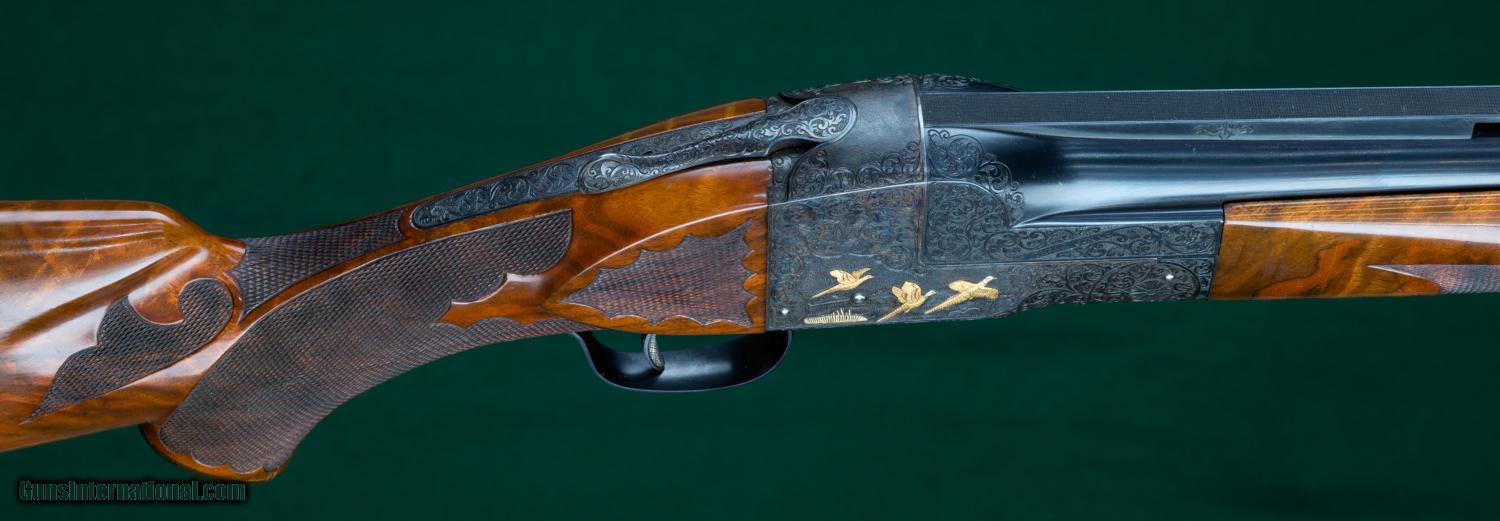 Description: 32" matted vent rib barrel with front and middle beads, choked full. 14 1/2" pull from gold plated, checkered trigger to solid red rubber recoil pad. 1 3/8" - 1 1/2" drop. Highly figured American walnut stock with Deeley-release beavertail forend, fluted horn-capped pistol grip, classic comb, vacant gold escutcheon, and point-pattern checkering with scalloped borders and with scalloped-edge checkered sidepanels. Casehardened action with automatic ejector, hold-open toplever, no safety, and with full coverage scroll engraving, two-tone gold ducks in marsh scene on left, three pheasants in farm scene on right, and ruffed grouse and two pine trees in gold on underside. Triggerguard bow with gold snipe and grass in gold with finely cut scroll on top and bottom of bow. Right and left side of barrel at breech finely scroll engraved and with “Ithaca Gun Co.” on right and “Ithaca, NY” on left in ribbon. Watertable engraved with S/N on right and 12 GA. $5000.00 Grade on left. Weight: 8lb, 11oz. Extremely fine condition, retaining 99% blue and 99% case colors. Crisp checkering. Excellent mechanics. Bright and shiny bore. In maker's trunk case. SOLD |