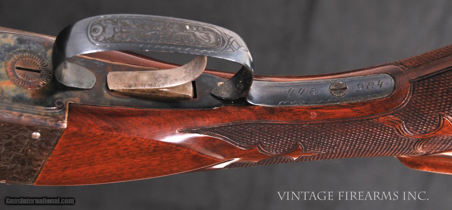 Description: Ithaca Grade 4 NID 16 Gauge SxS Shotgun VENT RIB, FACTORY MINT, 99%, RARE! General Specs: Ithaca, Year 1928, 28 Gauge, 6lbs 15oz, Side by Side Serial Number: 448984 What a great little Ithaca 16ga.! According to Walt Snyder’s book, “The Ithaca Gun Company- From the Beginning”, there were only 560 Grade 4 NID guns made in all gauges, 24 of them .410 and 28ga. guns, leaving 536 to account for 12ga., 16ga., and 20ga. guns. Over 1/2 of the remainder were 12ga. guns, leaving 268 guns in 16 and 20 gauge. The NID series began in the mid 1920’s and ran through 1949. The 20ga. guns became far more popular than the 16ga. guns by the 30’s and 40’s. MY EDUCATED GUESS PUTS THE ITHACA NID GRADE 4 16GA. PRODUCTION AT UNDER 100 GUNS. That is rare indeed! Now realize that this gun has a super rare factory ventilated rib, single selective trigger, and factory installed pad and you have one of about 10 ever made. This gun, serial number 448984 built in 1928, remains in crisp FACTORY MINT CONDITION. Usually when you see a vent rib on a vintage American side by side it is on a long barreled trap style gun. Finding one on the original 26" barrels with the splinter forend is likely one-of-a-kind. The barrels, receiver, trigger guard and forend metal are all factory original with 99.5% vivid finishes remaining. The barrel flats and breech face retain all of the factory jewelling, with perfect mirror bores choked CYL/F (.005/.024 restrictions from the factory), 2 9/16" chambers, everything near new. The receiver retains 99% vivid factory colors, engraving is crisp as new, the Miller style Single Selective trigger is crisp with both triggers breaking clean at 3.5lbs. pull. The wood is factory original wood that had the crackled finish we sometimes see on Ithaca graded guns of age. Not from use but strictly from storage and drying. We restored the finish to factory specification as new. The original factory sunburst pad is still with the gun. The gun comes with a factory letter from Walt Snyder documenting the gun as she is today. When it comes to investment quality firearms most are acutely aware that factory original condition, rarity, and desirable features are the most weighty items when determining value and desirability. The graded Ithaca NID guns are the best value in the market place and the guns poised to increase in value more than any other maker's gun. This is a once in a lifetime opportunity to own a rare, special order, factory mint conditioned Ithaca NID 16ga. Don't miss out! Thanks for looking. Barrels Barrel Length: 26" Chokes: 0.005/.024 Bores: perfect mirror Bore Diameter: 0.669/.667 Wall Thickness: .026/.025 % Blue: 99.5% factory Chambers: 2 9/16" Ribs: factory vent rib, tight Sights: single Action Action: tight, centered Ejectors or Extractors: ejectors, strong, timed Case Color: 99.5% vivid factory Screws: perfect Engraving: perfect factory sharp Trigger Type: single selective trigger, crisp Trigger Guard Color: 99.5% factory Stock Type: capped pistol grip/splinter, figured LOP: 14 1/8" Mid position, single selective trigger LOP To End Of Wood: 13 1/8" DAH: 3" DAC: 1 15/16" Cast: 3/16" off Checkering Condition: perfect Butt Treatment: factory pad There are more photos upon request. We offer a 30 day mechanical warranty on this fine shotgun. Call us for full details. PLEASE SEE MY OTHER FINE VINTAGE FIREARMS. Just open one of my ads and click on the line that says “see all items from this seller” and a very nice list of fine sporting and collectible arms will appear. I have many more fine sxs shotguns not yet listed. Thanks for looking! We employ a full time gunsmith on premises and can perform alterations to suit your needs within a few weeks of purchase. Payment Methods: Money Order, Certified Check, Personal Check, Wire Transfer Inspection Period / Return Policy: Three Days from the date the item was received. Sales Tax: 6% Michigan Only Shipping & Insurance: Ground $110.00 We ship internationally! Item Condition: Used Requires FFL?: Yes If you have any questions about this item or payment, please email or call us directly, at #616-292-6240. Thanks! Jay Shachter, Vintage Firearms, Inc SOLD Curio/Relic: Yes |