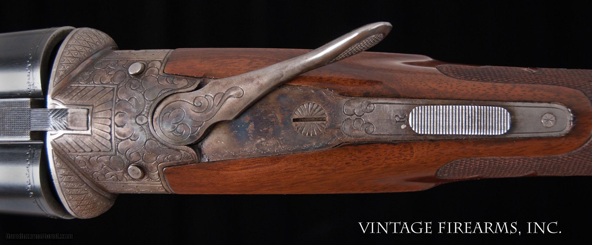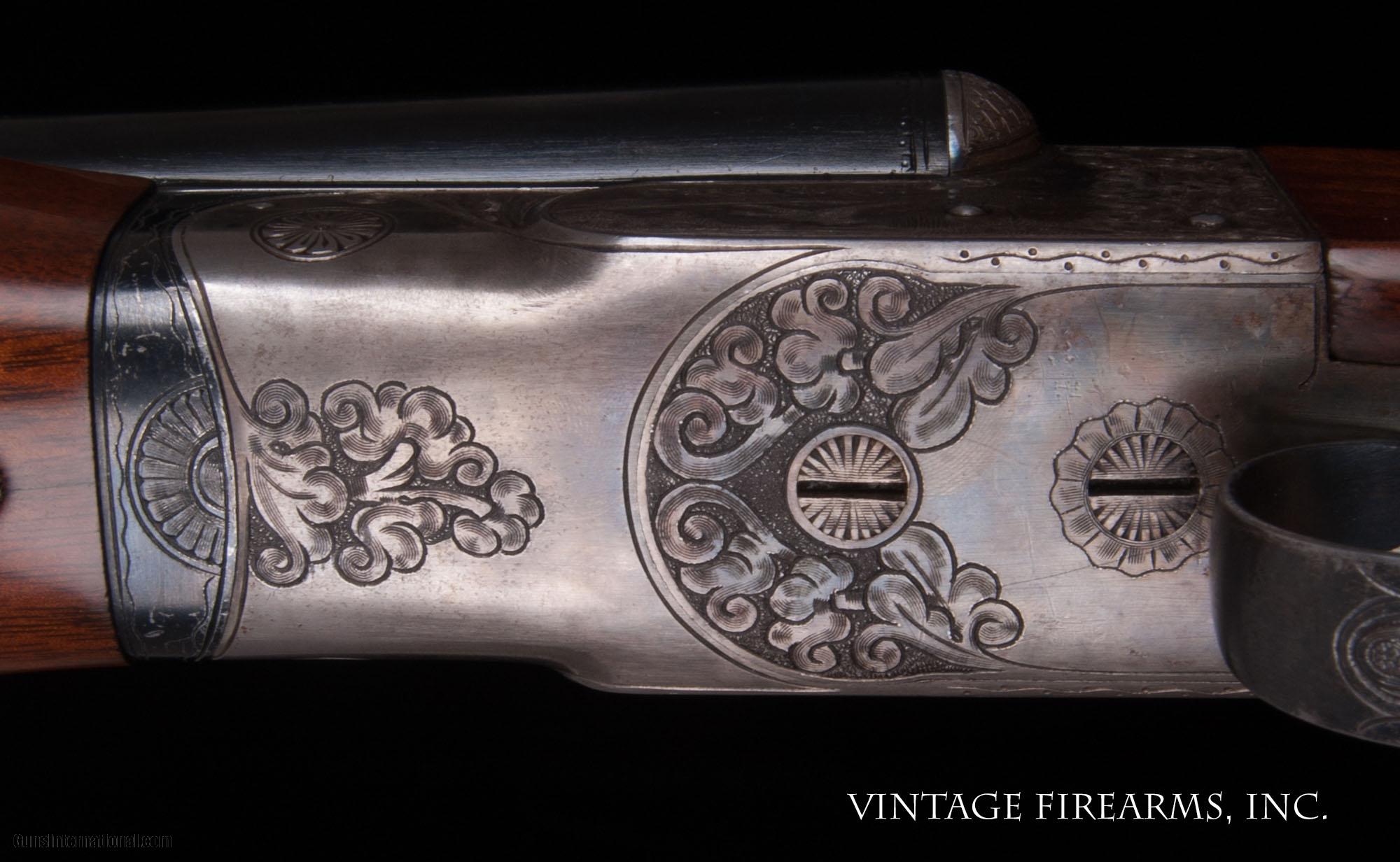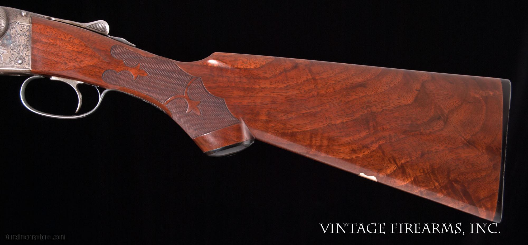 Description: Ithaca Grade 4E NID 20 Gauge Side-by-Side VENT RIB, 32" BARRELS, 75% CASE COLOR, TRAP General Specs: Ithaca, Year 1929, 20 Gauge, 7lbs 6oz, SxS Serial Number: 456863 According to Walt Snyder's book, "The Ithaca Gun Company; From the Beginning" there were only 45,000 Ithaca NID (New Ithaca Doubles) produced from 1926 to 1946. But when analyzing the production of Grade 4 and above guns, there were only 560 Grade 4 guns produced in all gauges, with about 150 or less in 20ga. guns. This gun, sn456863 built in 1929, is a FULLY OPTIONED TRAP CONFIGURED GUN, AND IS ONE OF A TINY HANDFUL OF GUNS SO PRODUCED. A gorgeous gun with all original factory parts, as shipped and documented in Walt Snyder's letter, retaining lots of condition, with very rare 32" vent rib barrels, beavertail forend, SST, ejectors, double ivory beads, factory butt plate, this is a true investment quality shotgun with CONDITION, RARITY, AND DESIRABL RARE OPTIONS. And of course, it has that fully figured Ithaca walnut with the fancy flor-de-lis checkering that sets the Ithaca guns apart from all others. This is a great gun! The gun has not been altered in anyway regarding configuration or features. We rust blued the barrels and restored the wood to factory new condition, the chokes remain Full/Full, bores are mirrors, no cracks anywhere, perfect checkering, clear and beautiful engraving, 90% factory case color (fading and the camera flash blows it out, but in hand it is much more evident), great dimensions...this gun has it all. What a fantastic sporting clays gun and dove/duck gun. Ithaca guns have just started to be noticed in the American vintage double world, and as such are a tremendous value and investment opportunity. Guns like this will increase in value much more than a similar Parker or Fox, as they have already seen high gains. Thanks for looking, and don't miss out on this rare Ithaca! Barrels Barrel Length: 32" Chokes: .030 both factory chokes F/F Bores: mirror Bore Diameter: .619 both Wall Thickness: .031/.032 % Blue: 100% Chambers: 2 3/4" Ribs: tight vent rib Sights: double ivory factory Action Action: tight, way right of center Ejectors or Extractors: ejectors strong timed Case Color: 90% factory Screws: perfect Engraving: clear and sharp Trigger Type: Miller single selective trigger, crisp Trigger Guard Color: 90% factory Stock Type: capped pistol grip/beavertail forend/ figured black walnut LOP: 14 5/16" LOP To End Of Wood: 14 1/8" DAH: 2 3/4" DAC: 1 5/8" Cast: 1/4" off Checkering Condition: excellent Butt Treatment: factory plate There are more photos upon request. We offer a 30 day mechanical warranty on this fine shotgun. Call us for full details. PLEASE SEE MY OTHER FINE VINTAGE FIREARMS. Just open one of my ads and click on the line that says “see all items from this seller” and a very nice list of fine sporting and collectible arms will appear. I have many more fine sxs shotguns not yet listed. Thanks for looking! We employ a full time gunsmith on premises and can perform alterations to suit your needs within a few weeks of purchase. Payment Methods: Money Order, Certified Check, Personal Check, Wire Transfer Inspection Period / Return Policy: Three Days from the date the item was received. Sales Tax: 6% Michigan Only Shipping & Insurance: Ground $95.00 We ship internationally! Item Condition: Used Requires FFL?: Yes If you have any questions about this item or payment, please email or call us directly, at #616-292-6240. Thanks! Jay Shachter, Vintage Firearms, Inc We employ a full time gunsmith on premises and can perform alterations to suit your needs within a few weeks of purchase. Common requests are: -stock bending to suit your particular requirements -addition of any specified butt pad to increase length of pull -alteration of chokes to suit your shooting preferences -lengthening of chambers and forcing cones -darkening stock color with penetrating stains -restoring any part of the gun including rust blue, charcoal blue, bone and charcoal case color, wood restoration and checkering recuts. If you like one our guns but it needs "tweaked", let us know and we can quote you a time and price. Some enthusiasts like the guns "as found" and others want them "just so". We often list guns as found and let the particular buyer choose how they want their gun to fit or look. SOLD Curio/Relic: Yes |