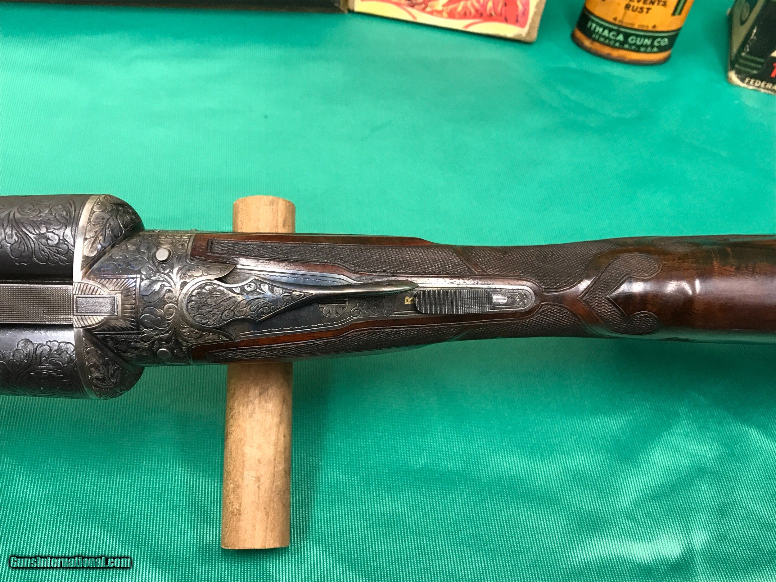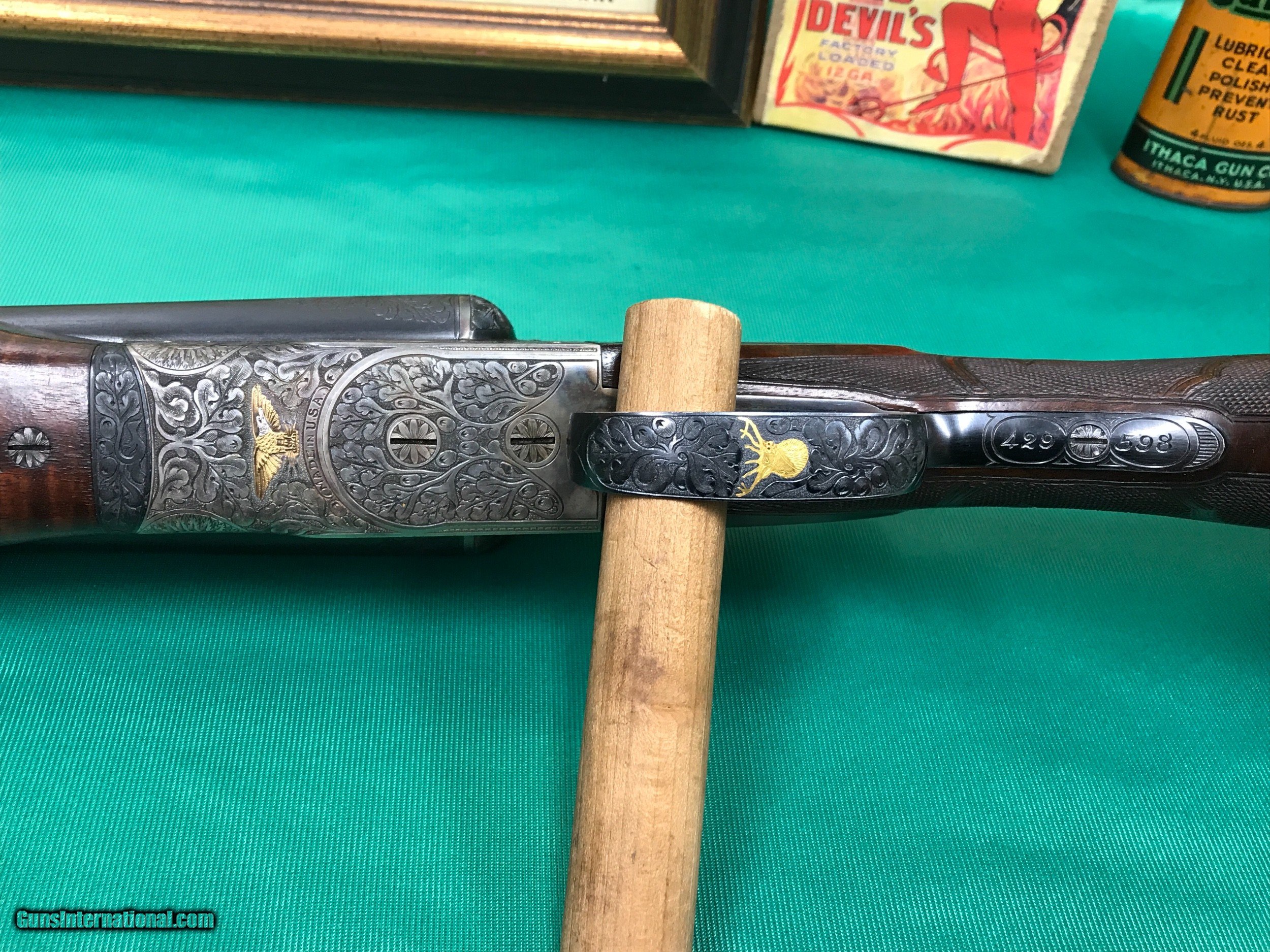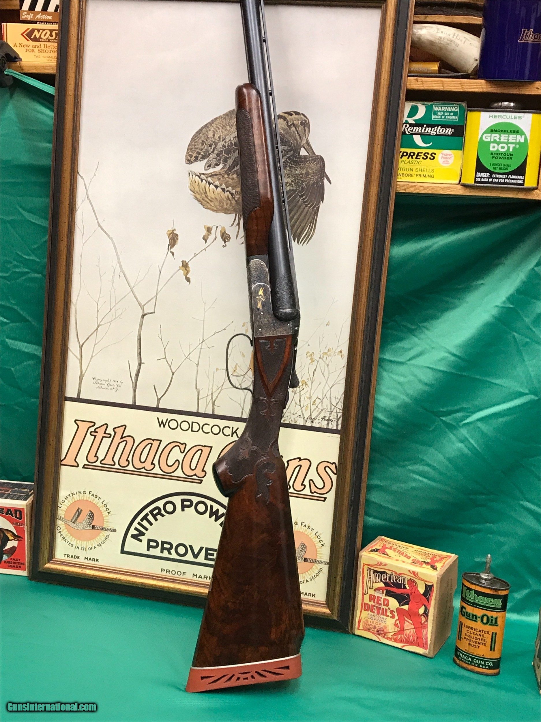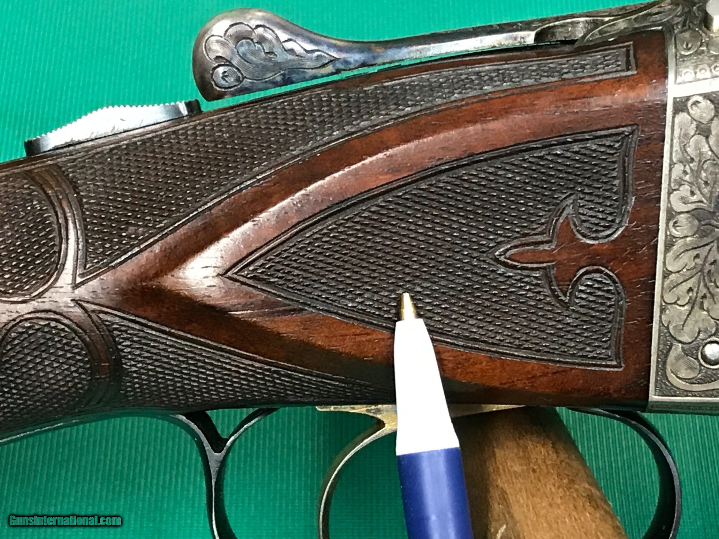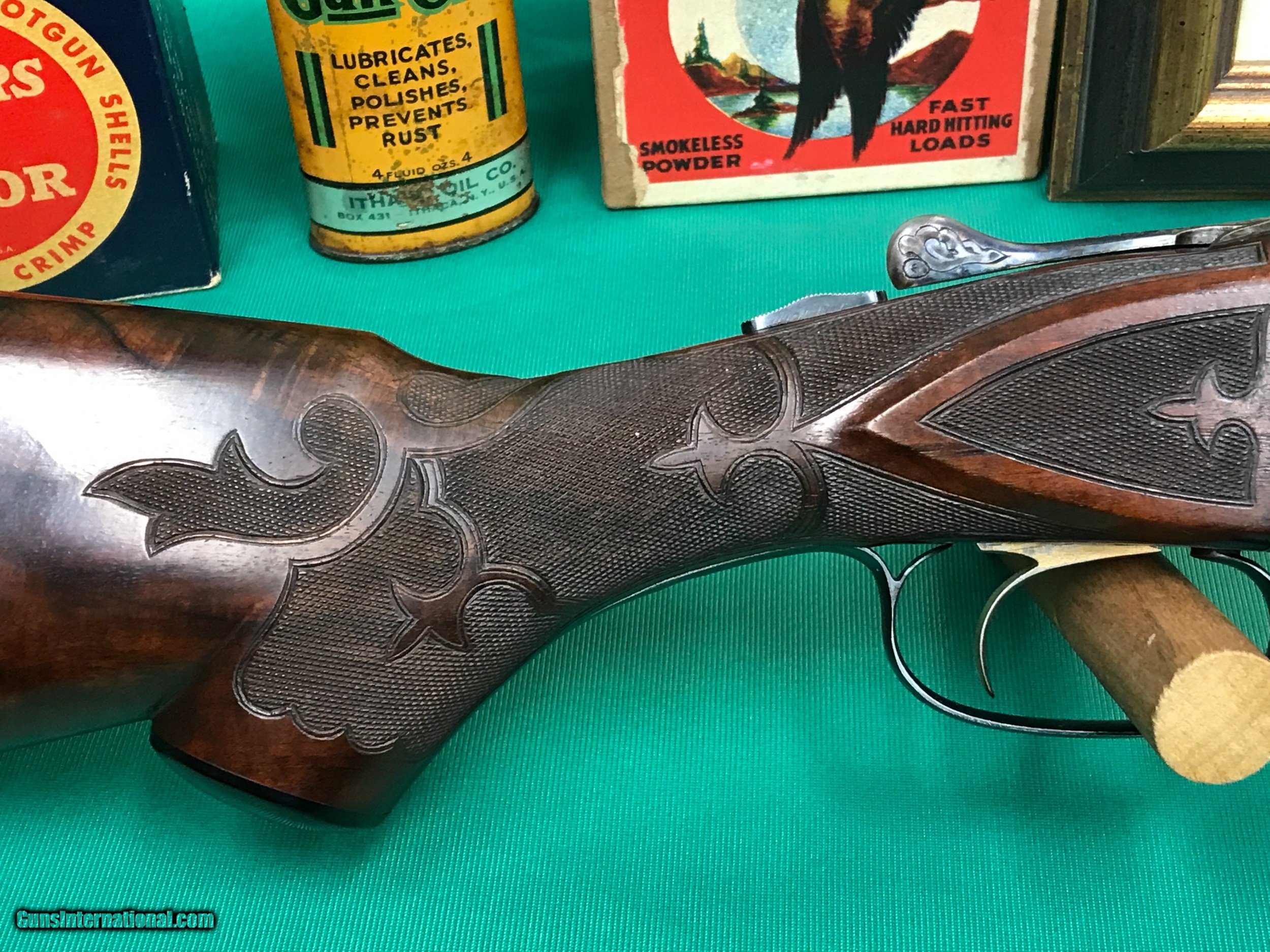 Description: We have a fully optioned Grade 7E that was built in 1926 , the gun was shipped to Elmer Starner on August 20,1926 who won the Grand American with a Grade 5 Ithaca Knick in the same year . The gun features 32'' barrels that are choked Full/Full .040-.040 , Ejectores , SST .731 Bores , 14'' LOP to an Ithaca pad which has been replaced ,DAC 1 1/2'' DAH 1 1/2'' , Baby Monte Carlo , this is a live gun with no safety , the the gun letters exactly as described from Cody . I believe this is one of the best Grade 7's in the country , there were only approximately 22 grade 7 NID built . It is nearly flawless there is a mark on the right cheek piece please see the picture with the pen , This is not a crack !!!...... other than that its perfect wood ,metal ,bores ect .Any questions please call or e-mail 607-227-4088 . More pictures can be had on request. Thank you Brian SOLD Manufacturer: Ithaca Model: NID Barrel Length: 32 Bore: 731 Ejectors: yes Condition: very good Metal Condition: very good Wood Condition: very good Bore Condition: very good Barrels: 32 |