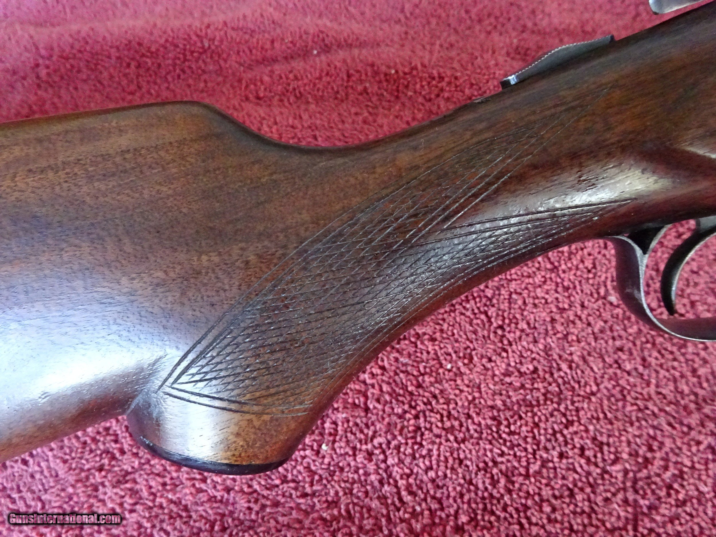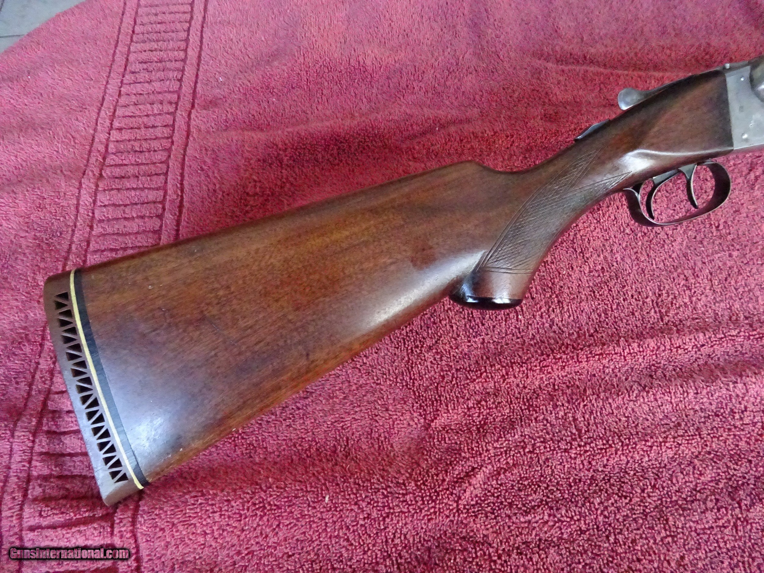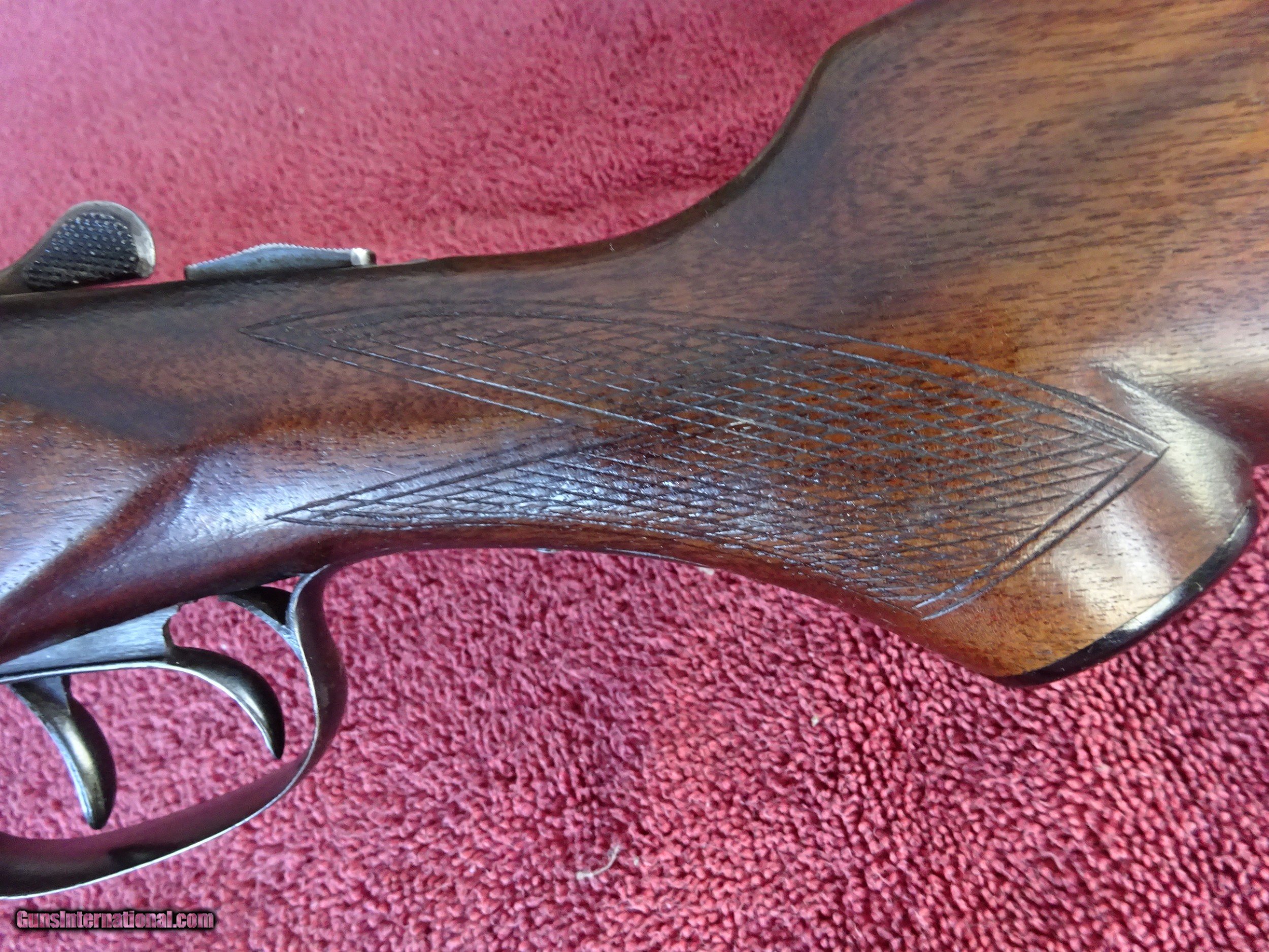 Description: ITHACA N.I.D., FIELD GRADE 12 GAUGE. 30" BARRELS, MODIFIED AND FULL, VERY GOOD BLUE, MIRROR BRIGHT BORES, 2 3/4" CHAMBERS, SINGLE SIGHT, EXTRACTORS. STANDARD ENGRAVING WITH A POINTING DOG ON BOTH SIDES, CASE COLOR IN THE PROTECTED AREAS, TOP LEVER TO THE FAR RIGHT, TIGHT ON FACE. PISTOL GRIP STOCK, SPLINTER FOREARM, VERY GOOD WOOD AND CHECKERING. DIMENSIONS 1 1/2" X 2 3/4" X 14 5/8", 7 1/4 POUNDS. MADE IN 1926. GOOD HONEST TURKEY GUN. $650.00 + $50.00 Insured shipping to an FFL address. See all Pats gun listings on this site! We also have hundreds of pieces of ORIGINAL gun company advertising & memorabilia available for sale on our site SPORTINGCOLLECTIBLES. We have no reprints or reproductions. Email for more information. SOLD Curio/Relic: Yes |