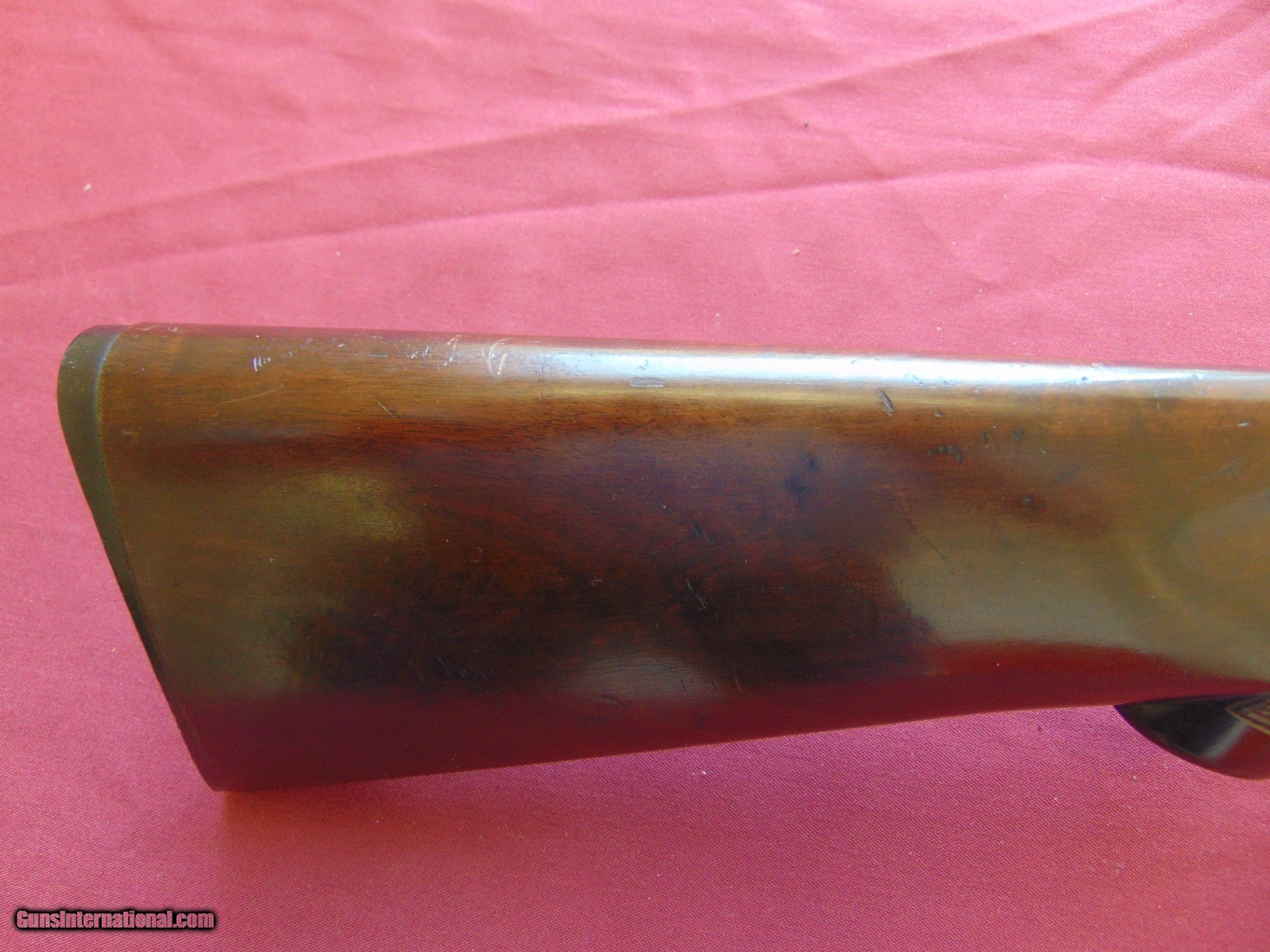 Description: High condition Ithaca NID in 16 Gauge. Metal retains 98% Original Blue and 90+% Original Case Colors. Wood retains 90% original finish with some marks on the right side of the Buttstoclk ( Pictured ) and a Beavertail Forend. Double Triggers and Auto Ejectors. Real late gun serial # 4695xx (1948, Last year of Production ). Believe this is a parts clean-up gun with such a late serial number. Beavertail is Ithaca but different than the earlier NID's. The 30" Barrels are interesting on a 16 Gauge. Don't see many of these. No markings on the barrels as we normally see on the NID's. This also makes us feel this is a parts cleanup gun. Excellent Bores. Nice Gun. SOLD Curio/Relic: Yes |