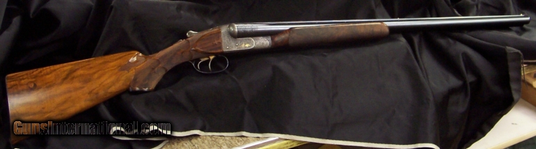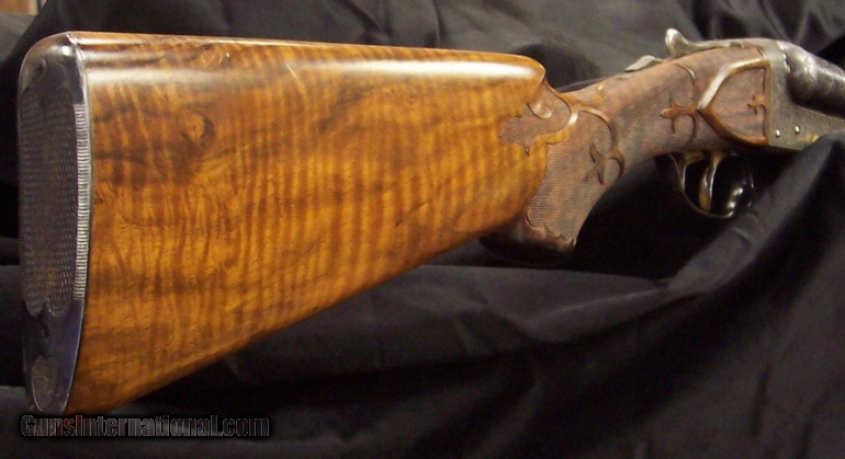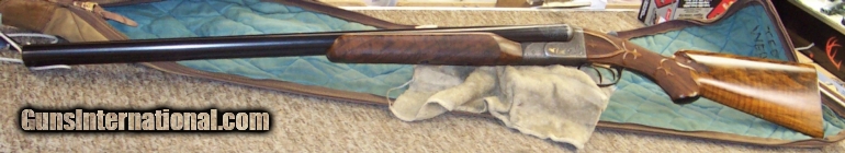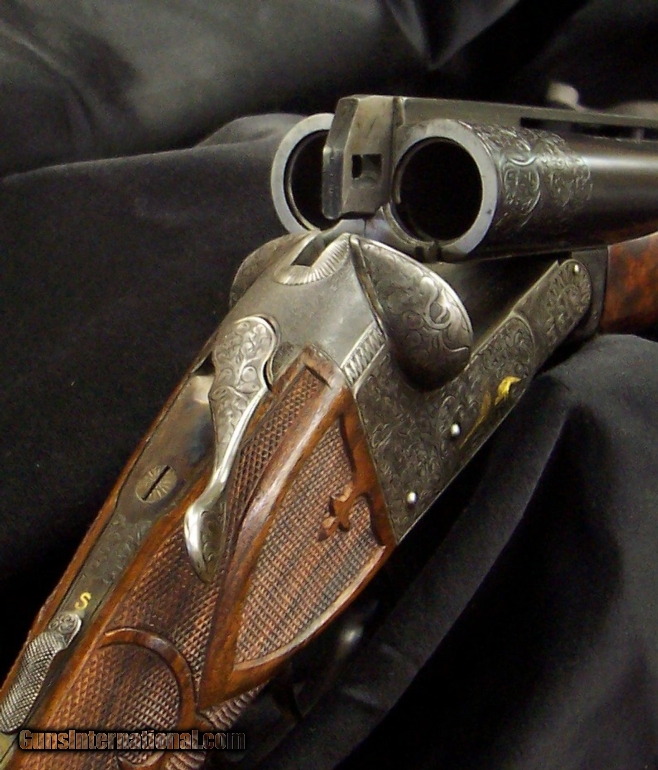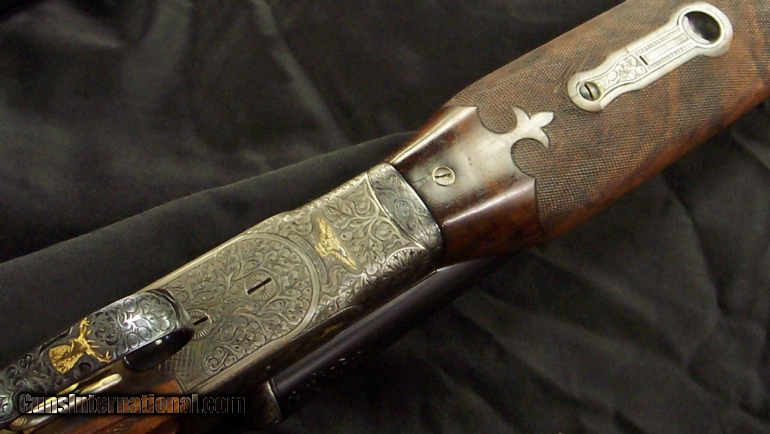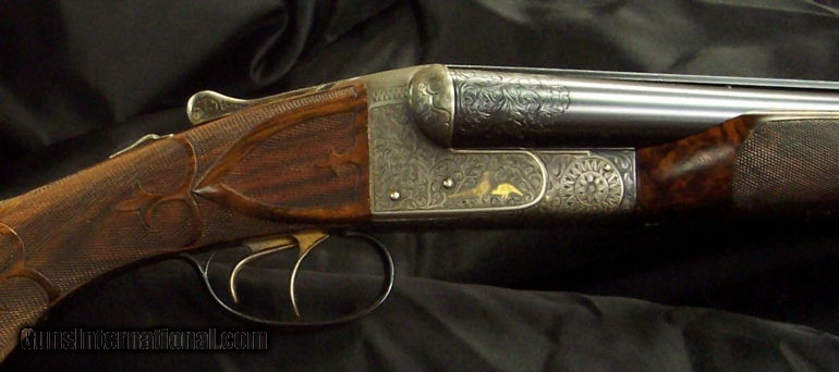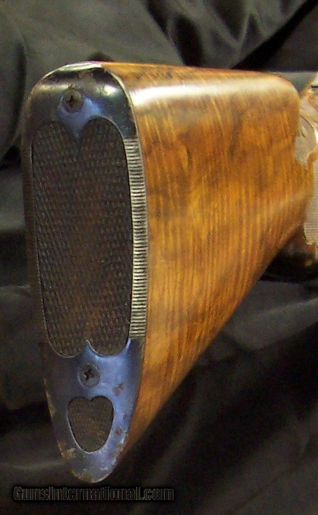 Description: Ithaca NID Grade 7 E 12 gauge 28 inch barrels, modified/full chokes. According to Ithaca records only 22 Grade 7 E guns were manufacture in 12 gauge. This gun was sold to Louis A. Wehle, founder of The Genessee Brewing Company in 1936, as part of a 3 gun package. Stock was refurbished in the mid-1970's by Dick Collins of Bloomfield, New York. Double vent rib with two sighting beads. LOP is 14-1/8 inches, the drop at the heel of 3 inches. Gold tone double triggers. Steel skeleton butt plate. horn pistol grip cap. Escuteon shield engraved 'LAW'. Receiver and trigger guard are fully engraved with gold inlays. The wood around the forearm release is weak/damaged and with need a profession repair completed. SOLD |
