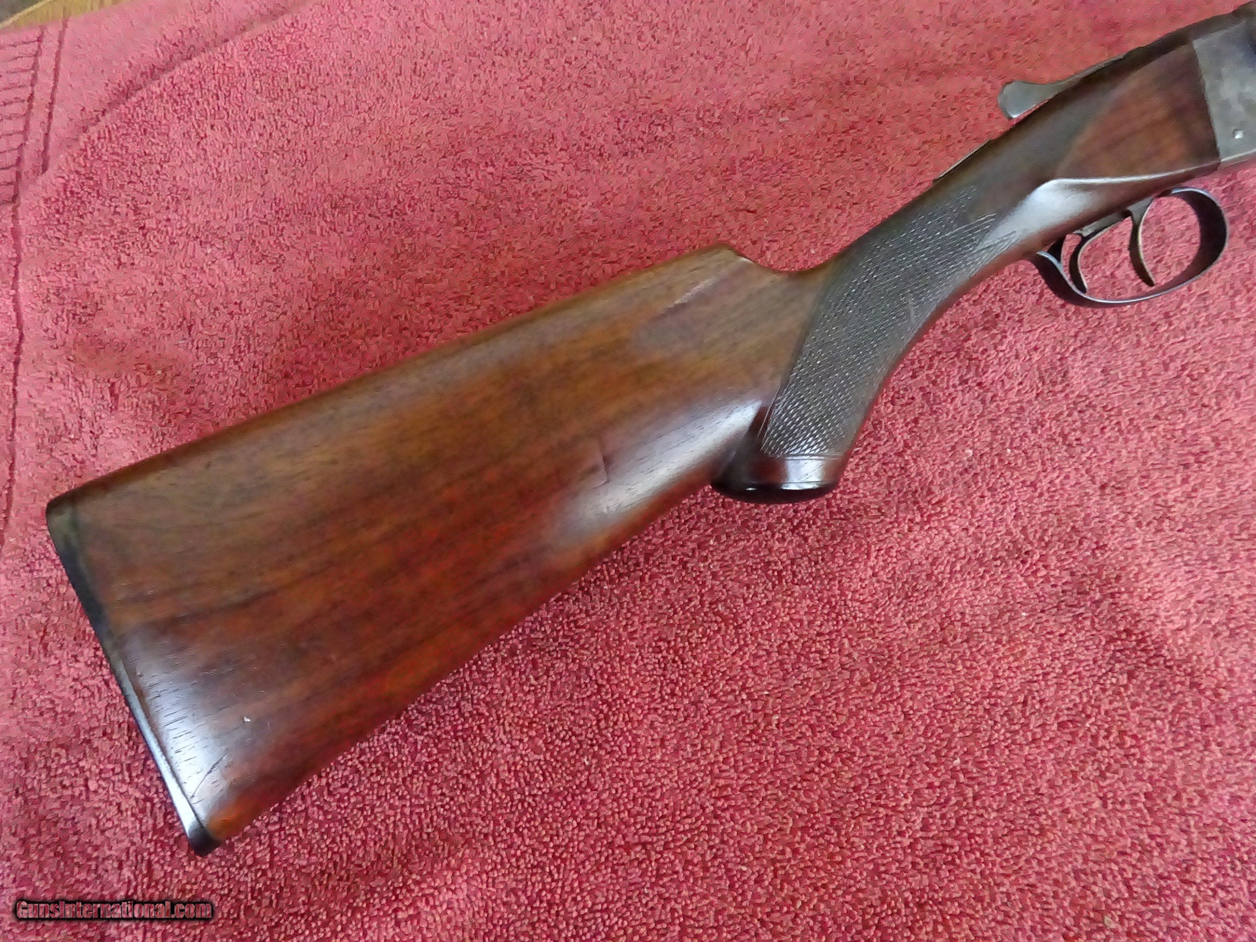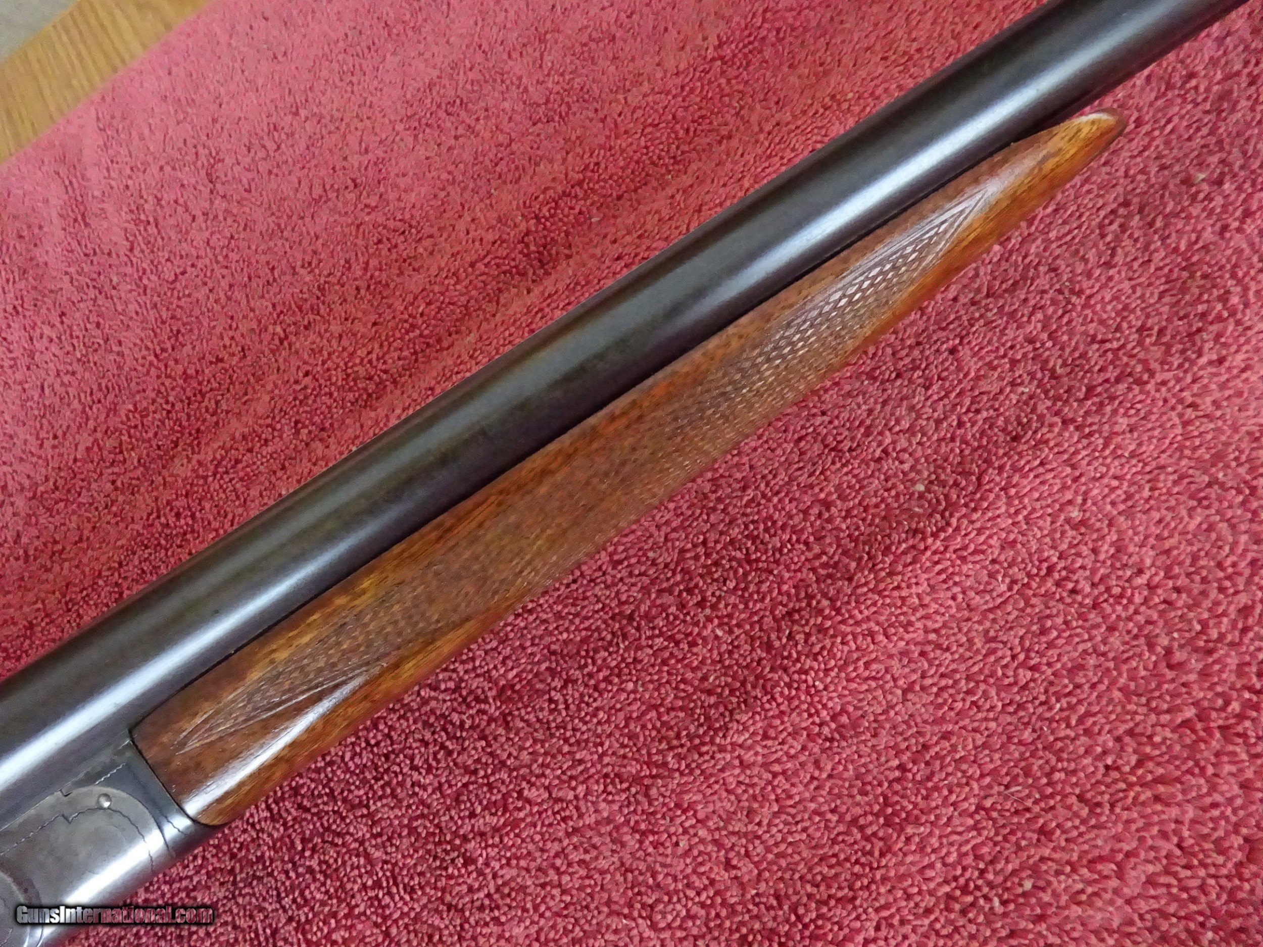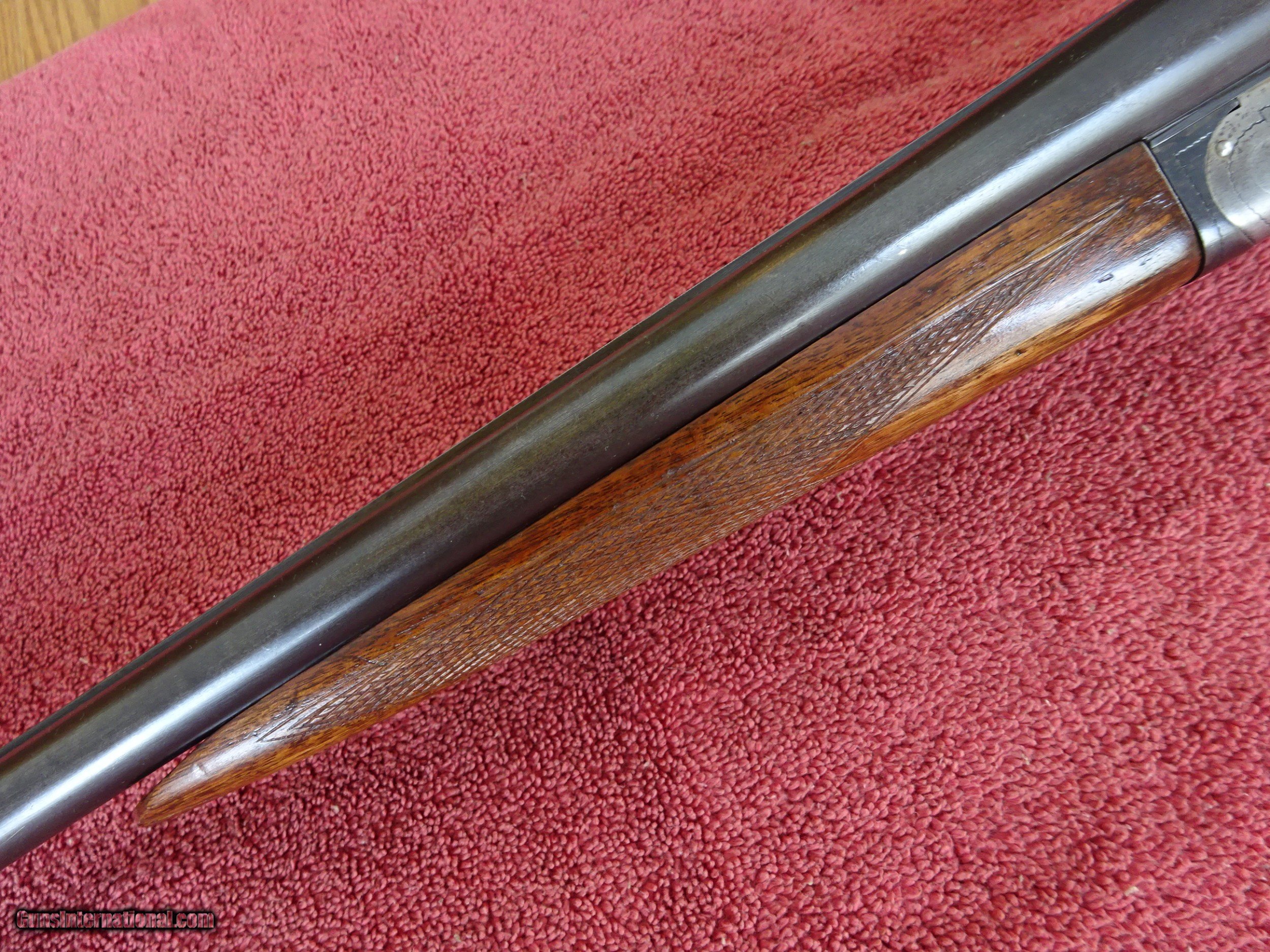 Description: ITHACA, N.I.D., FIELD GRADE 20 GAUGE. 28" BARRELS, MODIFIED AND FULL, 2 3/4" CHAMBERS. VERY GOOD BLUE, MIRROR BRIGHT BORES. VIVID CASE COLOR IN THE PROTECTED AREAS, LINE ENGRAVING WITH STIPPLING AT TOP OF FRAME. TOP LEVER TO THE FAR RIGHT, TIGHT ON FACE. LATER EXAMPLE WITHOUT COCKING INDICATORS. PISTOL GRIP STOCK, SPLINTER FOREARM, VERY GOOD WOOD AND CHECKERING. ORIGINAL GRIP CAP AND BUTTPLATE, 1 3/8" X 2 1/2" X 14", JUST OVER 6 POUNDS. 100% ORIGINAL CONDITION, MADE IN 1936. $1475.00 + $50.00 Insured shipping to an FFL address. See all Pats gun listings on this site! We also have hundreds of pieces of ORIGINAL gun company advertising & memorabilia available for sale on our site SPORTINGCOLLECTIBLES. We have no reprints or reproductions. Email for more information. SOLD |