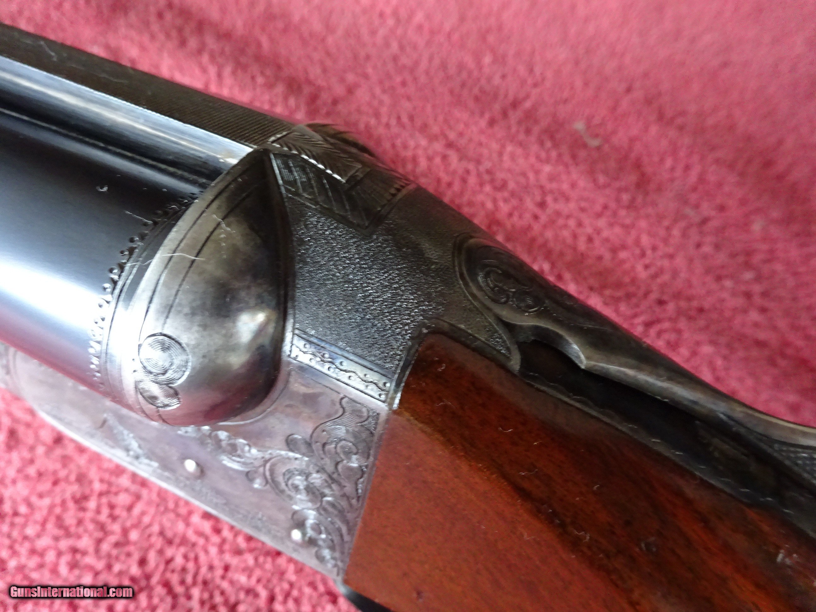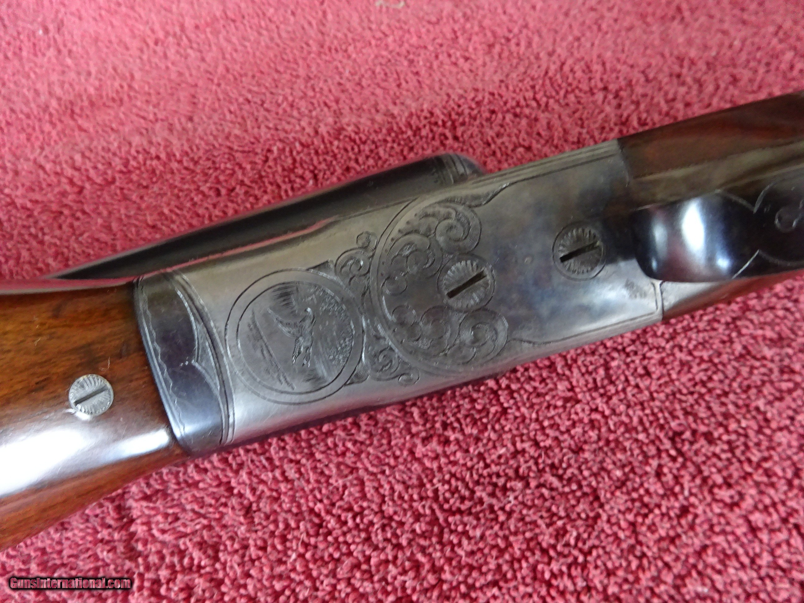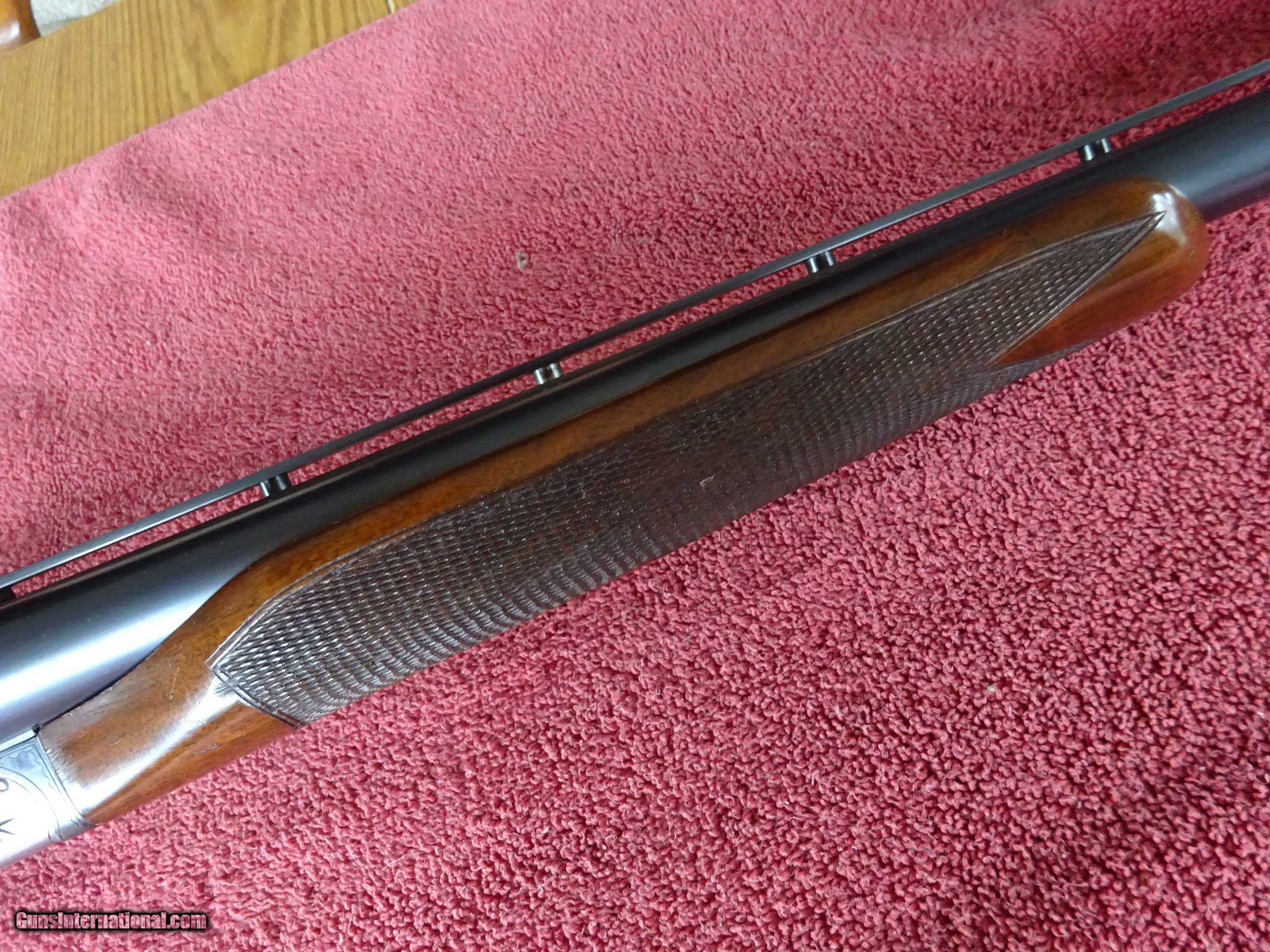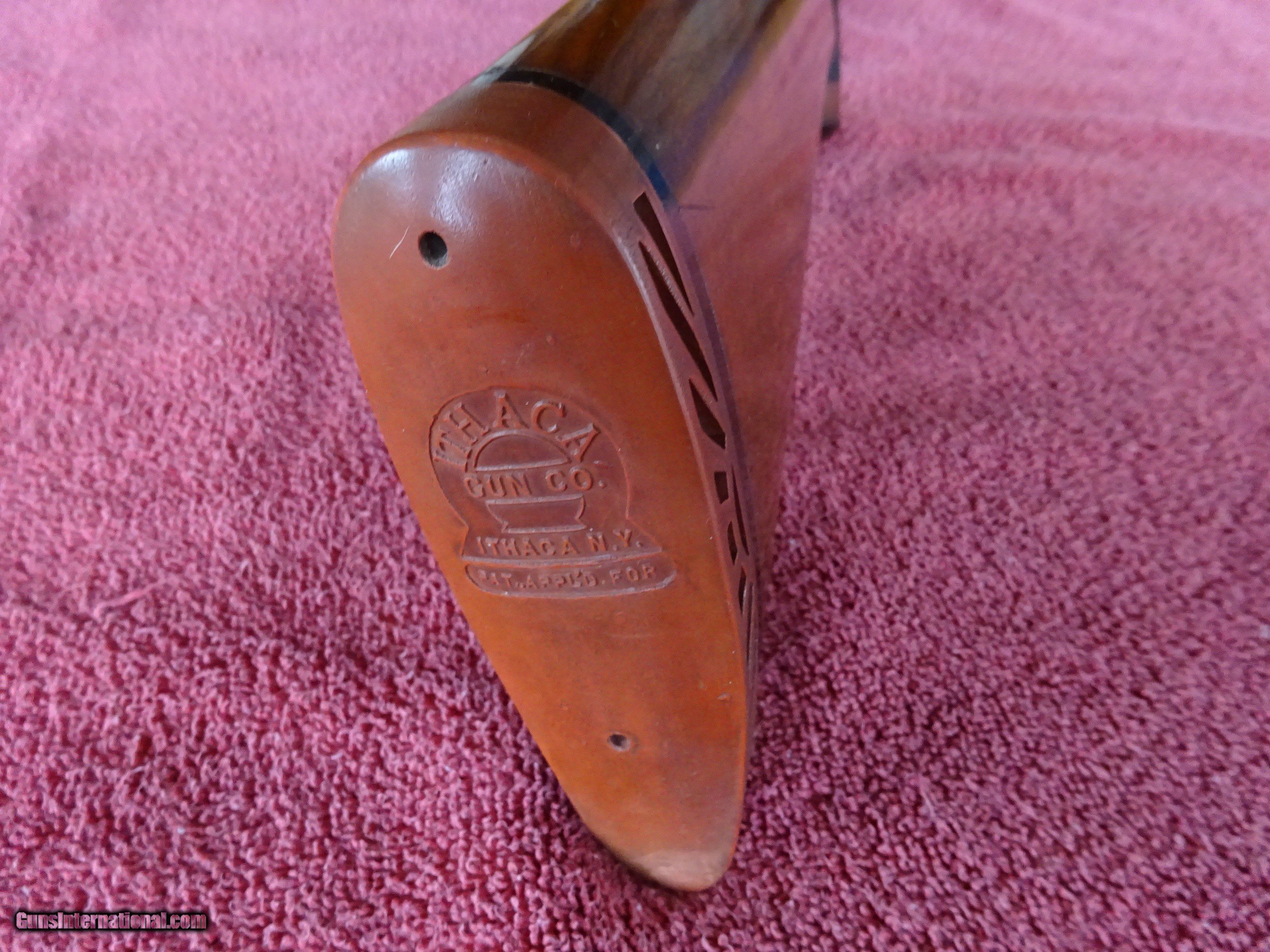 Description: ITHACA NID GRADE THREE 12 GAUGE. 30" VENT RIB BARRELS, FULL (.040) AND FULL (,040), 2 3/4" CHAMBERS. TWIN IVORY SIGHTS ENGRAVED AT BREECH ENDS, EXCELLENT BRIGHT BLUE (98%), AUTOMATIC EJECTORS. BOXLOCK FRAME WITH GOOD CASE COLOR, VIVID IN THE PROTECTED AREAS. TYPICAL ENGRAVING PATTERN, STANDING QUAIL ON RIGHT SIDE, STANDING WOODCOCK ON LEFT SIDE, DUCK IN FLIGHT ON BOTTOM PLUS DEEP CUT ACANTHUS SCROLLWORK, STIPPLING, FINE BORDERS AND ENGRAVED SCREWS. SINGLE NON-SELECTIVE TRIGGER, NON-AUTO SAFETY. TOP LEVER TO THE FAR RIGHT, TIGHT ON FACE. PISTOL GRIP STOCK, BEAVERTAIL FOREARM, NICELY FIGURED AMERICAN WALNUT, FINE CHECKERING. EXCELLENT WOOD FINISH WITH NORMAL HANDLING MARKS. ORIGINAL GRIP CAP AND ITHACA MARKED SUNBURST PAD. EXCELLENT TRIGGERGUARD AND FOREARM IRON BLUE. 1 3/8" X 1 3/4" X 14 3/4", 8 POUNDS 6 OUNCES. WONDERFUL TRAP DOUBLE OR SPORTING CLAYS GUN IN 100% ORIGINAL CONDITION. MADE IN 1927. $3500.00 + $70.00 Insured shipping to an FFL address. Layaway is available. See all Pats gun listings on this site! We also have hundreds of ORIGINAL gun company advertising & memorabilia pieces available for sale on our site SPORTINGCOLLECTIBLES. We have no reprints or reproductions. Email for more information. If you need to call, morning or evening is best, and please note the Seller's Inventory number. SOLD Curio/Relic: Yes |