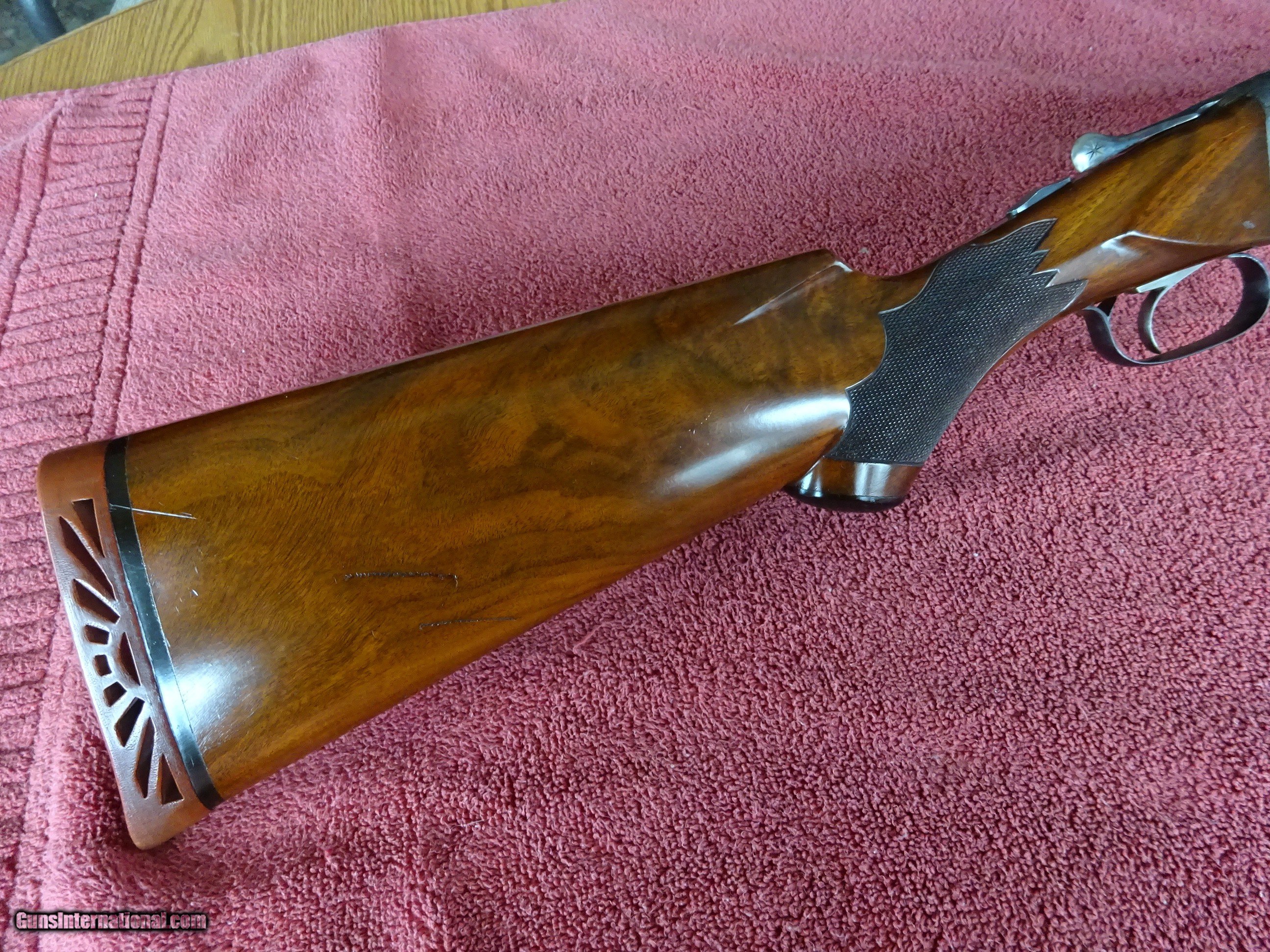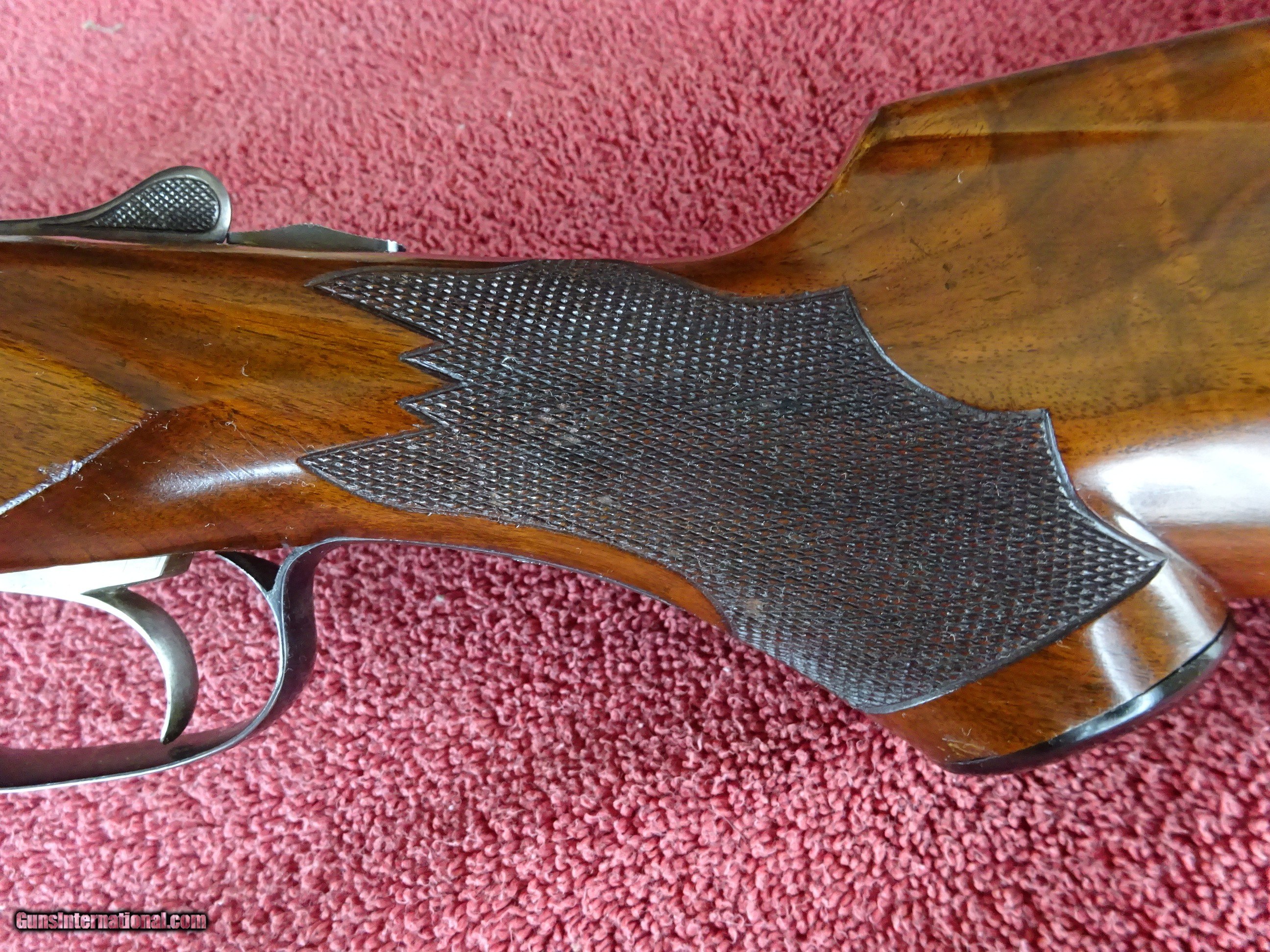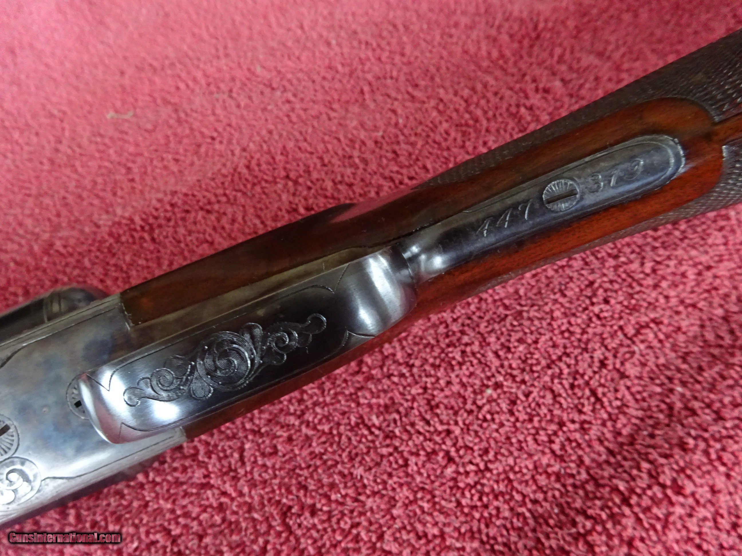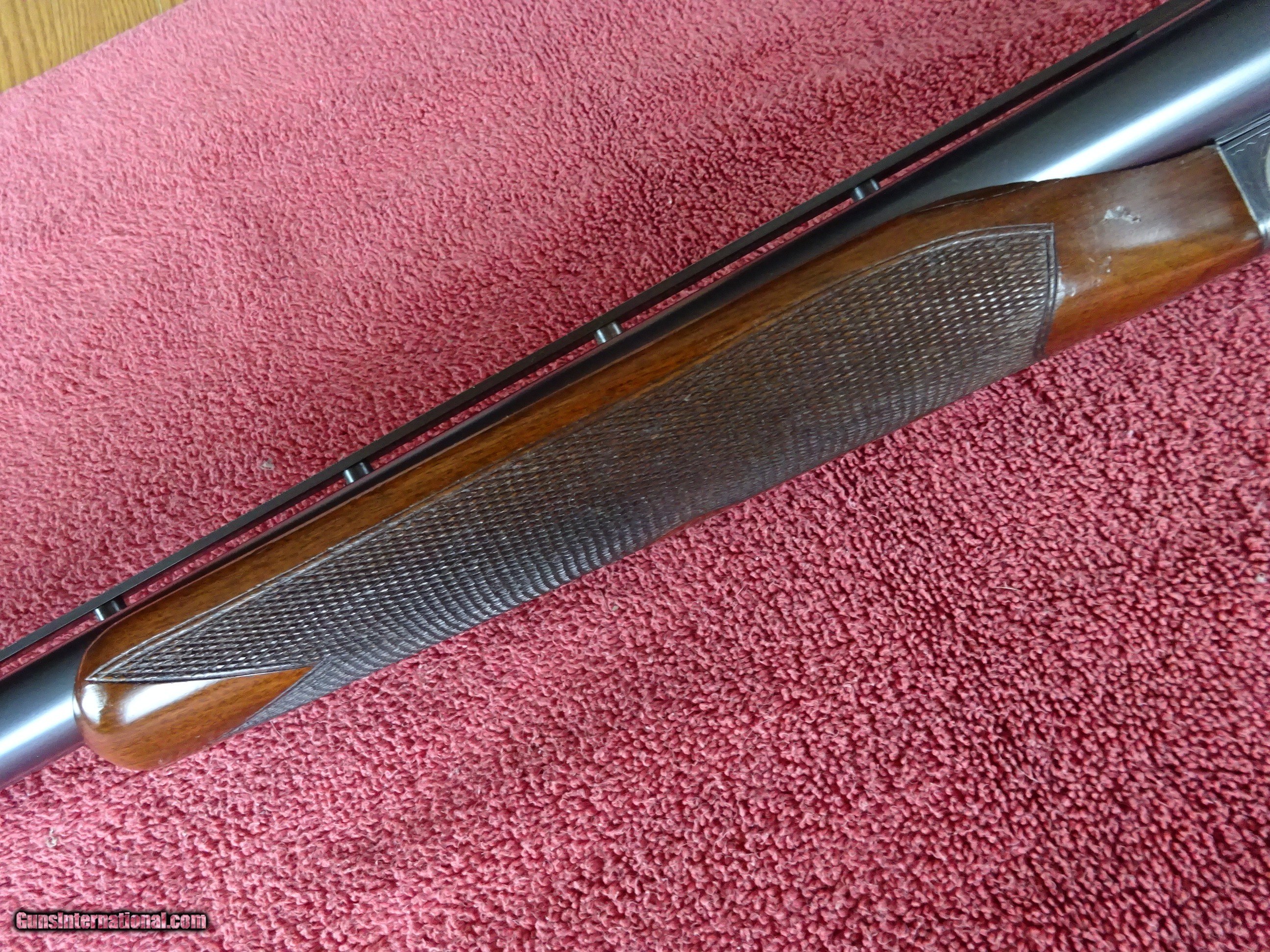 Description: ITHACA NID GRADE THREE 12 GAUGE. 30" VENT RIB BARRELS, FULL (.040) AND FULL (,040), 2 3/4" CHAMBERS. TWIN IVORY SIGHTS ENGRAVED AT BREECH ENDS, EXCELLENT BRIGHT BLUE (98%), AUTOMATIC EJECTORS. BOXLOCK FRAME WITH GOOD CASE COLOR, VIVID IN THE PROTECTED AREAS. TYPICAL ENGRAVING PATTERN, STANDING QUAIL ON RIGHT SIDE, STANDING WOODCOCK ON LEFT SIDE, DUCK IN FLIGHT ON BOTTOM PLUS DEEP CUT ACANTHUS SCROLLWORK, STIPPLING, FINE BORDERS AND ENGRAVED SCREWS. SINGLE NON-SELECTIVE TRIGGER, NON-AUTO SAFETY. TOP LEVER TO THE FAR RIGHT, TIGHT ON FACE. PISTOL GRIP STOCK, BEAVERTAIL FOREARM, NICELY FIGURED AMERICAN WALNUT, FINE CHECKERING. EXCELLENT WOOD FINISH WITH NORMAL HANDLING MARKS. ORIGINAL GRIP CAP AND ITHACA MARKED SUNBURST PAD. EXCELLENT TRIGGERGUARD AND FOREARM IRON BLUE. 1 3/8" X 1 3/4" X 14 3/4", 8 POUNDS 6 OUNCES. WONDERFUL TRAP DOUBLE OR SPORTING CLAYS GUN IN 100% ORIGINAL CONDITION. MADE IN 1927. $3500.00 + $70.00 Insured shipping to an FFL address. Layaway is available. See all Pats gun listings on this site! We also have hundreds of ORIGINAL gun company advertising & memorabilia pieces available for sale on our site SPORTINGCOLLECTIBLES. We have no reprints or reproductions. Email for more information. If you need to call, morning or evening is best, and please note the Seller's Inventory number. SOLD Curio/Relic: Yes |