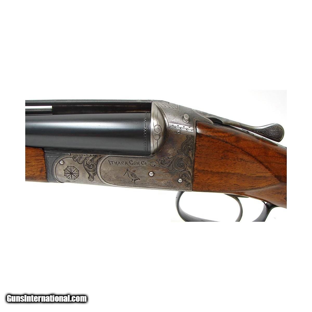 Description: "Ithaca Side By Side 20 gauge shotgun. 3E grade, serial number 443XXX. Factory vent rib. 30"" barrels. Length of pull is 13 1/4"" over a Hawkins pad. Single trigger (selects on safety). Left barrel safety all the way down, right barrel all the way up. Safety in the middle. Has auto ejectors, Beavertail and vent rib barrel. Barrels are 30"". Stock is very good plus with sharp checkering (crisper on the pistol grip than the forend.) Barrels have 98-99% blue. Excellent bores and gun opens and closes tight. Hard to find 20 gauge 3E with rib. SOLD |