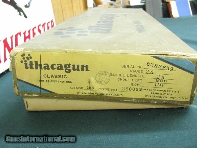 Description: 7188 Ithaca 280 20 gauge 25 inch barrels,2 3/4 &3 inch chambers, ic/m, sxs,Gold single select trigger, ejectors,straight grip,Ihaca butt plate, scalloped receiver, beavertail,raised rib, 99% AS NEW IN BOX, TIME CAPSULE SURVIVOR.ENGRAVED GAME BIRDS ON RECEIVER. SOLD Shotgun Gauge: 20 Gauge |