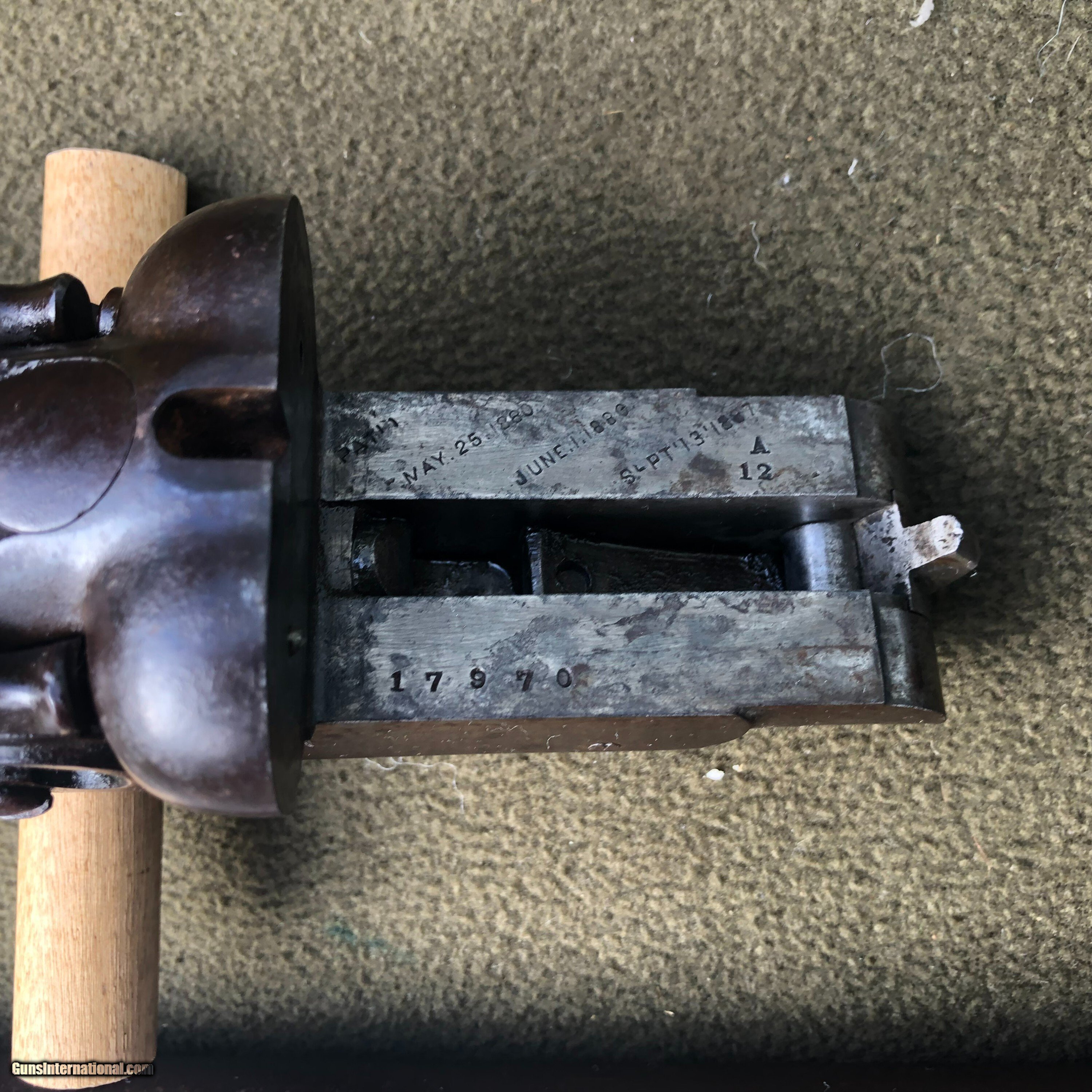 Description: ANTIQUE ITHACA 12ga. SXS w/DOUBLE HAMMERS AND TRIGGERS DAMACUS BARREL MATCHING NUMBERS.DEEP BROWN PATINA ON THE METAL.ACTION WORKS CORRECTLY LEVER WORKS CORRECTLY .METAL AND BORES ARE USABLE BUT NEED CLEANING. WOOD IS SOLID WITH WEAR APPROPRIATE FOR ITS AGE 1880'S.MINOR DING ON THE LEFT BARREL. OLD BRASS BRAZE REPAIR TO THE BARREL LOCK ..OVERSIZED AND HEAVY SHIPPING MAY COST MORE. ANOTHER ITEM FROM THE COLLECTOR'S ESTATE. ONE OF SEVERAL ANTIQUE SXS I HAVE LISTED ALWAYS OPEN TO OFFERS ON MULTIPLE BUYS SOLD Antique: Yes Shotgun Gauge: 12 Gauge |