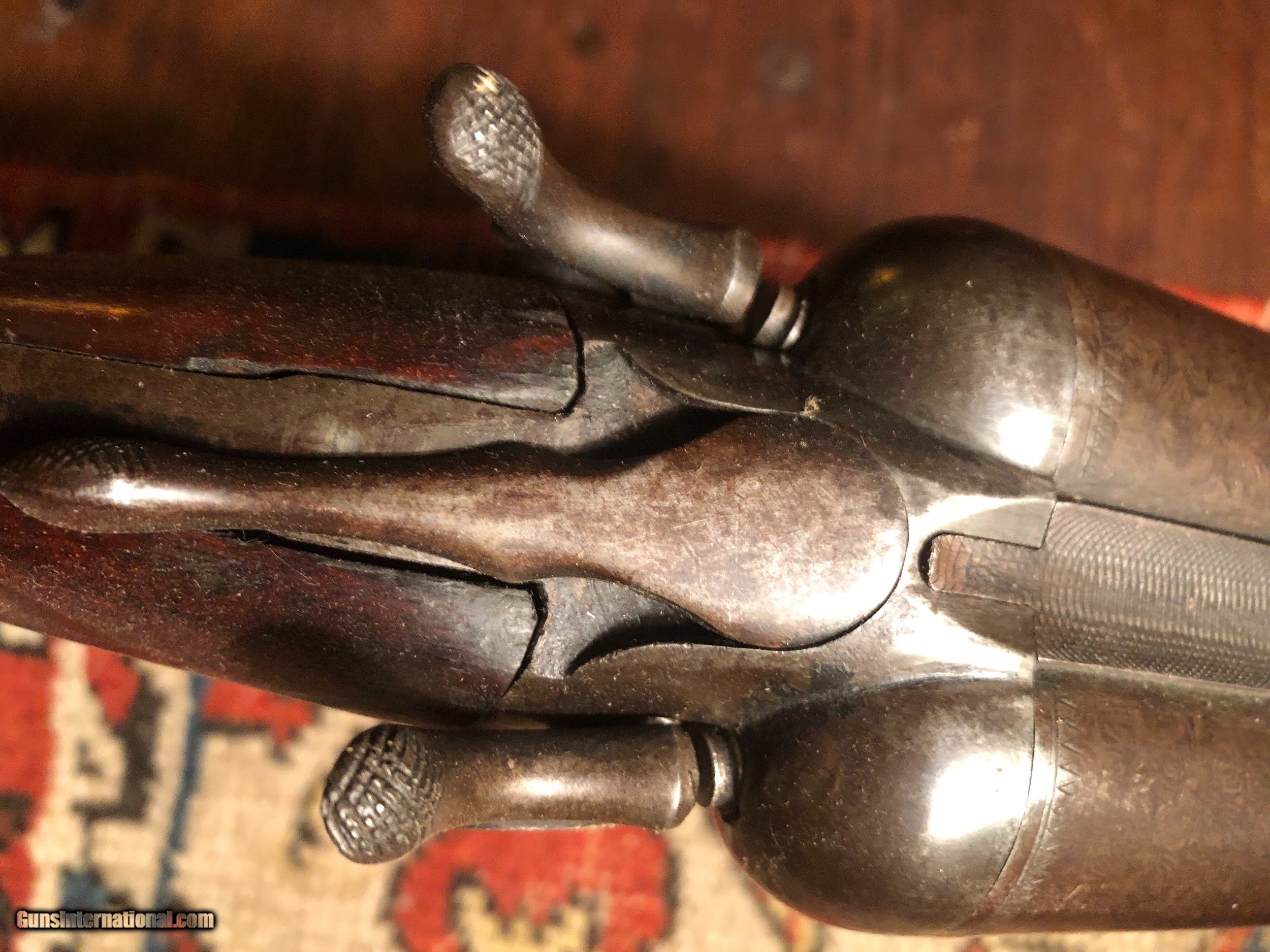 Description: Very rare Ithica hammer gun built on a 10 Ga frame, the barrels are massive, 3/8ths at the breech, bores are great, locks up good, locks wor perfect, some brain trust rewelded the forearm iron and did a sloppy job, it is sound, and is hidden with the forearm on, I have shot this gun with low pressure RST shells, seems to work fine. You must shoot this gun at your own risk, it is a really beautiful and interesting gun! SOLD Antique: Yes |