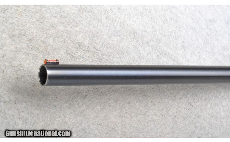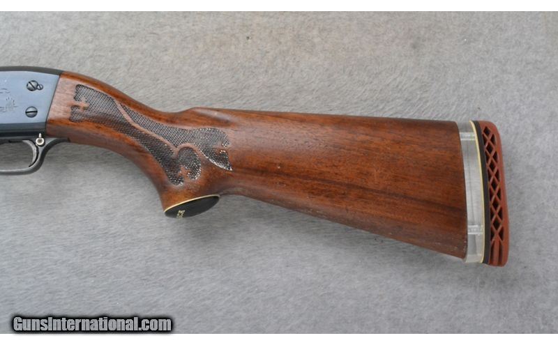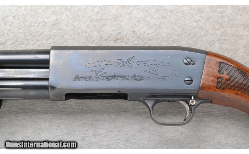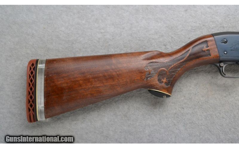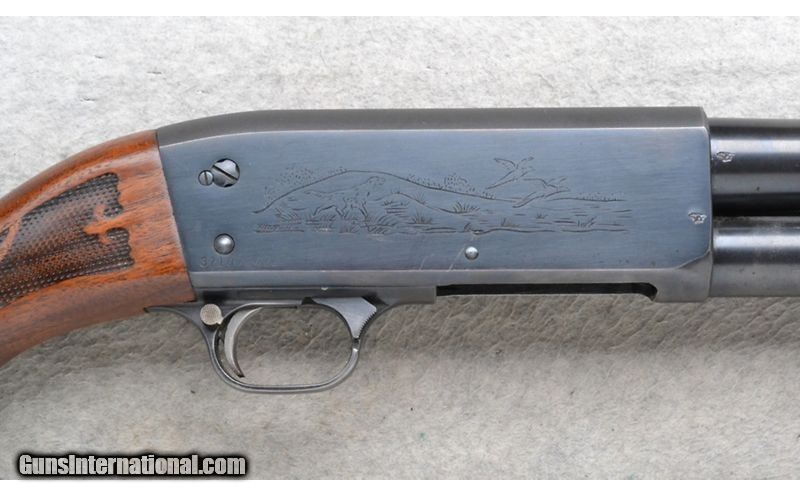 Description: This Ithaca Model 37 Featherlight is a right hand pump action shotgun in 12 Ga. It has a 30 inch barrel with a red high visibility front sight. With a 2 3/4 inch chamber it has a fixed Full choke. The butt stock is a checkered grip walnut pistol grip with a black cap. The forearm is a checkered grip walnut. The receiver is nicely engraved with ducks and pheasants in flight in an outdoor scene. 12 Gauge SOLD Chambers: 2 3/4 inch. Metal Condition: Fair. Has some minor freckling and use marks. Wood Condition: Good. Some light handling marks. Bore Condition: Bright and shiny. Barrels: 30 inch. Stock Dimensions: LOP 14 1/4 inches with a clear plastic spaced added. Fore End: Checkered grip walnut. Butt Pad: Ithaca red rubber recoil pad. Weight: 6 lb. 12 oz. Sights: Red high visibility front. Chokes: Fixed Full. Item Location: Richfield, WI |