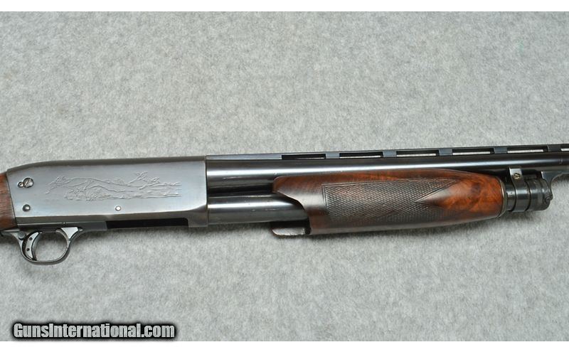 Description: This shotgun features the classic Ithaca 37 bottom-ejecting pump action mechanism with a rich blued finish, game-scene engraving, press-checkered walnut furniture, and easy takedown for transport and storage. The shotgun is in excellent working order with a full action and nice bores on barrel. Some finish wear and handling marks can be seen on the walnut stock, and it has a broken fore end stock. 12 Gauge SOLD Metal Condition: Very Good Wood Condition: Good with broken fore end Bore Condition: Very Good Barrels: 28" Vented Rib Butt Pad: Rubber Weight: 7 lb - 7 oz Sights: Metal bead front sight. Chokes: Full Item Location: League City, TX |