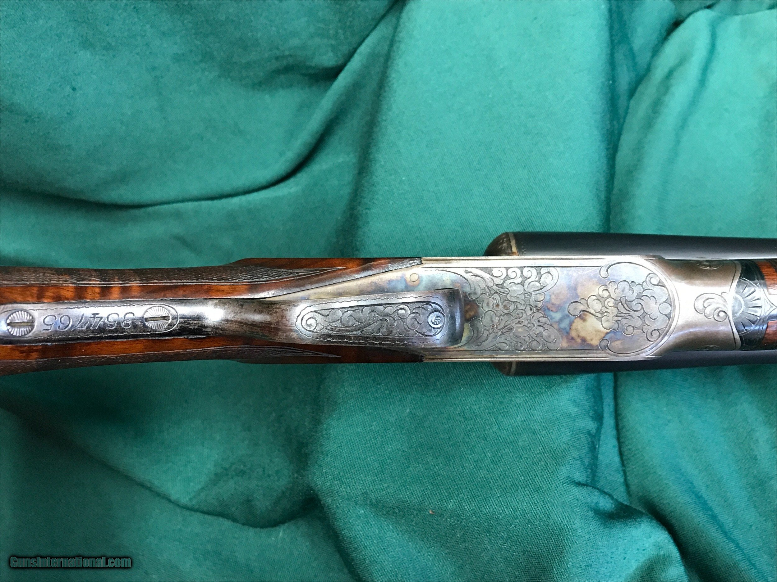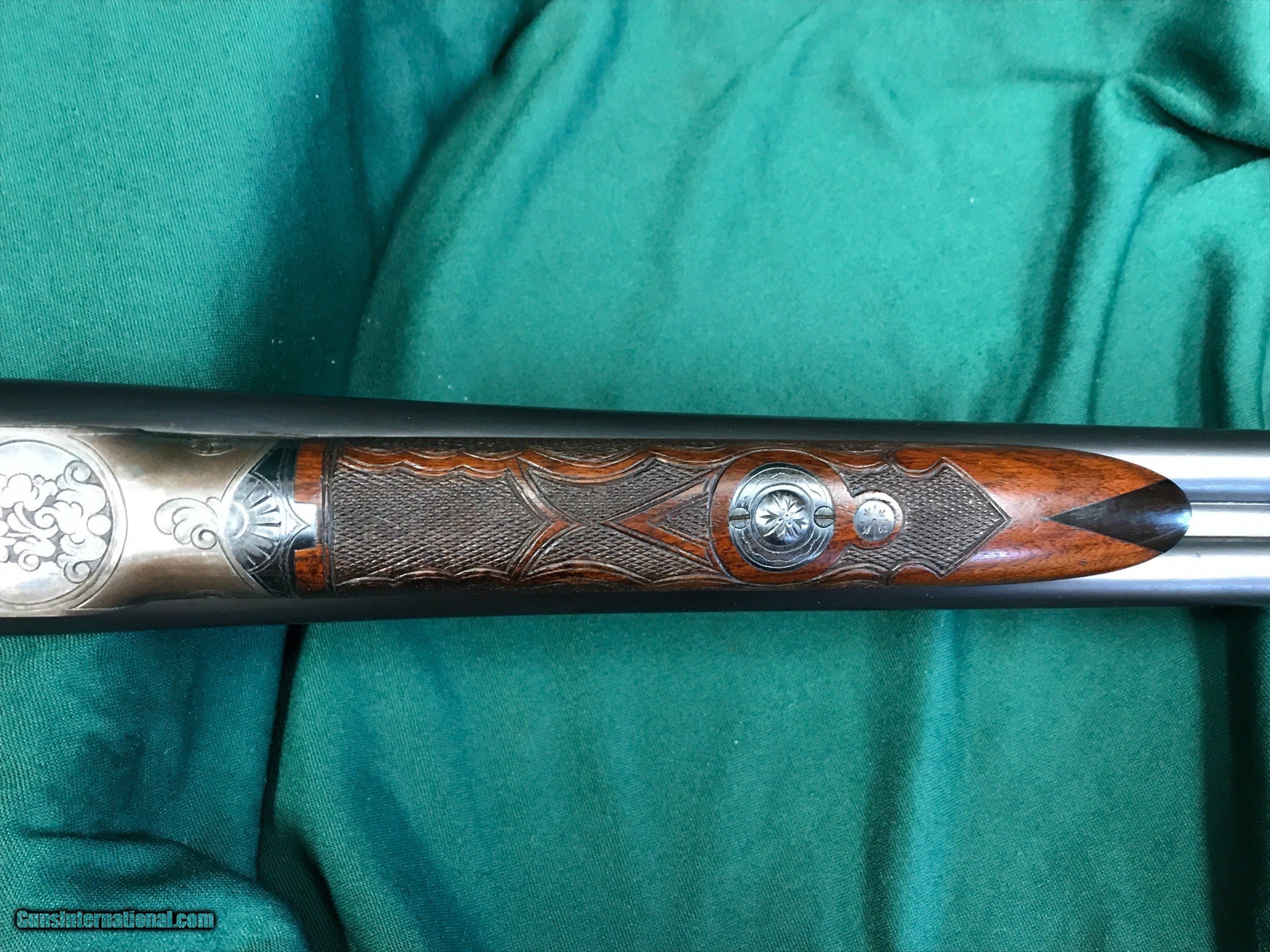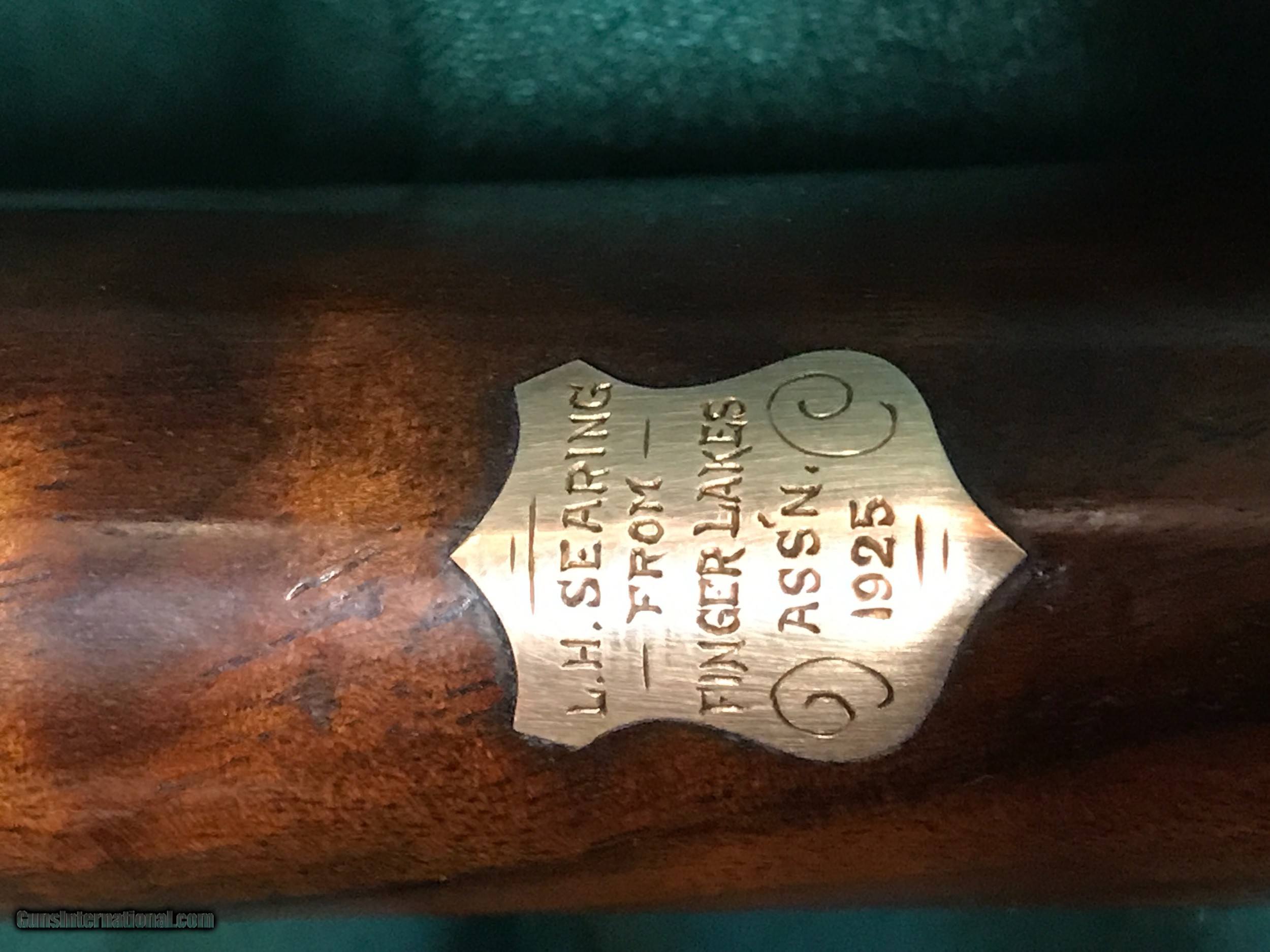 Description: We have Ithaca Flues 16 Ga Grade 4E , it features 28'' barrels that are choked I/M - I/M .023-.023 , Ejectors , Double Gold Triggers , there are no dents in or on the barrels , the checkering is sharp , the wood is flawless with no cracks or splits , the inscription on the gold shield states "L.H.Searing Finger Lakes Assn 1925 " the barrels and receiver have nearly all the original case colors and rust bluing left . The gun was completed during 1922 and was purchased by Leonard Searing who was a life long resident of Auburn , New York . He was the founding president of The Finger Lakes Association, which was , and still is the the official tourism agency of the Finger Lakes . Later Mr. Searing was a Surrogate Judge for the state of New York . The gun was featured in the Autumn 2013 Double Gun Journal , it also comes with a factory letter from Walt Snyder auther of ' Ithaca Gun Company From the Beginning' the new owner will get a copy of each . More pictures can be had on request , please call or e-mail with questions 607-539-6271 607-227-4088 , Thank you Brian Hunt SOLD Curio/Relic: Yes Manufacturer: Ithaca Model: Flues Ejectors: yes Condition: very good Metal Condition: very good Wood Condition: very good Bore Condition: very good Barrels: 28 Gauge Info: 16 Stock Comb: 1 7/8 Stock Heel: 2 7/8 Stock Cast: none Choke Left: .023 Choke Right: .023 |