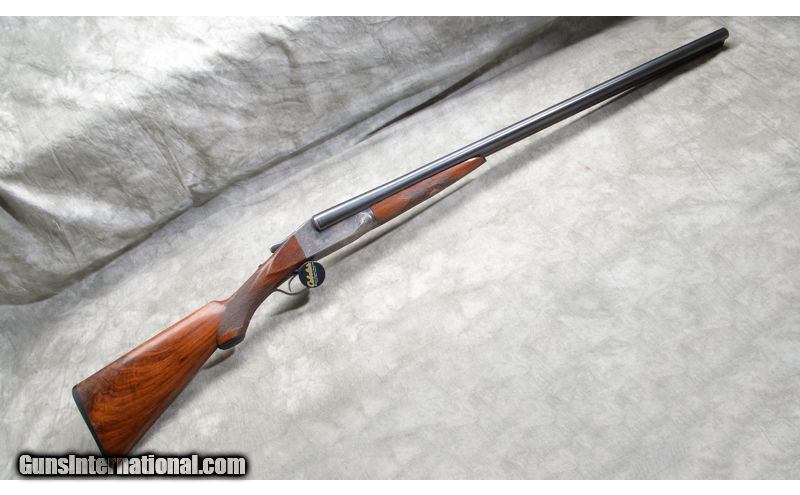 Description: This classic Flues features heavily figured stock wood, good color in the metal, and sharp engraving. 16 Gauge SOLD Metal Condition: Very good. Some fading of the finish near the muzzle and in the receiver. A couple of shallow scratches. Wood Condition: "Good overall. Quite a number of shallow scratches. There are cracks running from receiver top, parallel to top tang and also on the fore-end from the receiver. Barrels: 28 Inch - Blued. Triggers: Double trigger. Stock Dimensions: 14 - 1/8 Inch LOP to front trigger; DAC: 2-1/8 inches; DAH: 2-5/8 inches. Fore End: Matching walnut splinter with black tip. Butt Pad: Black plate. Sights: Matte solid rib with gold forebead. Chokes: Fixed full and full. Item Location: Rogers |