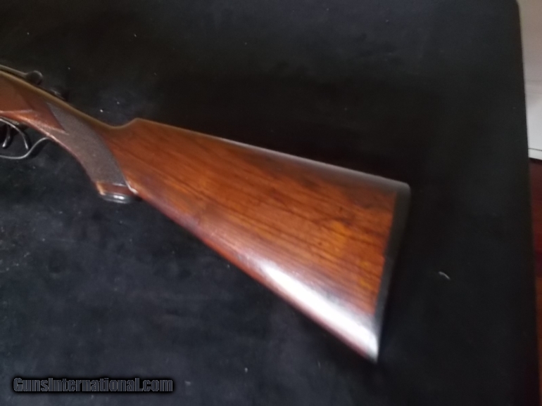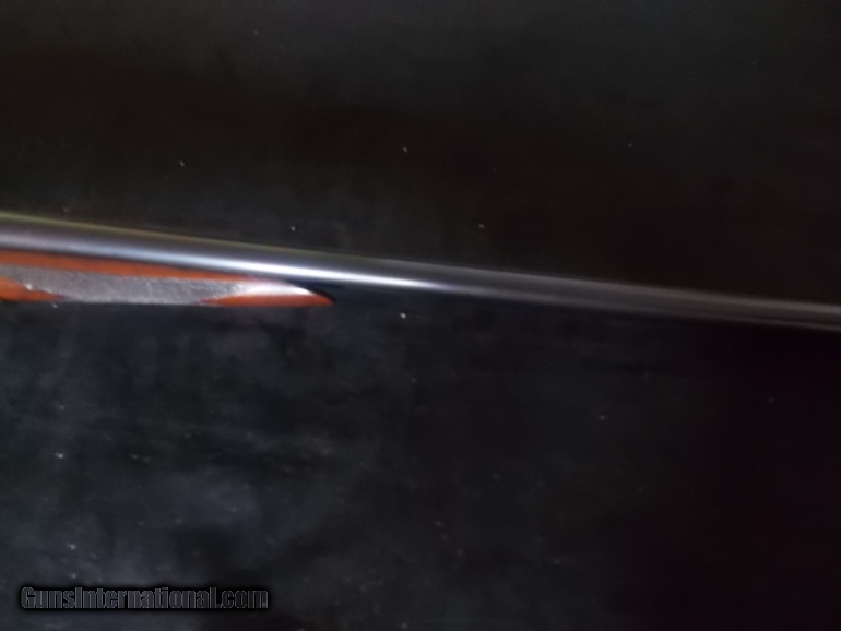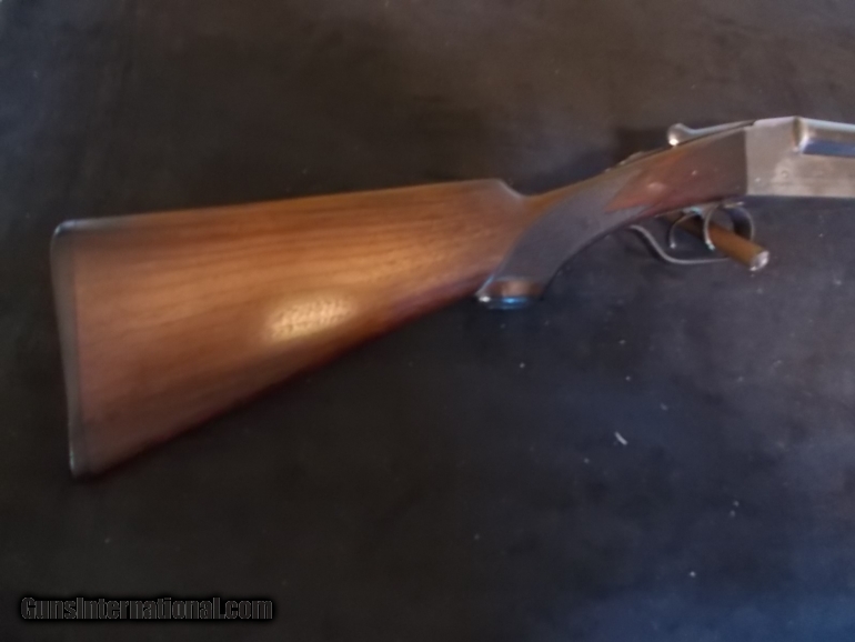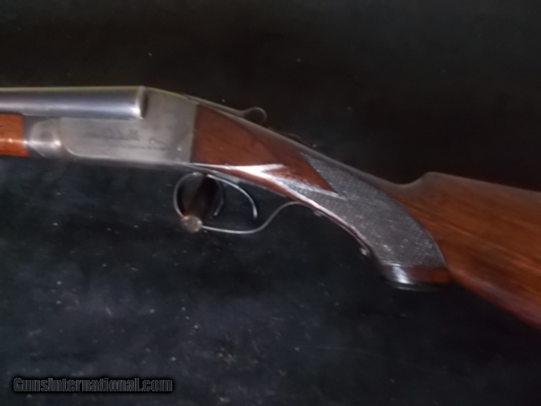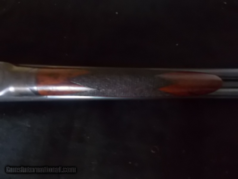 Description: 26" bbls. choked F/IM, Churchill rib, Dt's, ext., engraved pointing Irish setters on rich orig. case colored receiver, deluxe oil finished , hand checkered American walnut, stock & forearm, 14 1/4" LOP over factory buttplate, 1 7/8" Dac - 3 1/2" DAH, 5 lbs., 2 ozs., (ALL Original Condition), 98% blue, 90% CC, modest handling SOLD |