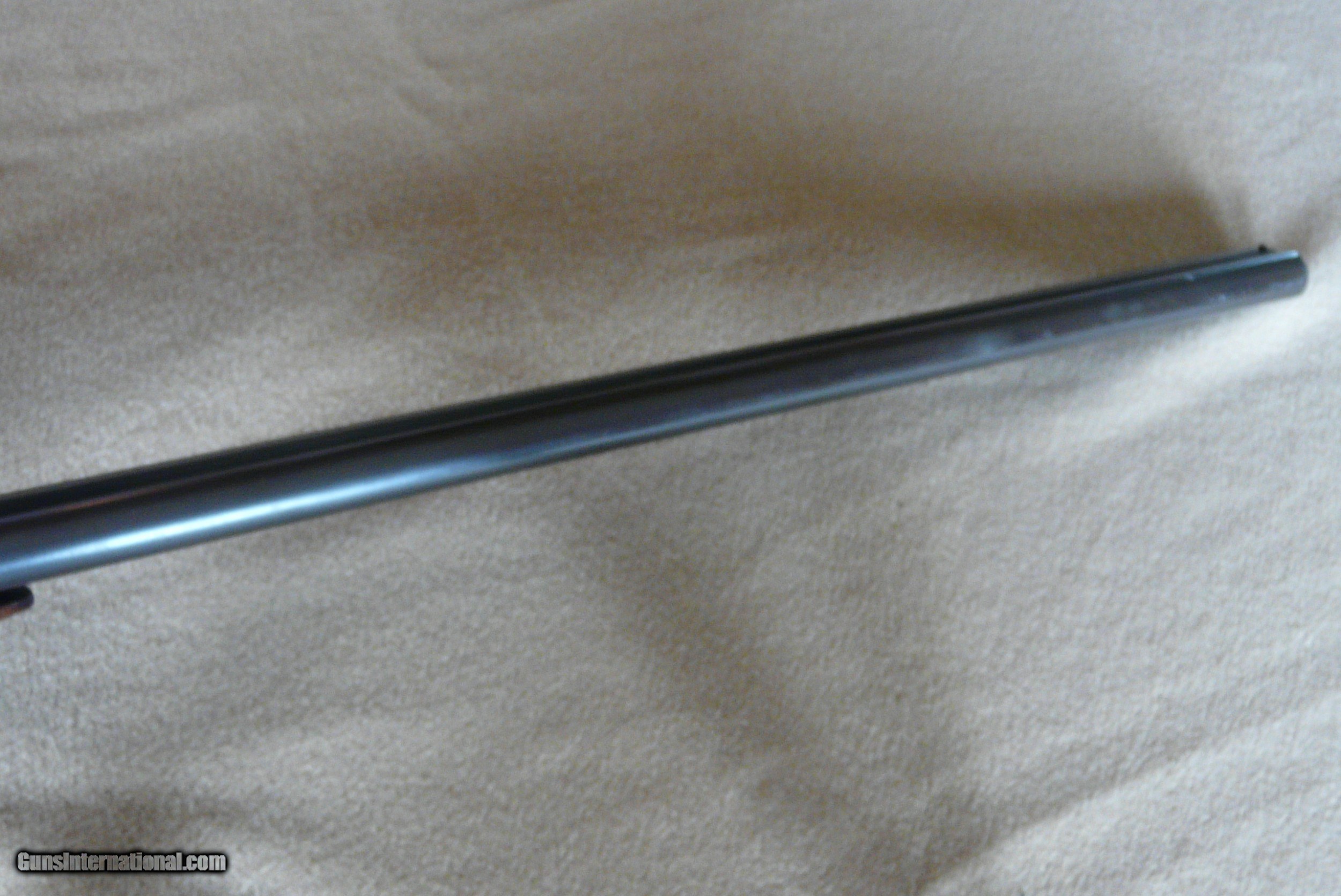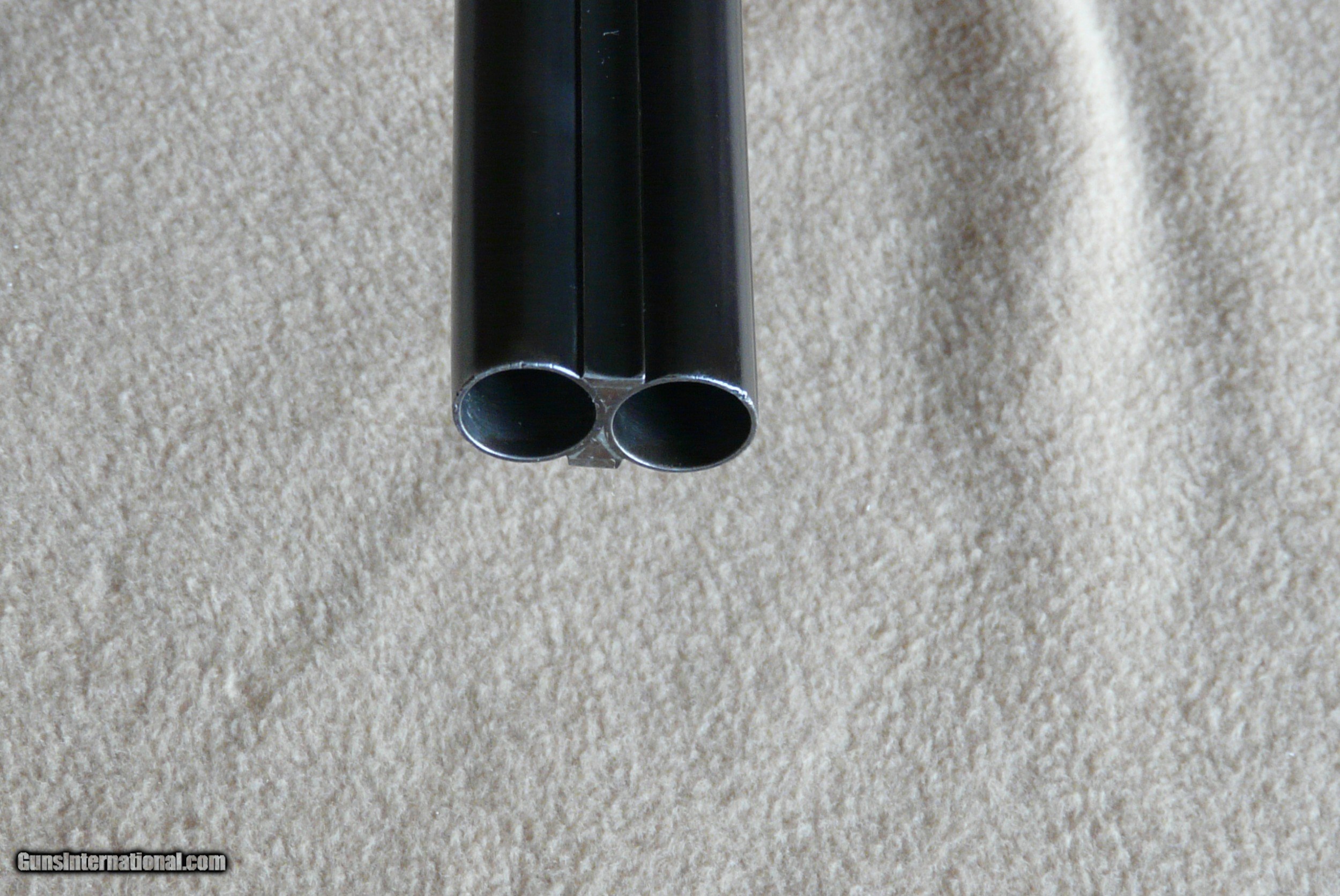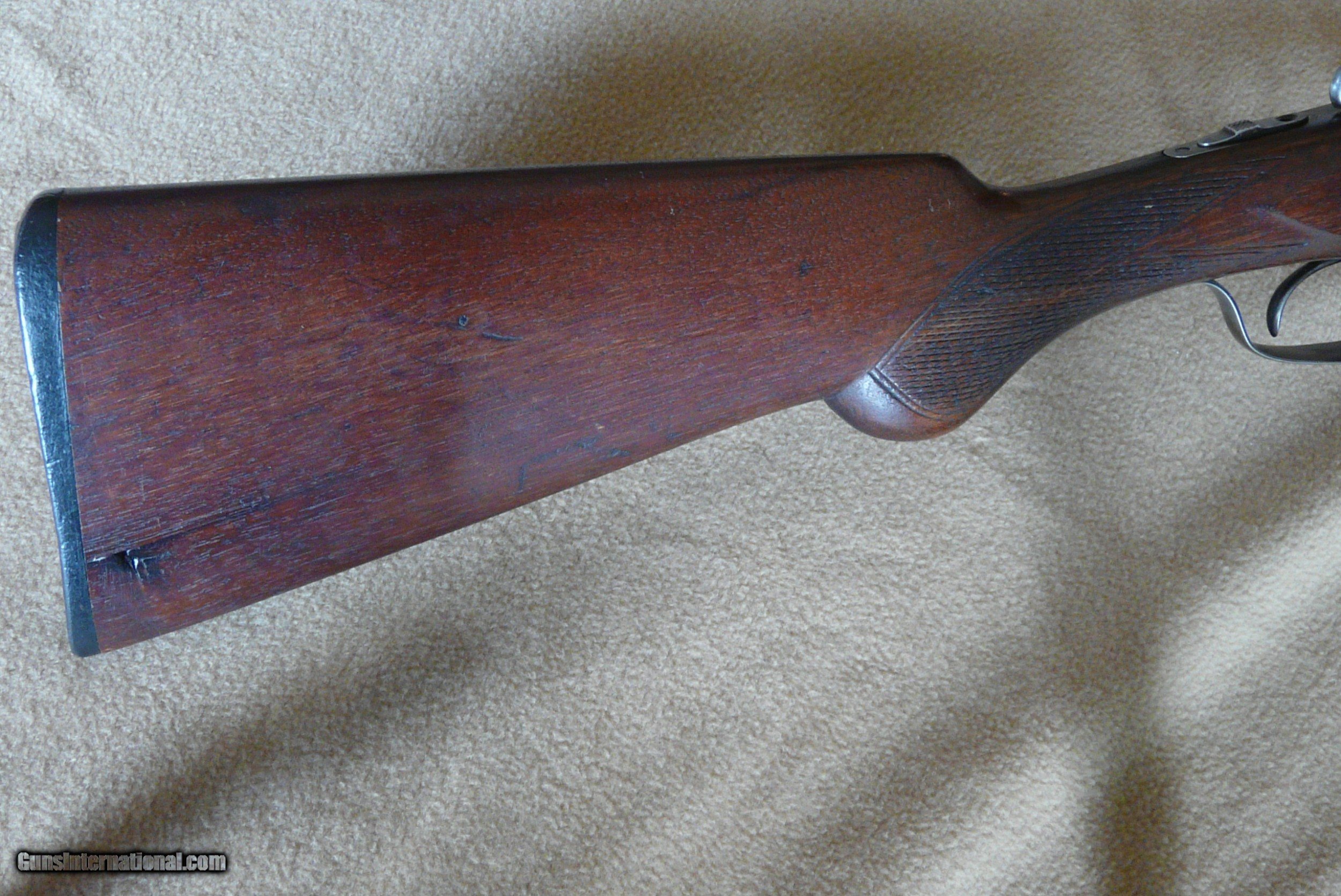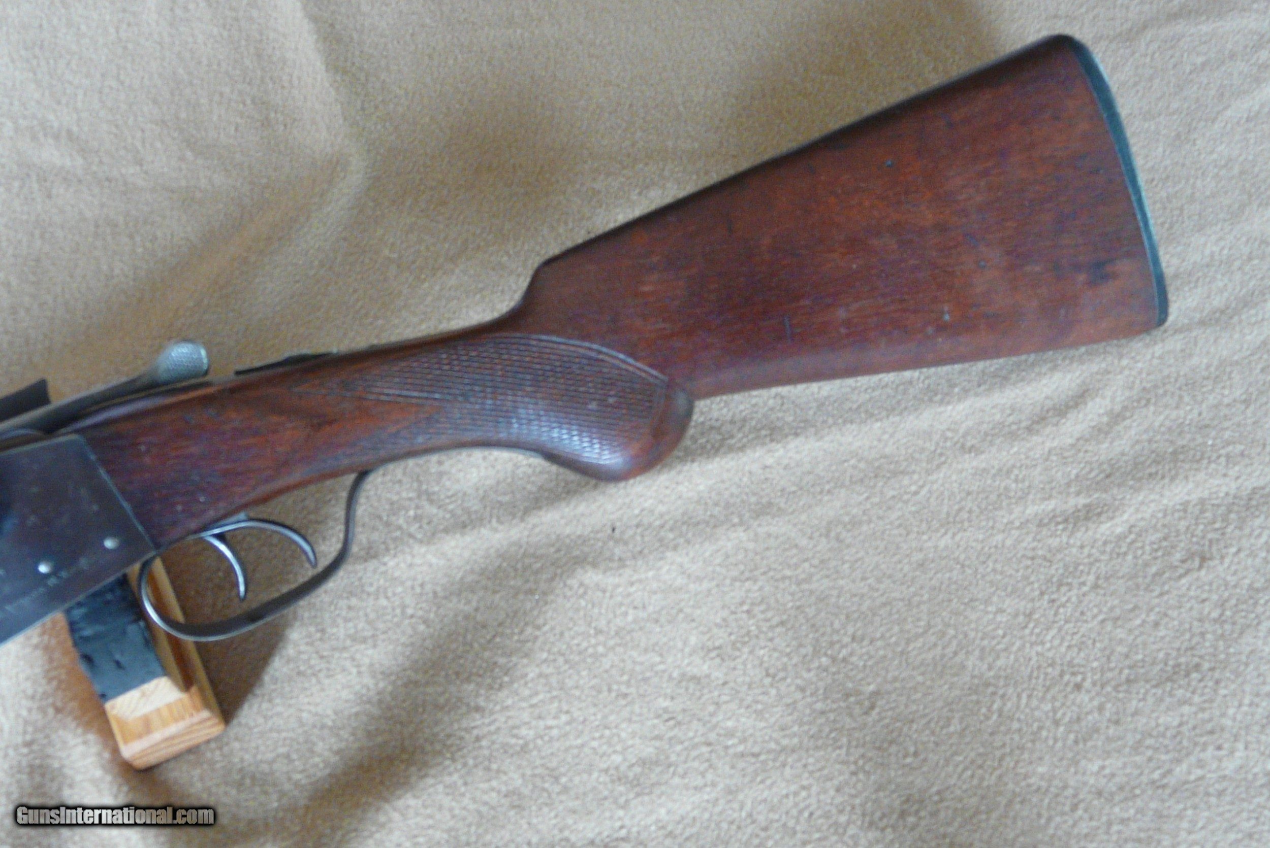 Description: This has 28" Barrel choked FULL & Imp Mod, 2 3/4" chambers and very sound wood no cracks, but a small knot hole on right side rear (in pic)! Gun is tight to face and Ex mechanical condition, double triggers & extractors, Measures 1 3/4" DAC and 2 7/8" DAH, Barrel blue is 90%, frame is mostly gray brown, very solid tight gun for beginner! SOLD |