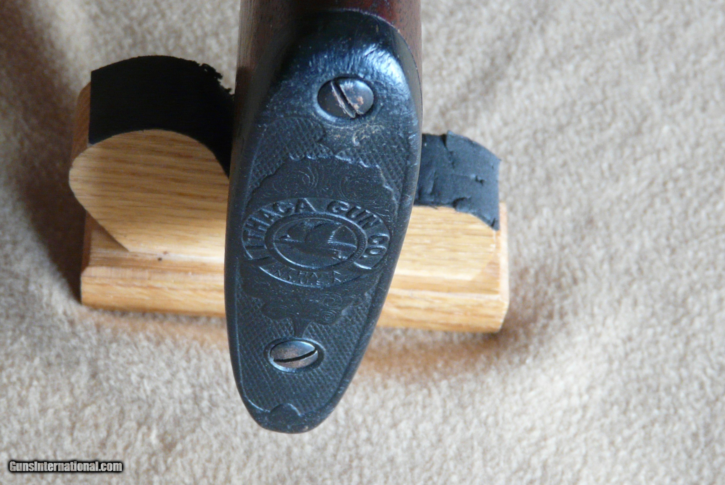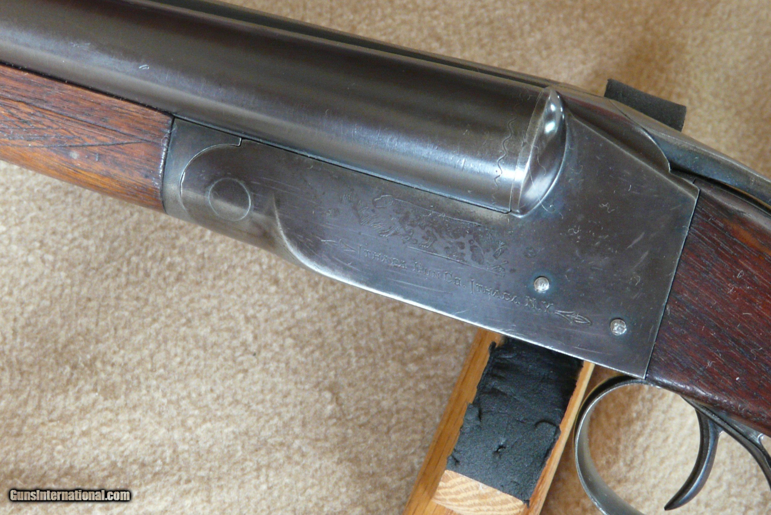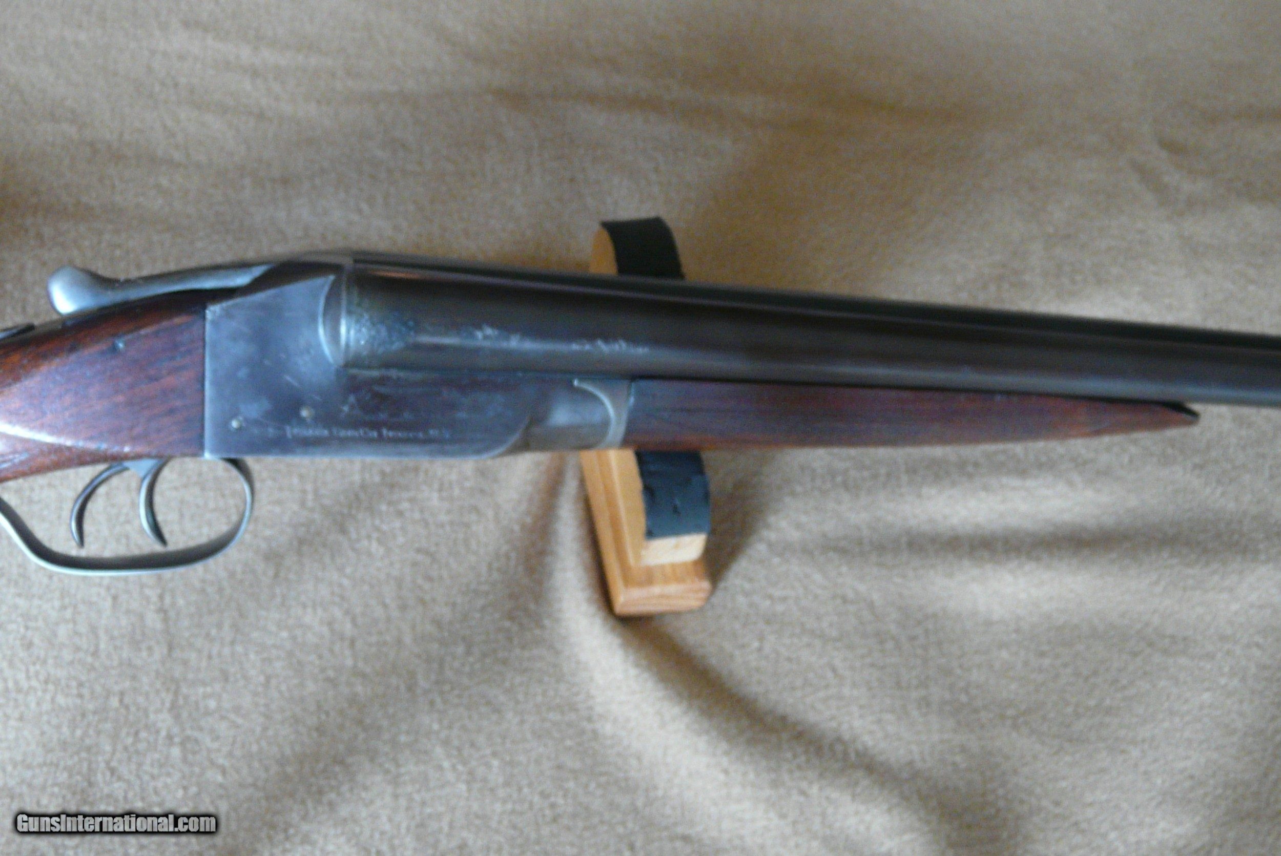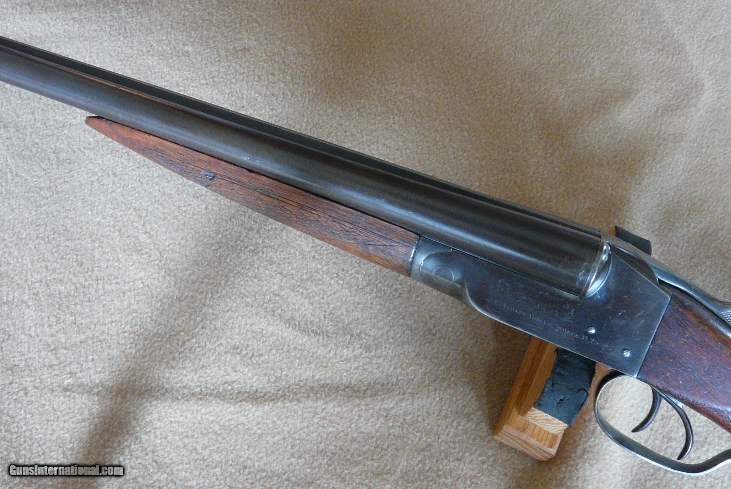 Description: This has 28" Barrel choked FULL & Imp Mod, 2 3/4" chambers and very sound wood no cracks, but a small knot hole on right side rear (in pic)! Gun is tight to face and Ex mechanical condition, double triggers & extractors, Measures 1 3/4" DAC and 2 7/8" DAH, Barrel blue is 90%, frame is mostly gray brown, very solid tight gun for beginner! SOLD |