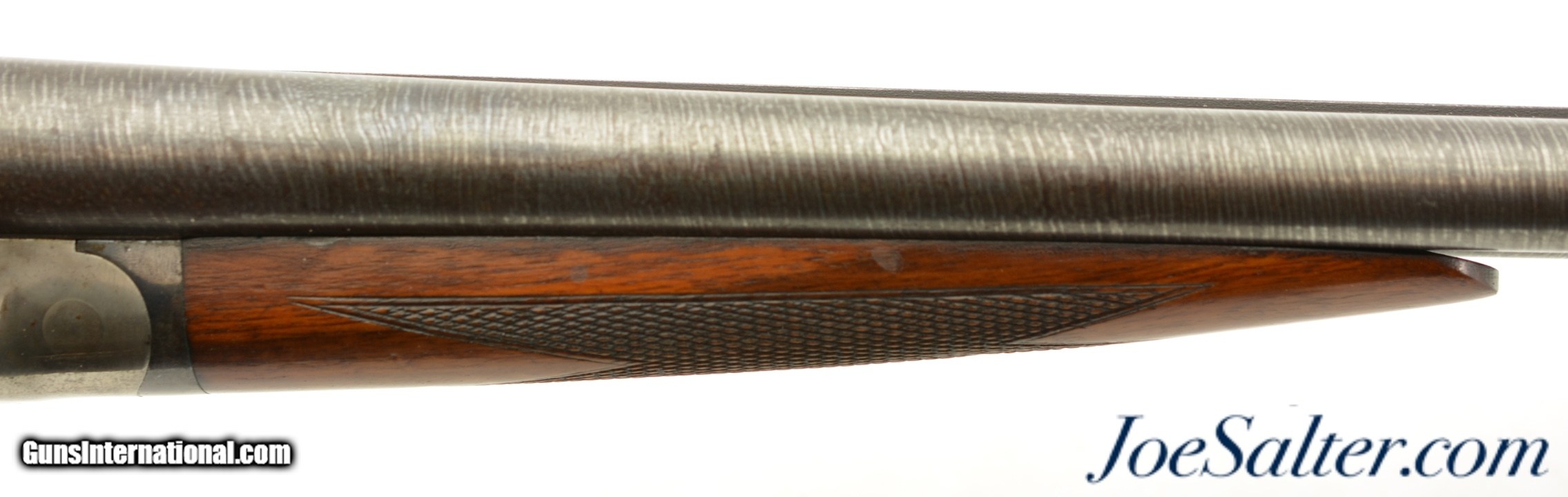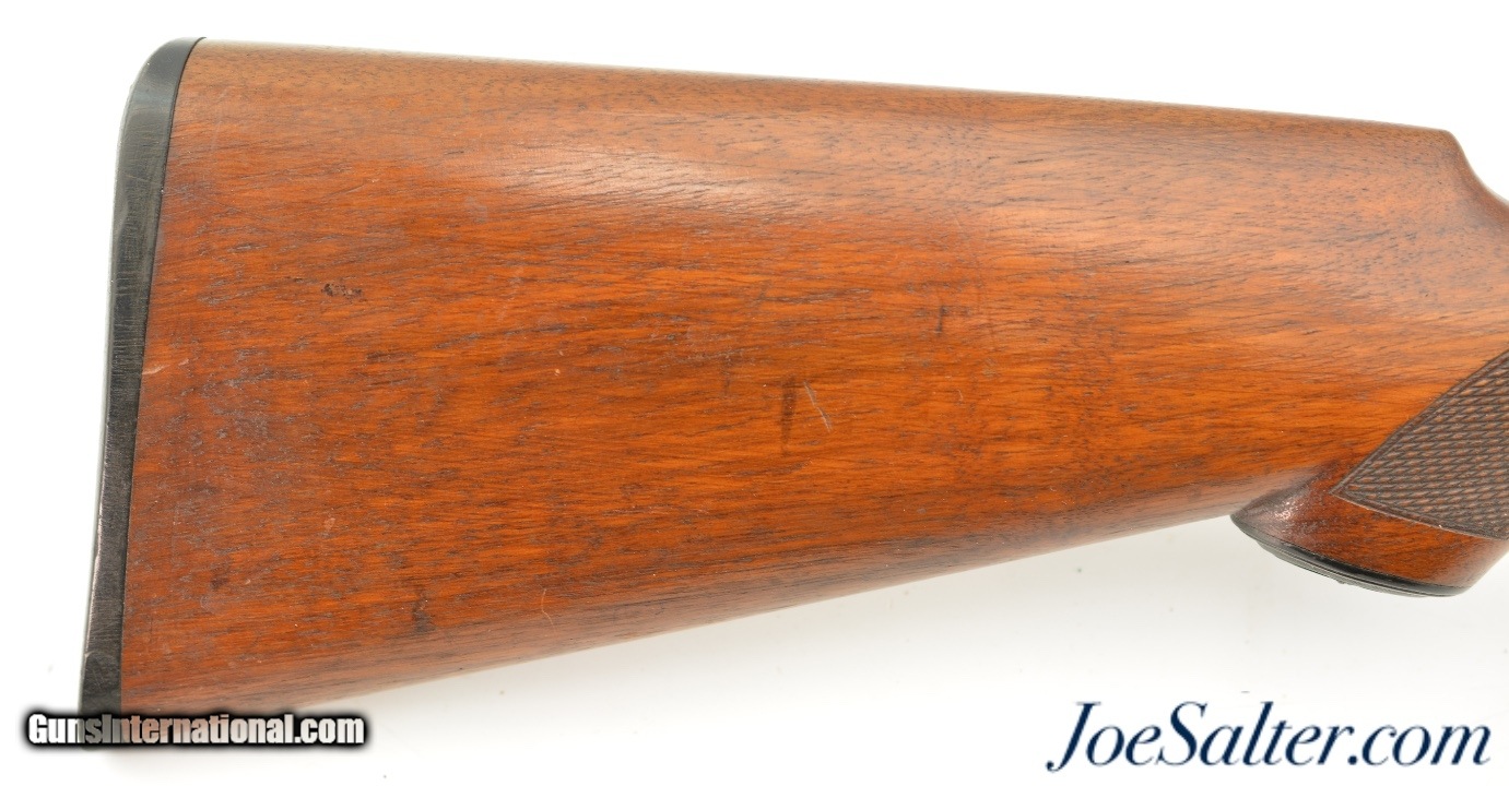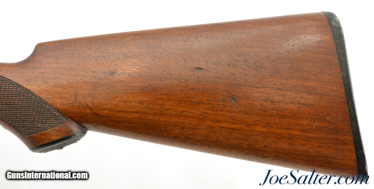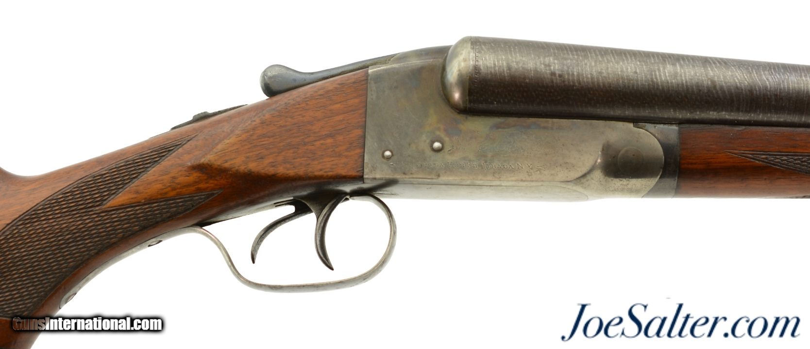 Description: Serial #209141, 12 Gauge (2 3/4" chambers), 30 inch Damascus barrels with bright, excellent bores showing a repaired dent on the left tube about half way choked Improved cylinder and full. This is an Ithaca Flues model side by side shotgun manufactured in 1910 and equipped with factory ordered Damascus barrels which was an optional purchase available for this model as most were built with Krupp fluid steel. In excellent condition the barrels show very detailed Damascus pattern with the noted repair and one small dent with some carbon staining. The receiver shows perhaps 30-35% of the original vibrant case-colors. The checkered stock and forearm rate about excellent with only minor blemishes and contusions. The original Ithaca hard rubber butt pad is very fine with light wear and a slight chip on the upper left corner. It functions properly with barrels on face and a tight lock up with the lever resting just right of center. The LOP is 14" to the first trigger with drops of 2" and 3 1/4" at the comb and heel respectively. A beautiful Ithaca choked for upland that would be a pleasure to use with the right low pressure loads. FFL or C&R Curio/Relic: Yes Price: $995.00 Contact Seller |