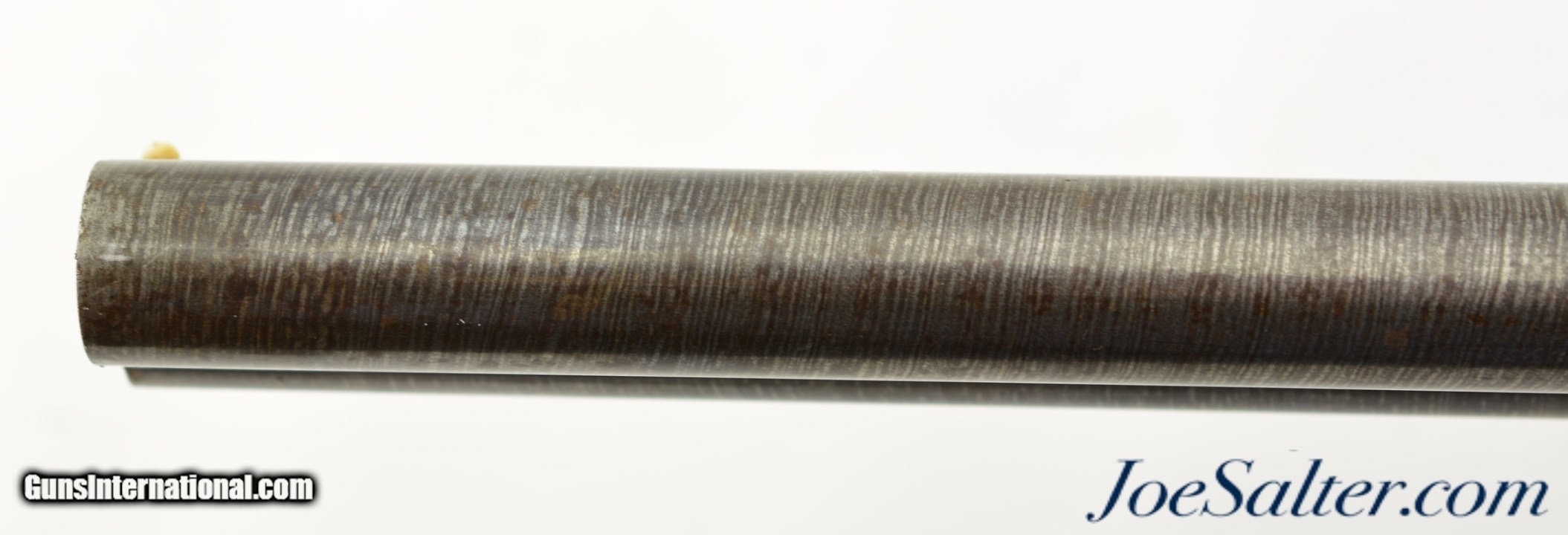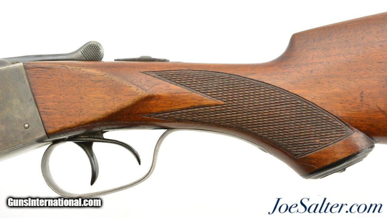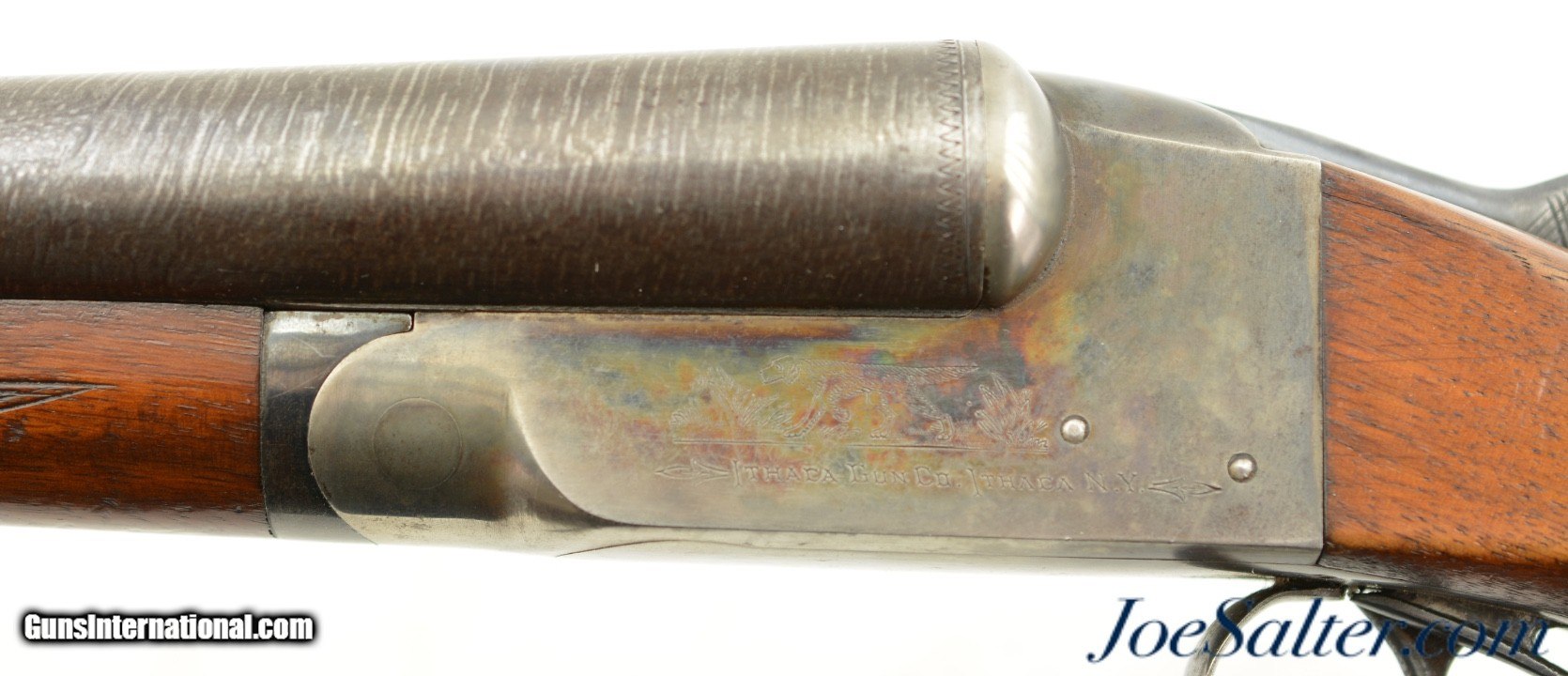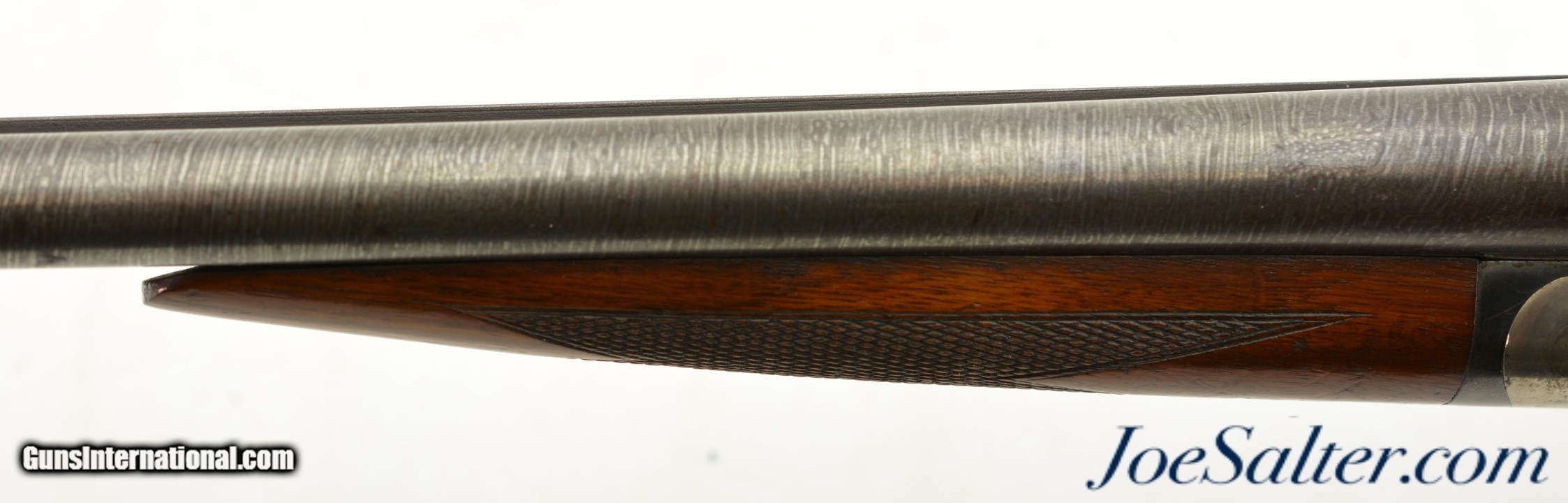 Description: Serial #209141, 12 Gauge (2 3/4" chambers), 30 inch Damascus barrels with bright, excellent bores showing a repaired dent on the left tube about half way choked Improved cylinder and full. This is an Ithaca Flues model side by side shotgun manufactured in 1910 and equipped with factory ordered Damascus barrels which was an optional purchase available for this model as most were built with Krupp fluid steel. In excellent condition the barrels show very detailed Damascus pattern with the noted repair and one small dent with some carbon staining. The receiver shows perhaps 30-35% of the original vibrant case-colors. The checkered stock and forearm rate about excellent with only minor blemishes and contusions. The original Ithaca hard rubber butt pad is very fine with light wear and a slight chip on the upper left corner. It functions properly with barrels on face and a tight lock up with the lever resting just right of center. The LOP is 14" to the first trigger with drops of 2" and 3 1/4" at the comb and heel respectively. A beautiful Ithaca choked for upland that would be a pleasure to use with the right low pressure loads. FFL or C&R Curio/Relic: Yes Price: $995.00 Contact Seller |