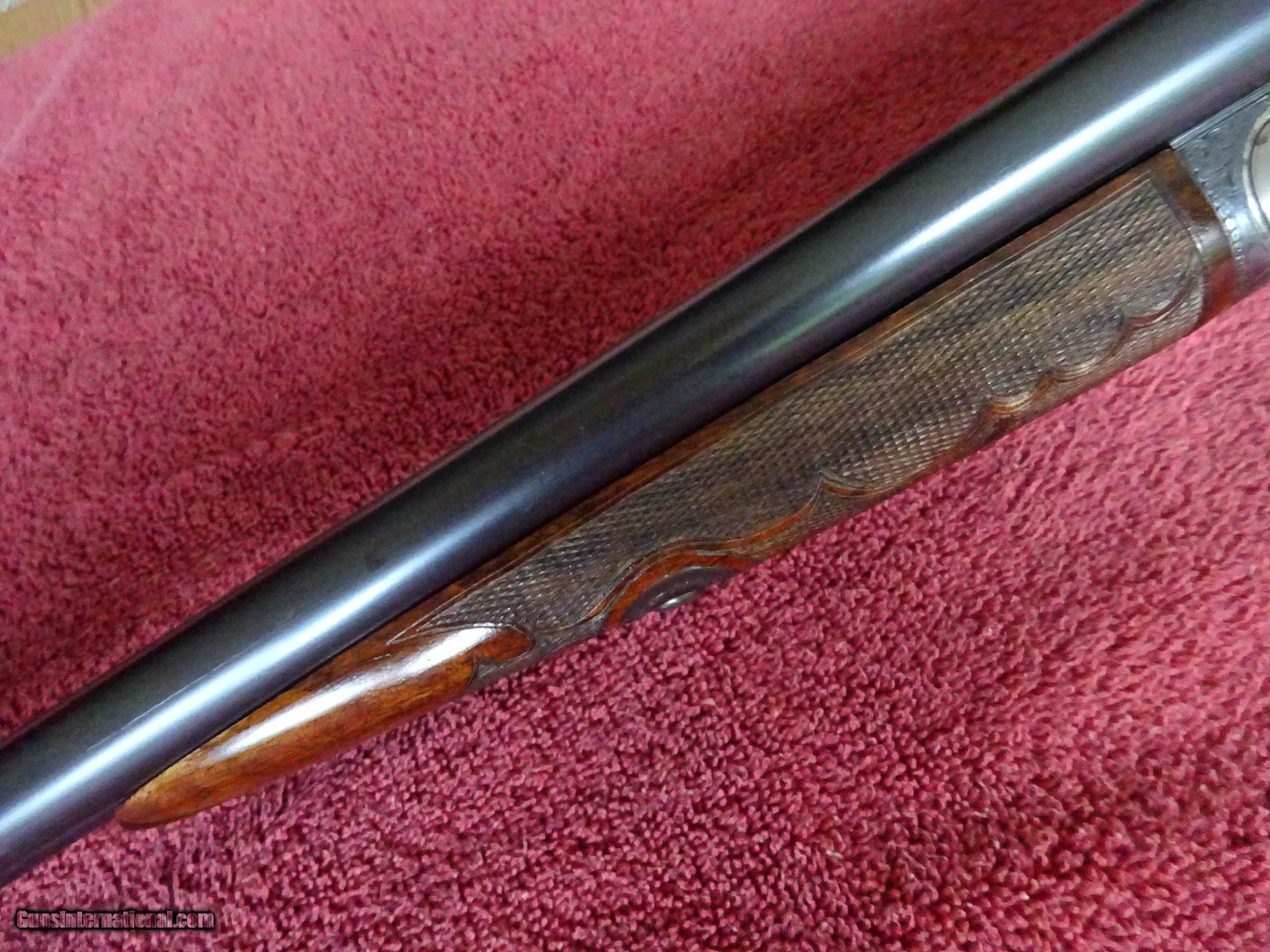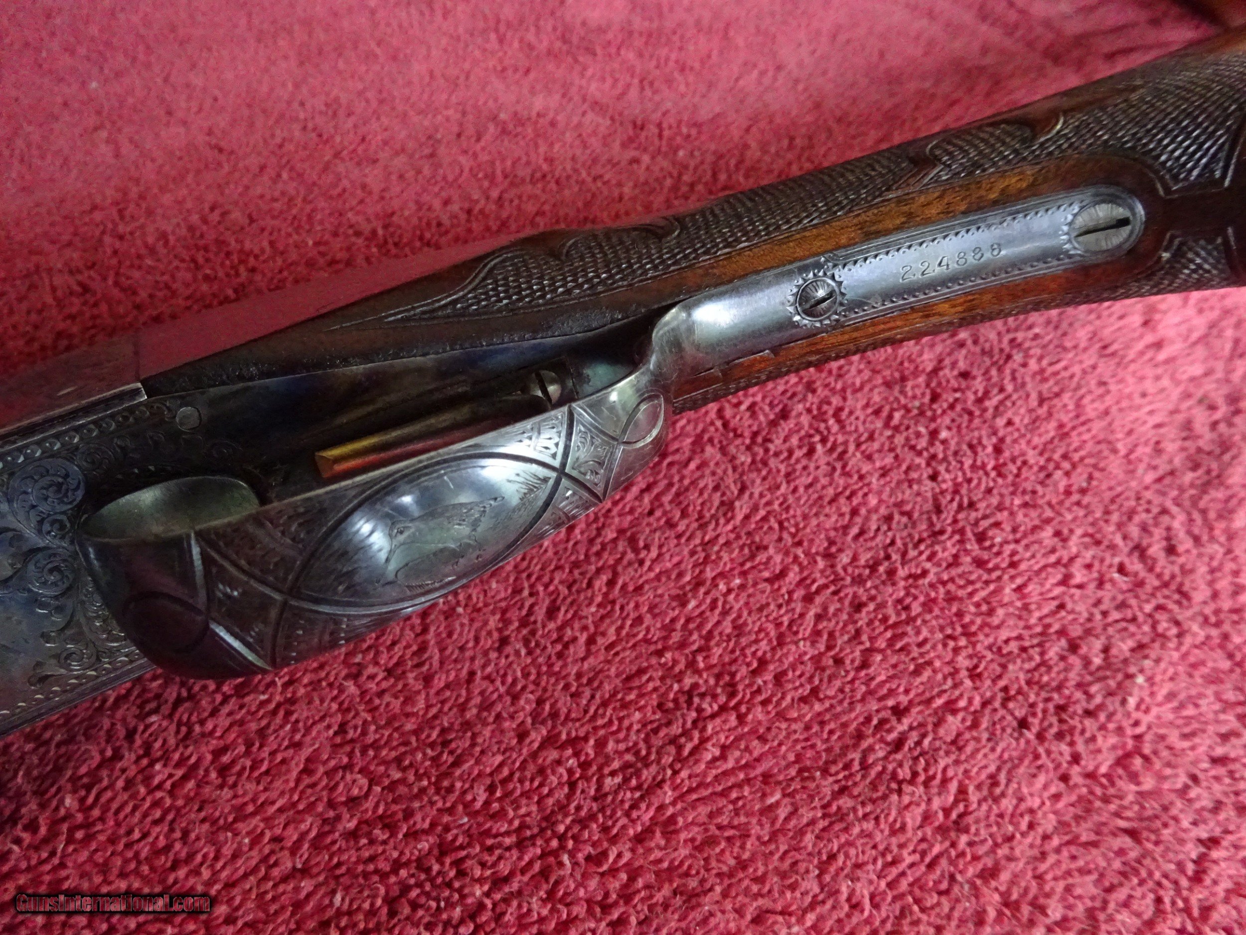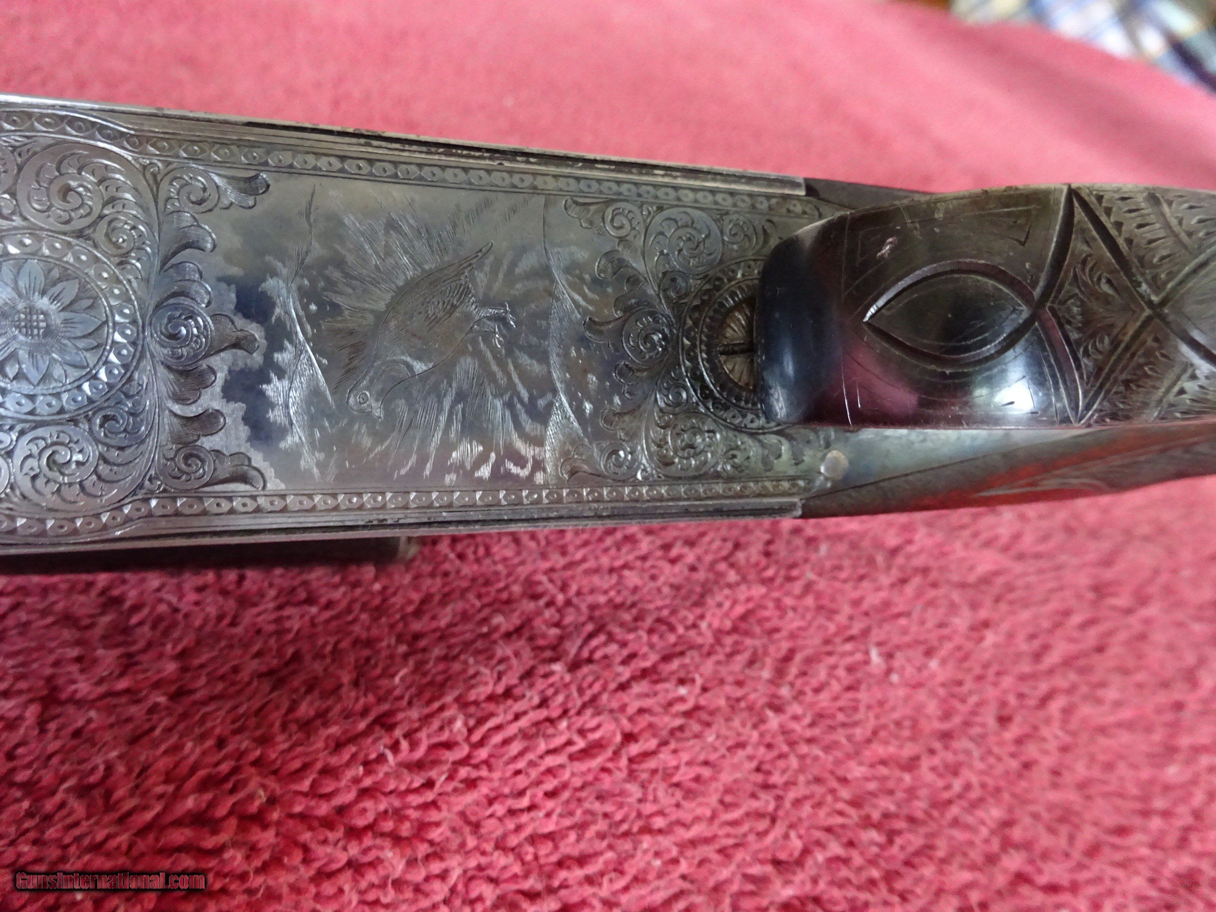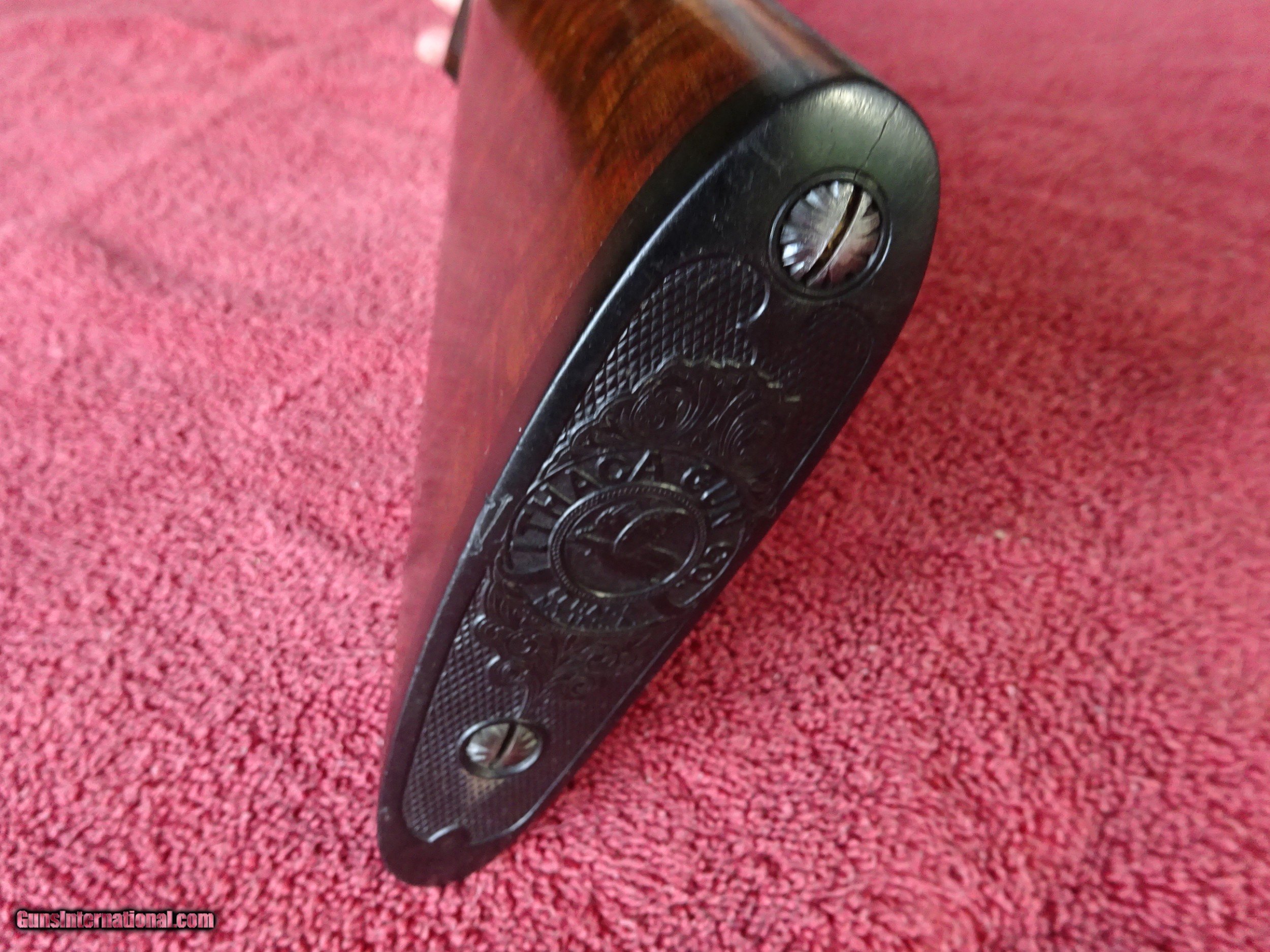 Description: ITHACA, FLUES MODEL GRADE FOUR 20 GAUGE. 28" MODIFIED AND MODIFIED BARRELS WITH 98% BLUE, MIRROR BRIGHT BORES, TWIN SIGHTS, 2 1/2" CHAMBERS, AUTOMATIC EJECTORS AND KRUPP FLUID STEEL. INFALLIBLE SINGLE SELECTIVE TRIGER. GORGEOUS ENGRAVING WITH AN ENGLISH SETTER ON THE RIGHT SIDE, ENGLISH POINTER ON THE LEFT, PARTRIDGE ON THE FLOORPLATE, WOODCOCK ON THE TRIGGERGUARD, PLUS INTRICATE SCROLLWORK AND FINE BORDERS AND STIPPLING ON THE TOP. ALL SCREWS INCLUDING BUTTPLATE ARE ENGRAVED. BOLD VIVID CASE COLOR ON ENTIRE FRAME, GOLD PLATED TRIGGER. GOLD SHIELD INLAY, PISTOL GRIP STOCK, SPLINTER FOREARM. VERY FINE CHECKERING WITH FLEUR DI LIS PATTERN, ATTRACTIVE FIGURE AND COLOR, MOST ALL THE ORIGINAL VARNISH, ONE DEEP SCRATCH ON LEFT SIDE, OTHERWISE EXCELLENT. ORIGINAL GRIP CAP AND BUTTPLATE, GREAT DIMENSIONS, 1 1/2" X 2 3/8" X 13 5/8", 5 POUNDS 14 OUNCES. BEAUTIFUL HIGH CONDITION ITHACA IN 100% ORIGINAL CONDITION. $5900.00 + $50.00 Insured shipping to an FFL address. See all Pats listings We also have hundreds of pieces of ORIGINAL gun company advertising & memorabilia available for sale. We have no reprints or reproductions. Email for more information. SOLD Curio/Relic: Yes Serial Number: 224xxx |