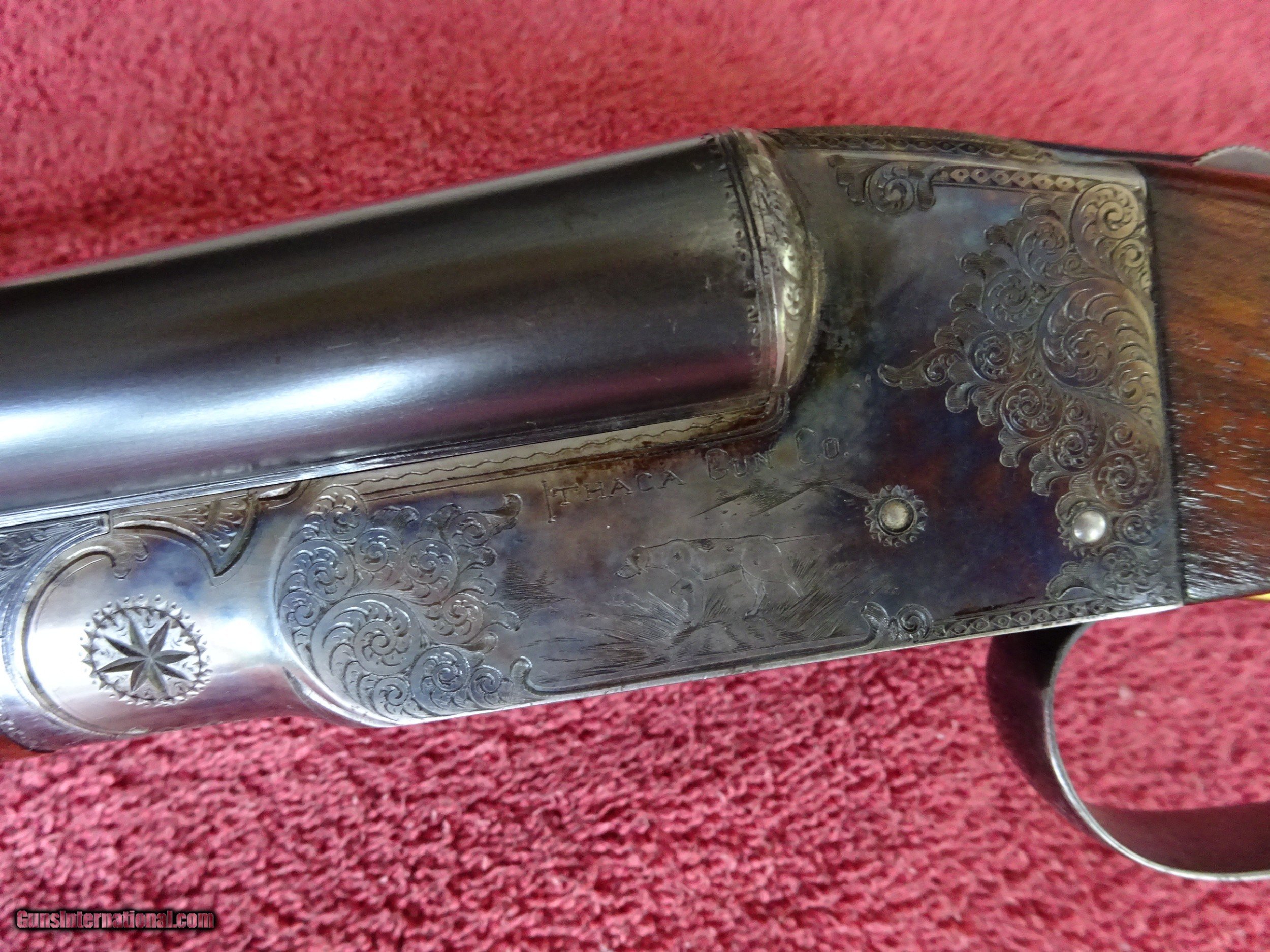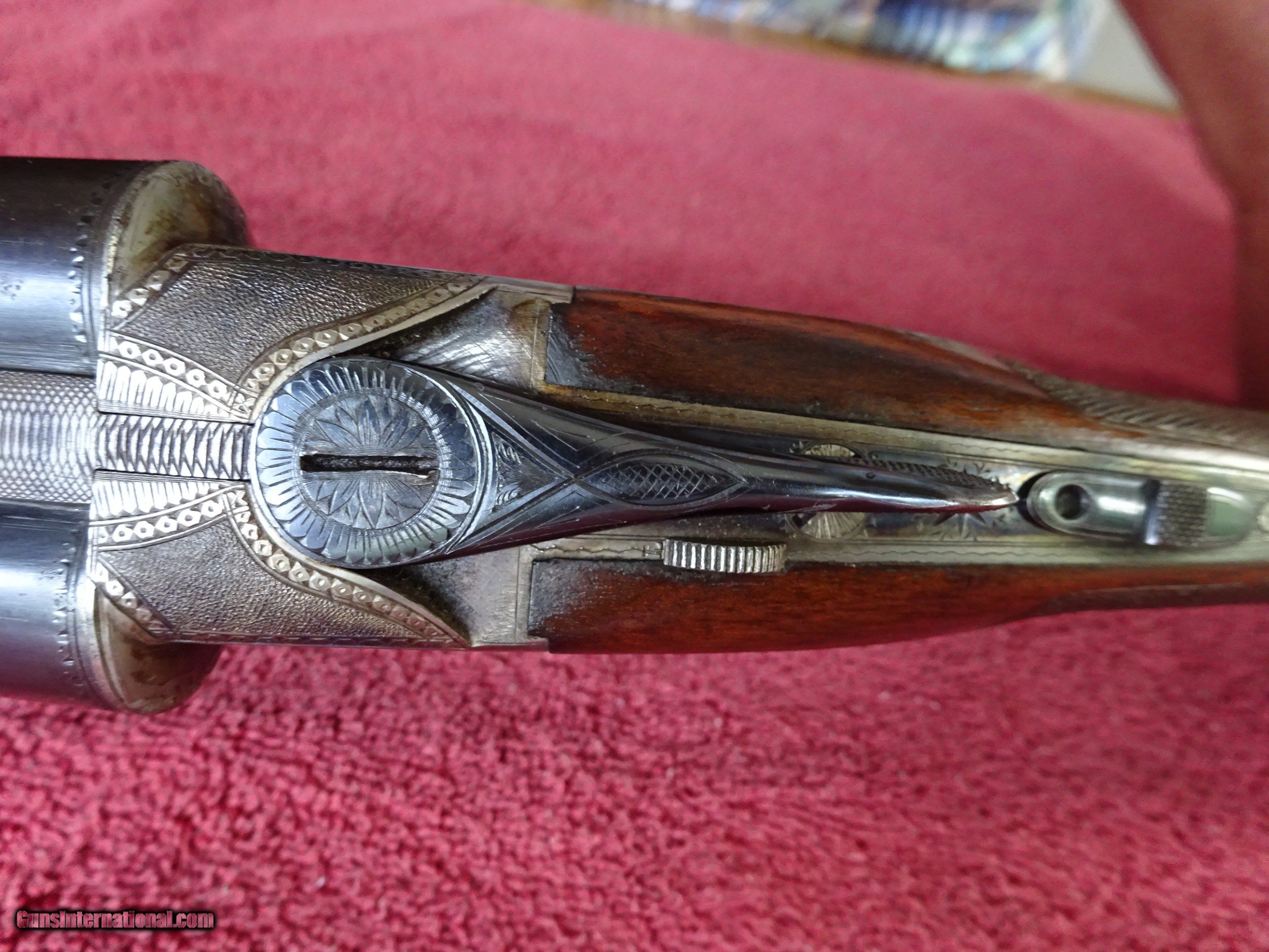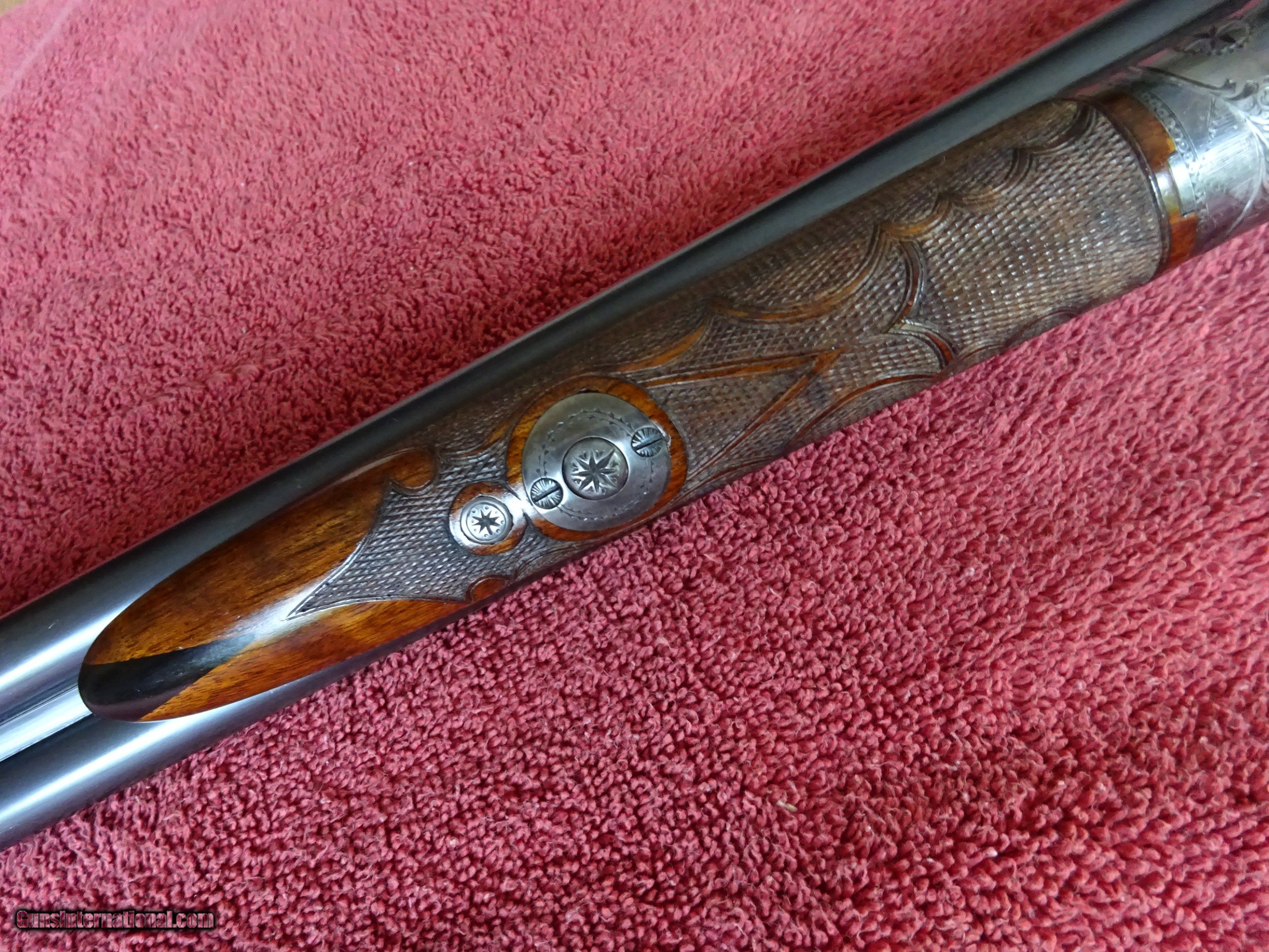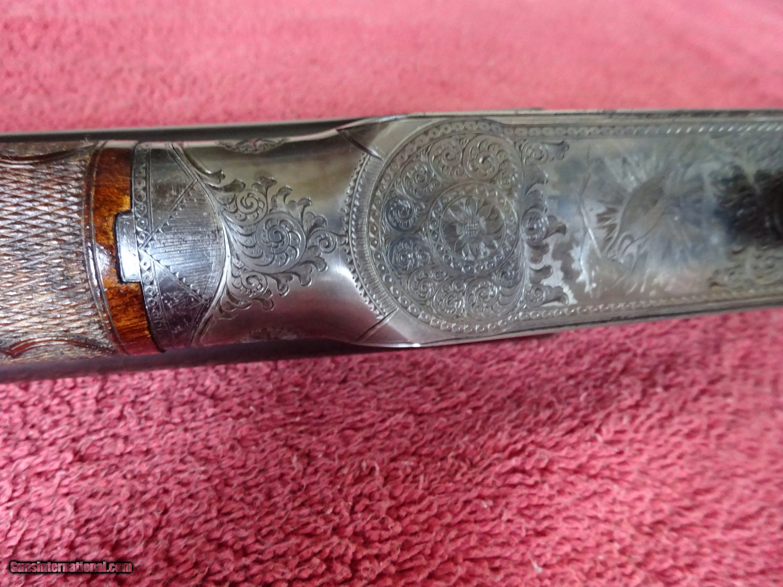 Description: ITHACA, FLUES MODEL GRADE FOUR 20 GAUGE. 28" MODIFIED AND MODIFIED BARRELS WITH 98% BLUE, MIRROR BRIGHT BORES, TWIN SIGHTS, 2 1/2" CHAMBERS, AUTOMATIC EJECTORS AND KRUPP FLUID STEEL. INFALLIBLE SINGLE SELECTIVE TRIGER. GORGEOUS ENGRAVING WITH AN ENGLISH SETTER ON THE RIGHT SIDE, ENGLISH POINTER ON THE LEFT, PARTRIDGE ON THE FLOORPLATE, WOODCOCK ON THE TRIGGERGUARD, PLUS INTRICATE SCROLLWORK AND FINE BORDERS AND STIPPLING ON THE TOP. ALL SCREWS INCLUDING BUTTPLATE ARE ENGRAVED. BOLD VIVID CASE COLOR ON ENTIRE FRAME, GOLD PLATED TRIGGER. GOLD SHIELD INLAY, PISTOL GRIP STOCK, SPLINTER FOREARM. VERY FINE CHECKERING WITH FLEUR DI LIS PATTERN, ATTRACTIVE FIGURE AND COLOR, MOST ALL THE ORIGINAL VARNISH, ONE DEEP SCRATCH ON LEFT SIDE, OTHERWISE EXCELLENT. ORIGINAL GRIP CAP AND BUTTPLATE, GREAT DIMENSIONS, 1 1/2" X 2 3/8" X 13 5/8", 5 POUNDS 14 OUNCES. BEAUTIFUL HIGH CONDITION ITHACA IN 100% ORIGINAL CONDITION. $5900.00 + $50.00 Insured shipping to an FFL address. See all Pats listings We also have hundreds of pieces of ORIGINAL gun company advertising & memorabilia available for sale. We have no reprints or reproductions. Email for more information. SOLD Curio/Relic: Yes Serial Number: 224xxx |