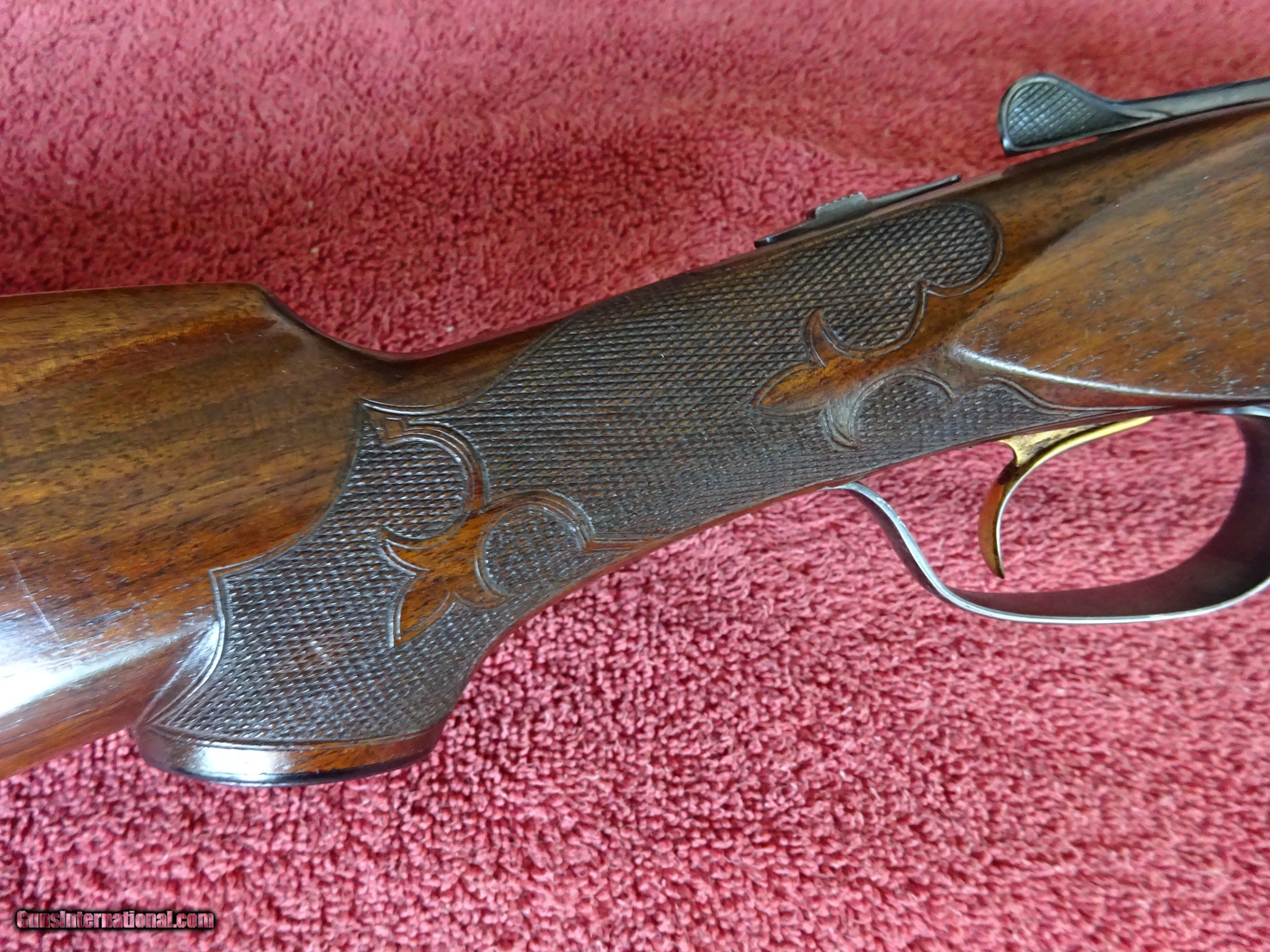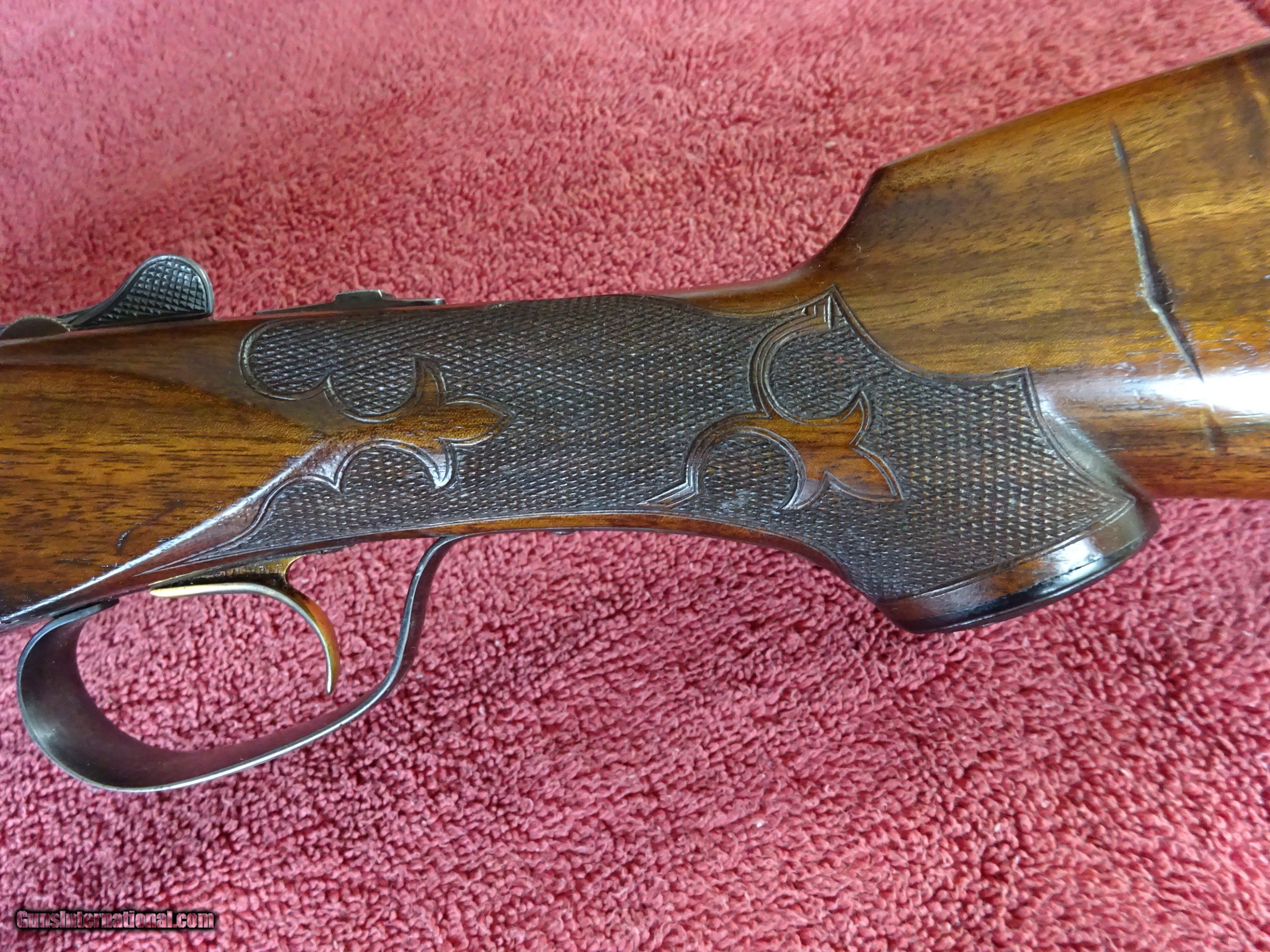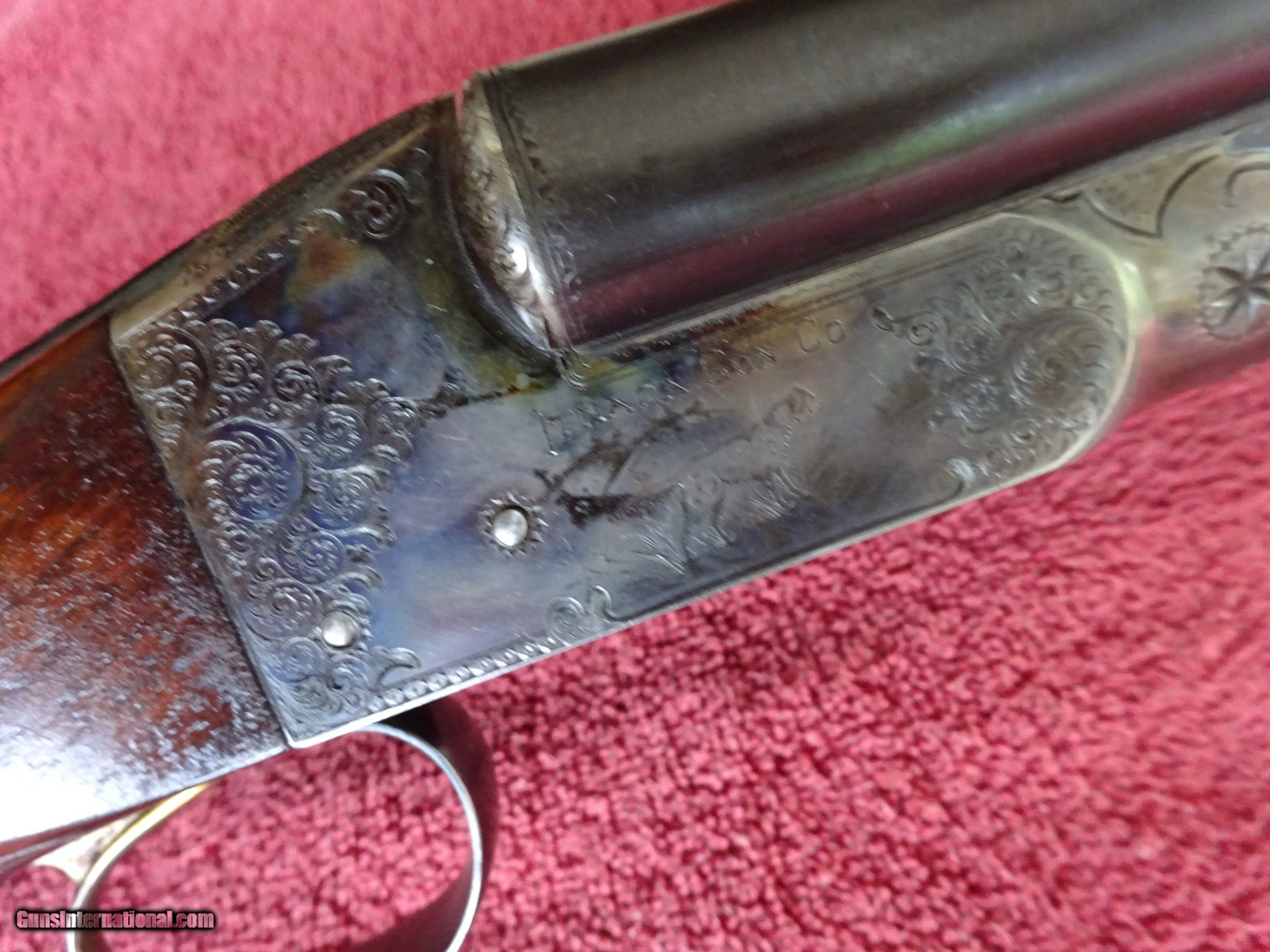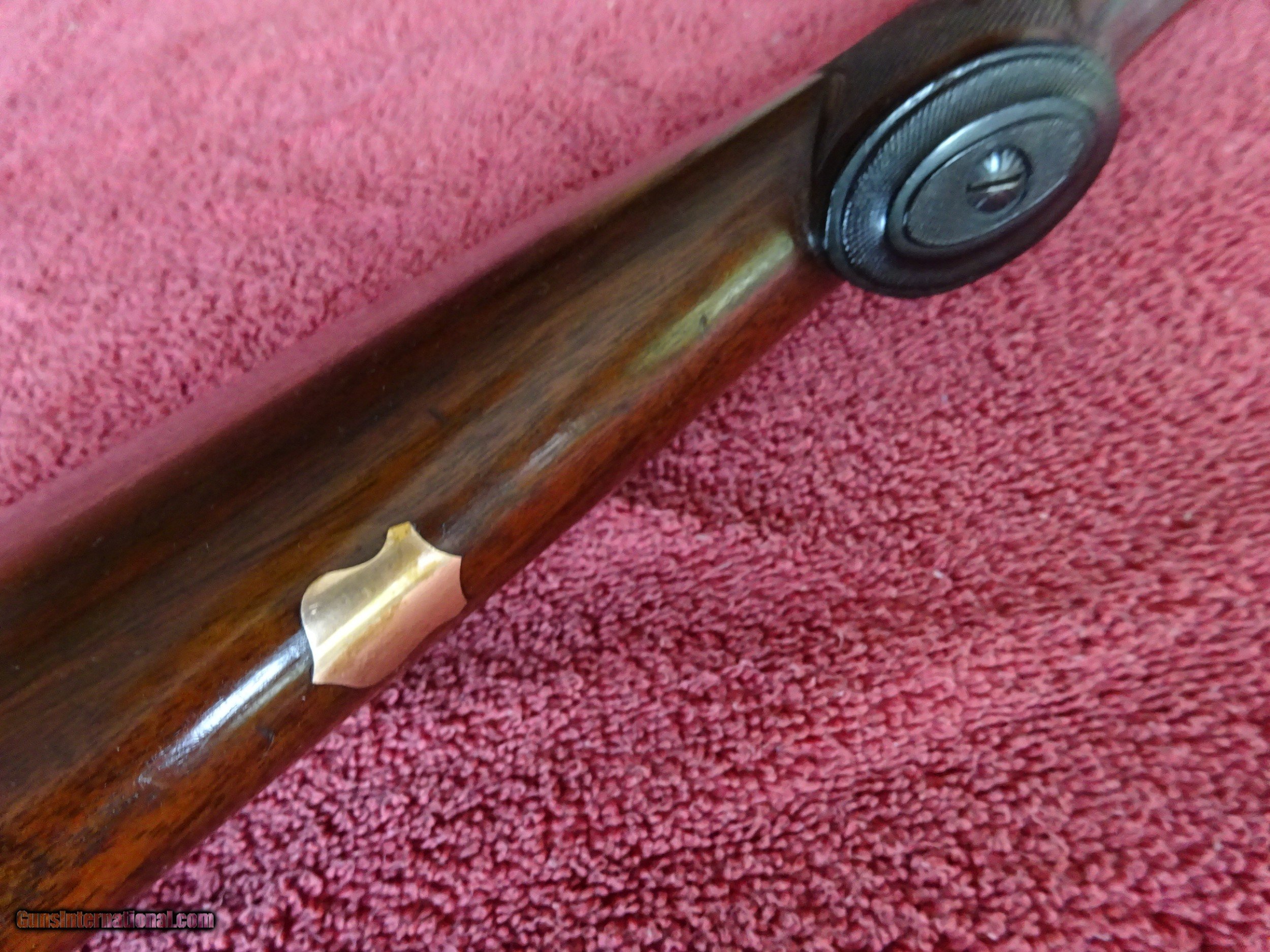 Description: ITHACA, FLUES MODEL GRADE FOUR 20 GAUGE. 28" MODIFIED AND MODIFIED BARRELS WITH 98% BLUE, MIRROR BRIGHT BORES, TWIN SIGHTS, 2 1/2" CHAMBERS, AUTOMATIC EJECTORS AND KRUPP FLUID STEEL. INFALLIBLE SINGLE SELECTIVE TRIGER. GORGEOUS ENGRAVING WITH AN ENGLISH SETTER ON THE RIGHT SIDE, ENGLISH POINTER ON THE LEFT, PARTRIDGE ON THE FLOORPLATE, WOODCOCK ON THE TRIGGERGUARD, PLUS INTRICATE SCROLLWORK AND FINE BORDERS AND STIPPLING ON THE TOP. ALL SCREWS INCLUDING BUTTPLATE ARE ENGRAVED. BOLD VIVID CASE COLOR ON ENTIRE FRAME, GOLD PLATED TRIGGER. GOLD SHIELD INLAY, PISTOL GRIP STOCK, SPLINTER FOREARM. VERY FINE CHECKERING WITH FLEUR DI LIS PATTERN, ATTRACTIVE FIGURE AND COLOR, MOST ALL THE ORIGINAL VARNISH, ONE DEEP SCRATCH ON LEFT SIDE, OTHERWISE EXCELLENT. ORIGINAL GRIP CAP AND BUTTPLATE, GREAT DIMENSIONS, 1 1/2" X 2 3/8" X 13 5/8", 5 POUNDS 14 OUNCES. BEAUTIFUL HIGH CONDITION ITHACA IN 100% ORIGINAL CONDITION. $5900.00 + $50.00 Insured shipping to an FFL address. See all Pats listings We also have hundreds of pieces of ORIGINAL gun company advertising & memorabilia available for sale. We have no reprints or reproductions. Email for more information. SOLD Curio/Relic: Yes Serial Number: 224xxx |