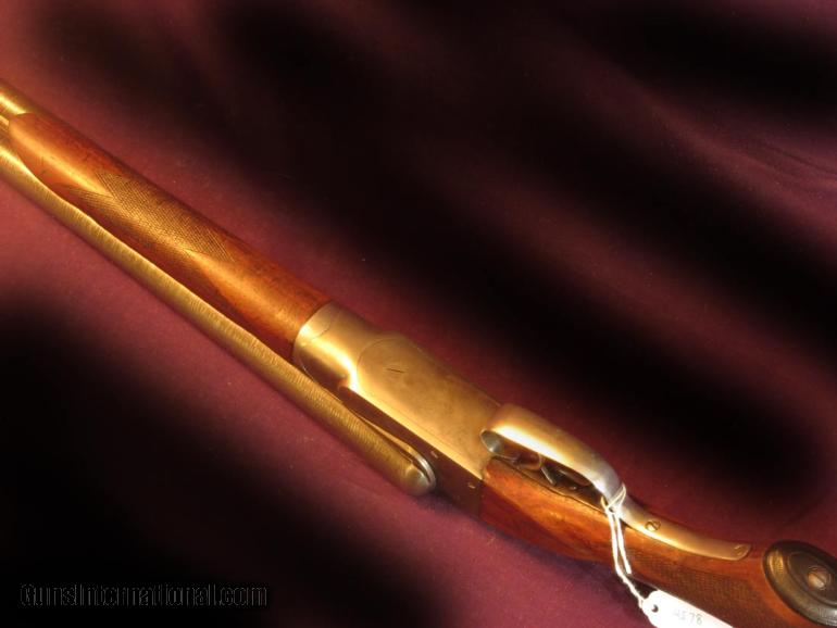 Description: A clean original gun retaining a lot of original finish and with no major flaws. 26" inch twist bbls have mirror bores R 725/715 IC, L 724/688 (F). Some small dents in bbls have been raised. Mechanically tight, good screws minor marring to action screws rhs. Extractors. Original wood, buttplate, grip cap and checkering still strong. Humble gun but eminently collectible, 26" barrels unusual for that era. LOP 14", drops 1 7/8" and 3". A tad under 7lb. SOLD |