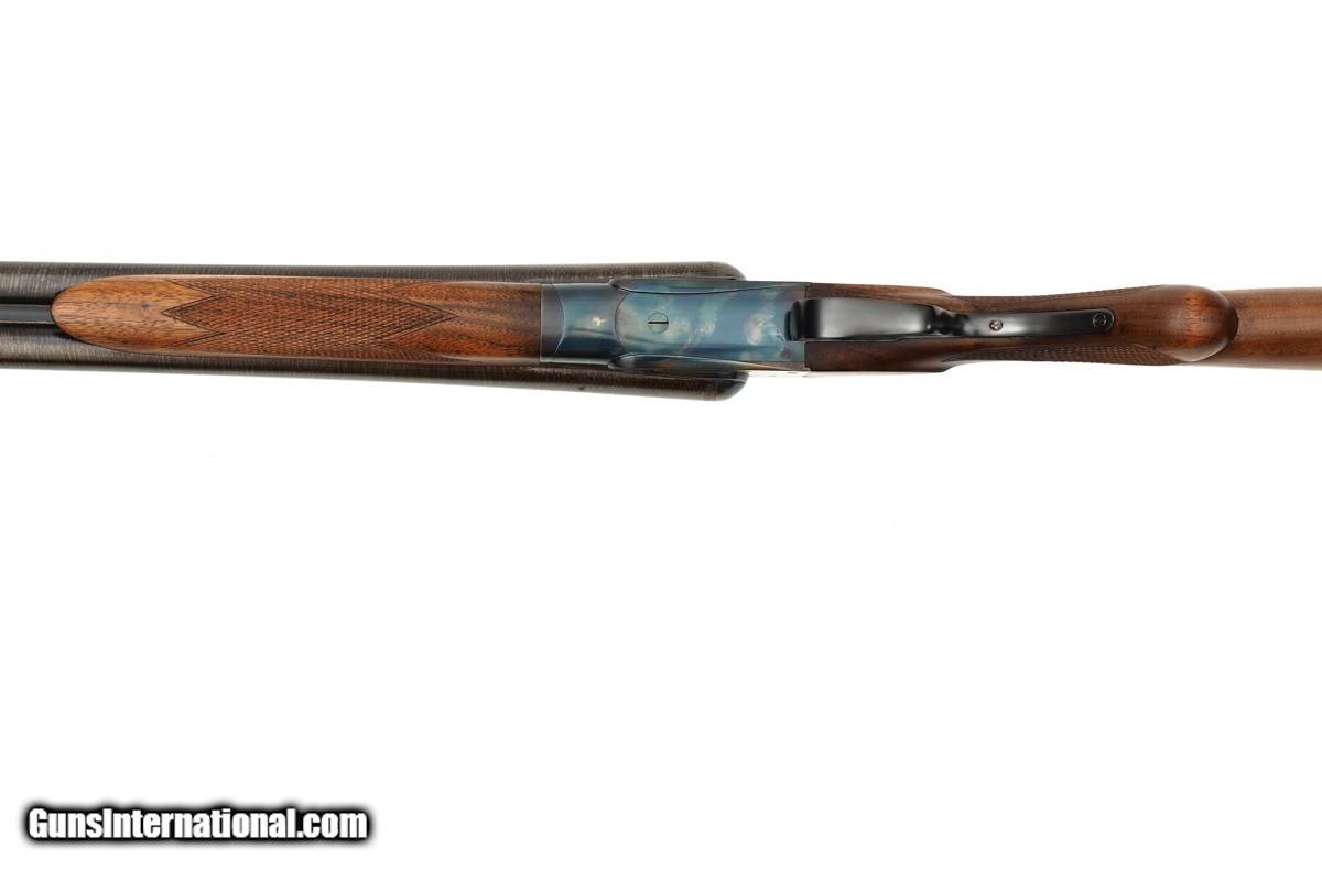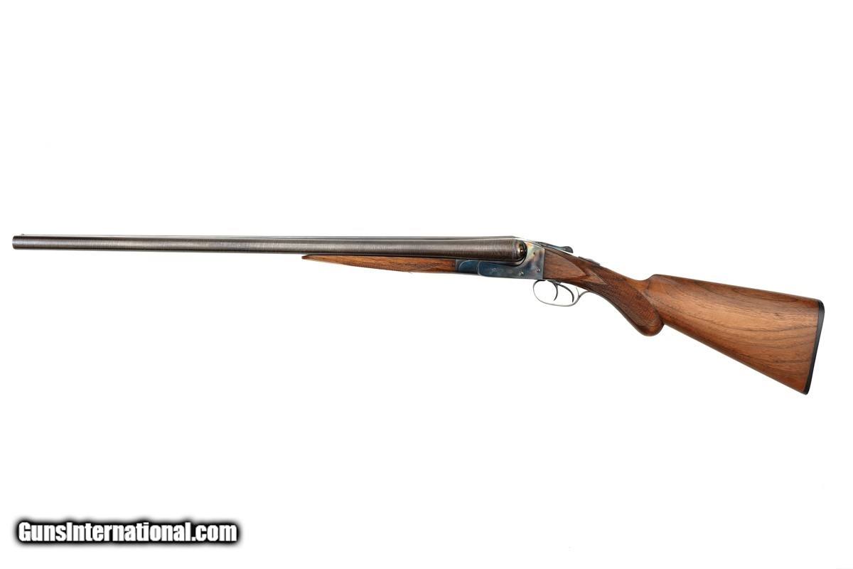 Description: 26" DAMASCUS TWIST BARRELS, SKEET AND MODIFIED, 2-3/4", DOUBLE TRIGGERS, AUTOMATIC SAFETY, ROUND KNOB PISTOL HAND GRIP, SPLINTER FOREND, ITHACA BUTTPLATE, 7 LBS, 1-7/8" DAC, 3" DAH, 14" LOP A 12 gauge game shotgun shotgun with 26” Damascus Twist barrels chambered for 2-3/4" chambers, nicely fit with extractors, a tapered machined concave game rib with a brass bead front sight and choked Skeet & Modified. Both sides of the case color hardened finished action reads "ITHACA HAMMERLESS" in banner. The boxlock non-ejector action is fit with double triggers. Best quality American walnut stock, Round knob pistol hand grip and Splinter forend with snap release, 14” LOP to a factory hard rubber Ithaca Gun Co buttplate, 7 Lbs.