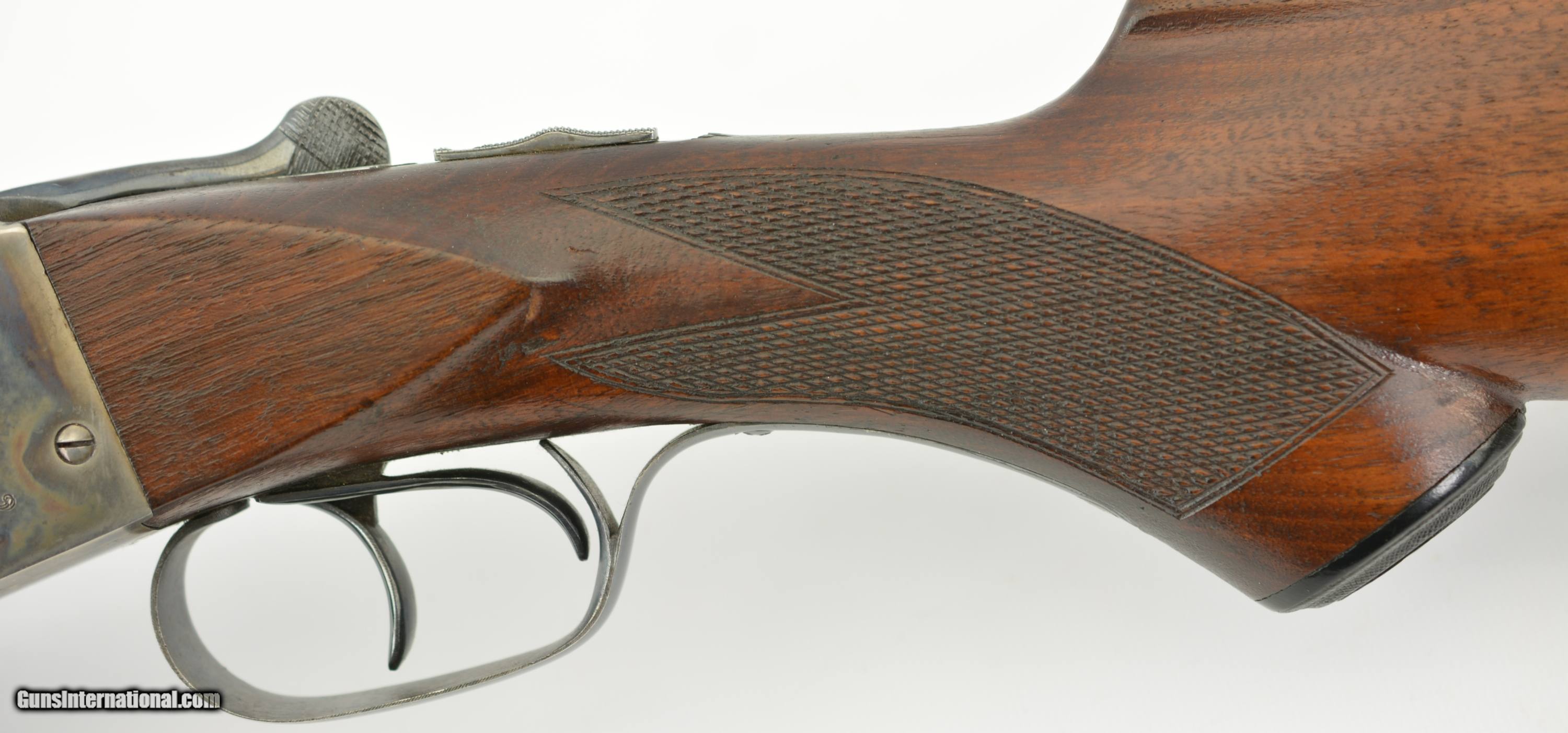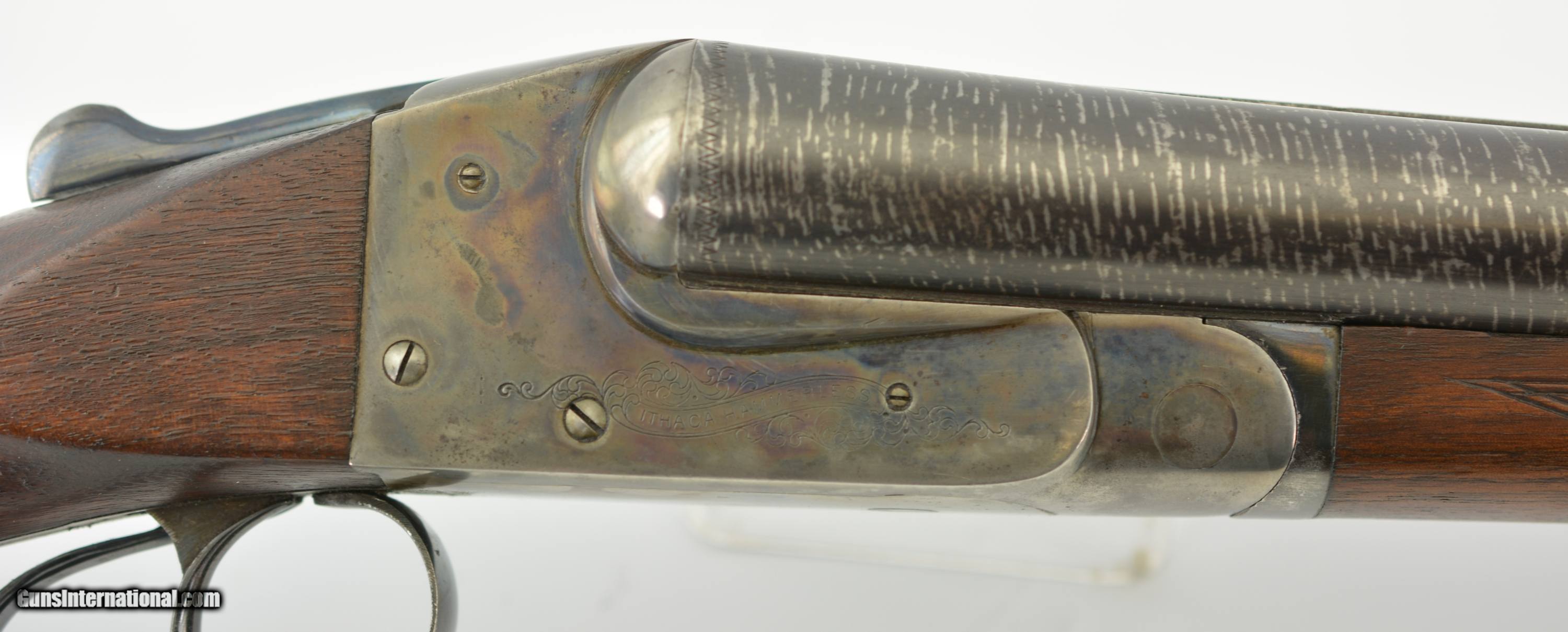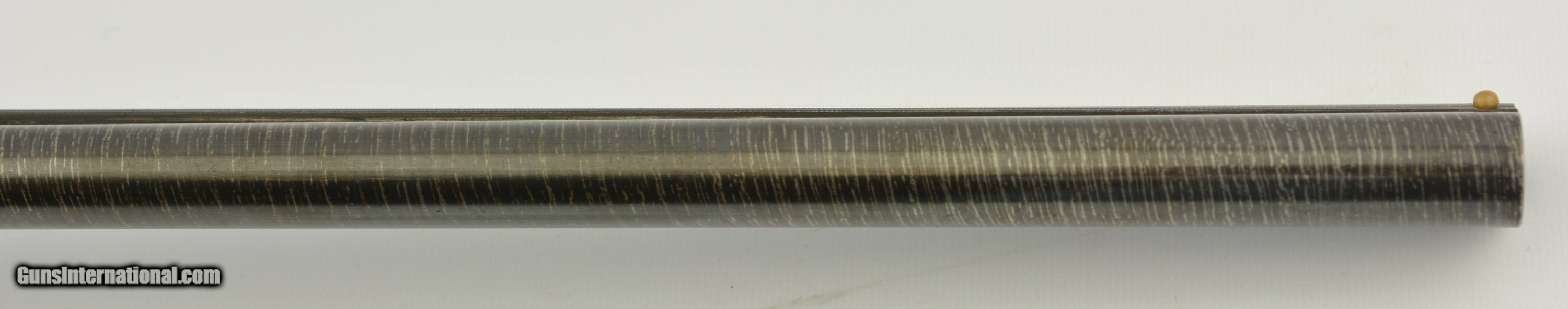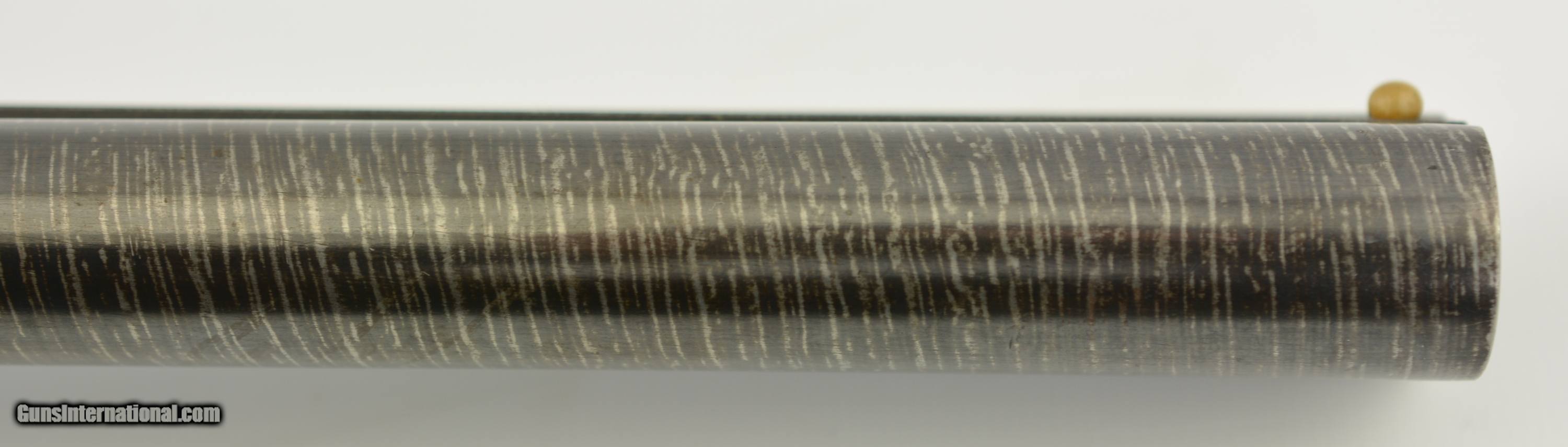 Description: Serial #101255, 12 GA (2 3/4"), 30" Damascus twist barrels choked full and full with bright, excellent bores. This a field grade Lewis model manufactured by Ithaca in 1904 and was the first model to introduce the top-bolt. The gun is in excellent overall condition with the barrels retaining virtually all of the original twist Damascus pattern with very mild thinning along the right barrel. The action retains about 85% of the original vibrant case-hardened colors showing some silvering on the high edges, a few errant freckles and muting to a pleasant silvery case-hardened patina along the bottom metal. The top lever, triggers and triggerguard retain about 93-95% original bright blue showing some minor thinning and flaking along the bow of the guard. The sides of the action are crisply engraved with a light foliate motif and “ITHACA HAMMERLESS" in a scroll. The checkered capped pistolgrip walnut buttstock remains in very fine condition showing a couple of very tiny flakes forming near the upper tang, a light scratch along the right side wrist and some scattered light dings. The toe has been chipped and neatly repaired along with the tip of the buttplate (See photos). The forend shows a bit more wear with a thin 1 1/4" crack and a number of small slivers missing along its right edge. The hard rubber pistolgrip cap remains in very good plus condition. Length-of-pull is 14" with drops of 1 7/8" and 3". The arm features non-automatic safety and single large celluloid bead. Lock-up is tight on-face with the top lever resting right of center and seems to function well mechanically. This is a very nice Lewis model Ithaca rarely seen in this condition. FFL or C&R SOLD Manufacturer: Ithaca Model: Lewis Caliber Info: 12ga Gauge Info: 12ga |