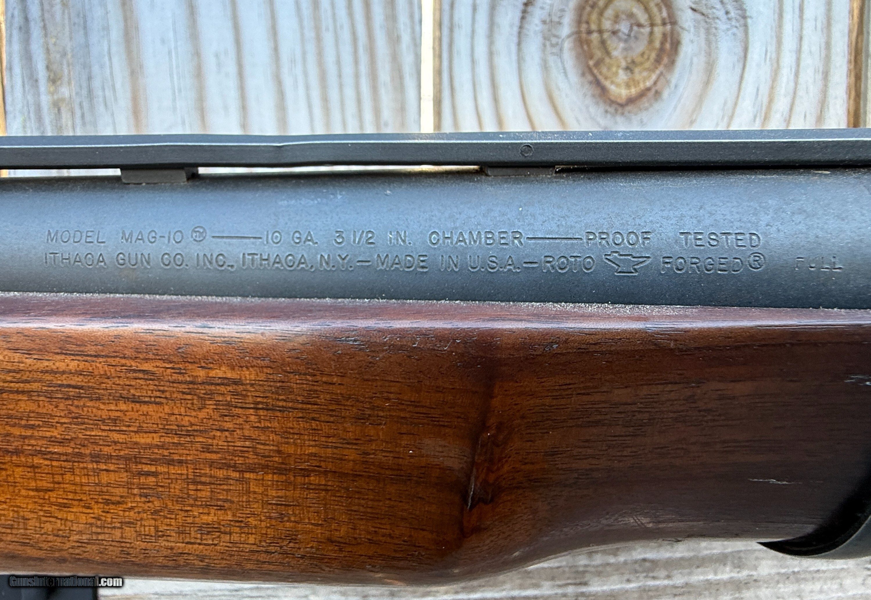 Description: Here we have Ithaca Mag-10 10 gauge magnum semi auto shotgun. The Ithaca Mag-10 is a gas-operated, semi-automatic 10-gauge shotgun, famous for waterfowl hunting (especially geese) Known for its heavy build (11-12 lbs), 3.5-inch chamber, and significant power, it features a unique CounterCoil system for recoil dampening (reducing capacity to 2-3 shells), wood stocks, and a blued finish on standard models. Shotgun Gauge: 10 Gauge Manufacturer: Ithaca Model: Mag-10 Serial Number: 100017140 Condition: Very Good Metal Condition: Very Good Wood Condition: Very Good Bore Condition: Very good Price: $750.00 Contact Seller |