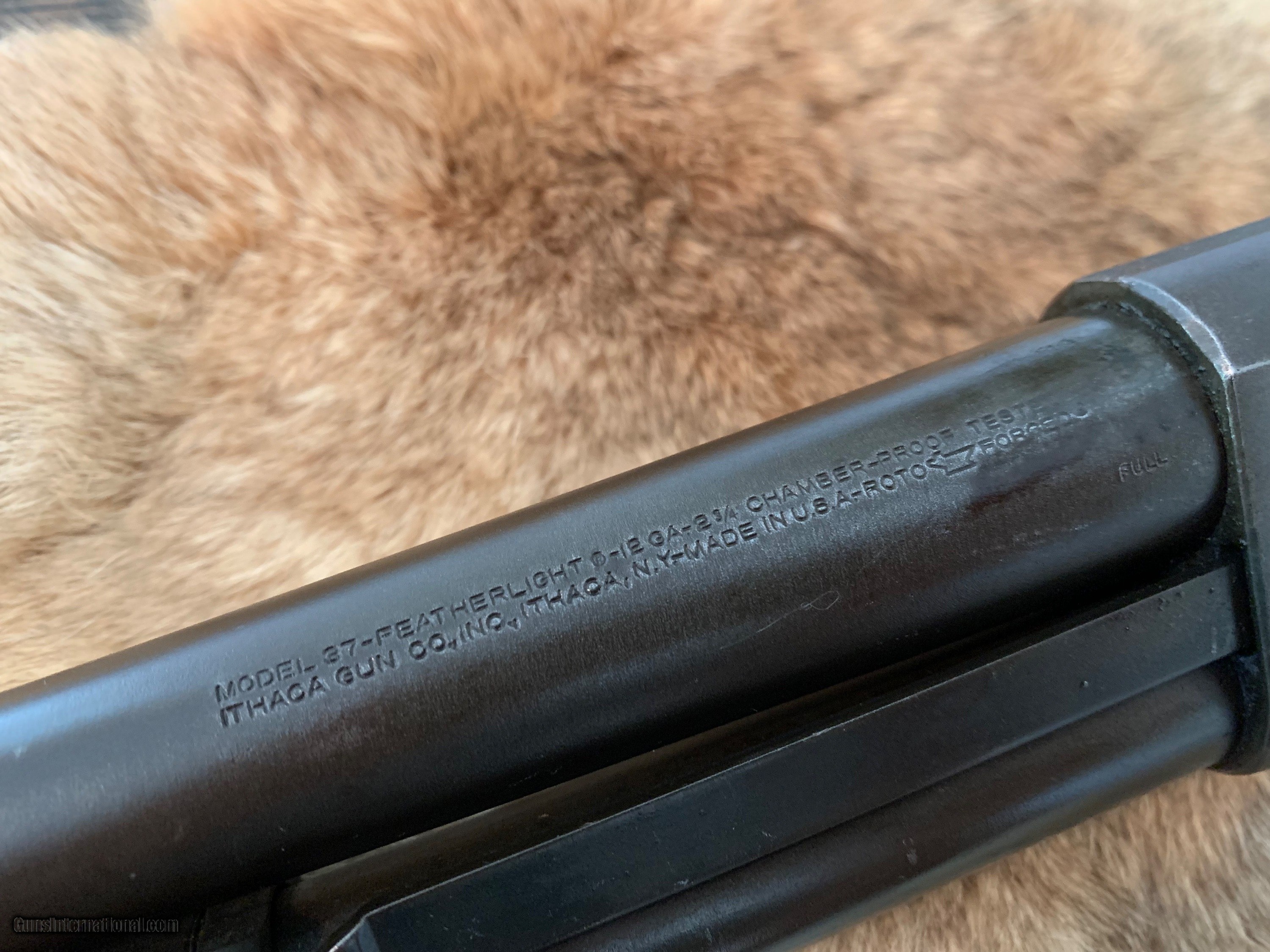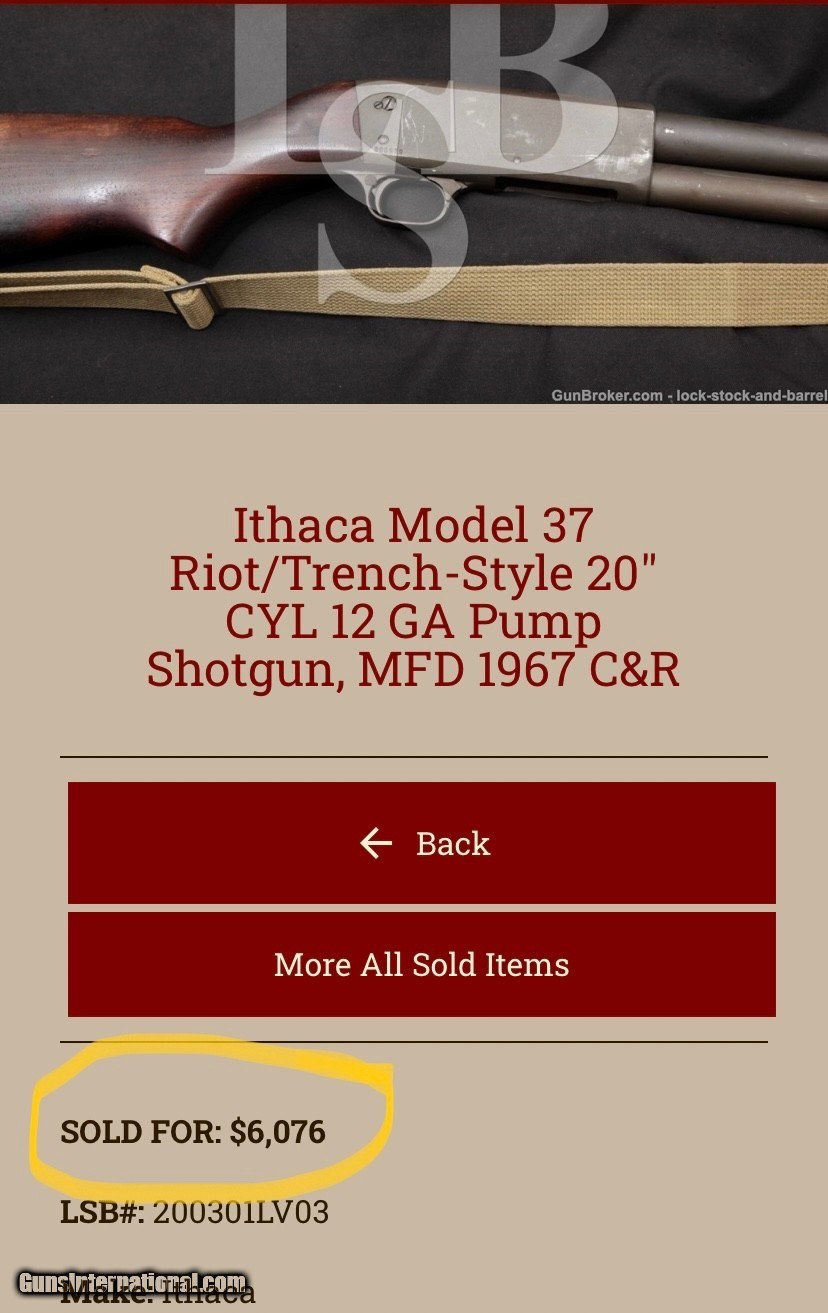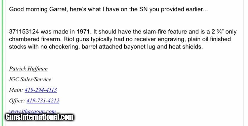 Description: Offered for your consideration is a very nice Ithaca Model 37 Riot / Trench style Shotgun made in 1971. This is the real deal displaying all correct and original finishes. The shotgun has a 20 inch barrel and slam-fire feature chambered for the correct 2 3/4. The overall condition is very good showing good bore and furniture that is tight with zero cracks or splits which is rarely seen. The stock show's handling marks mainly where the shotgun spent time in a military / LEO weapons rack. All this information has been verified by Ithaca. Please see the email image provided by Patrick Huffman from Ithaca who was very interested to talk to me on the shotgun stating he didn't often get the opportunity to provide information on such an awesome shotgun (his words). There is also a reference image regarding price. These are becoming rarely seen for sale and copies are everywhere with individuals using incorrect engraved guns and false stamping. This is your opportunity to obtain the real deal for a fair price. This has been in my private collection for many years and I'm offering in hopes for another to enjoy it. Please feel free to contact me with questions and thank you for looking. This is an FFL to FFL only transaction - please know your state laws. Sincerely, Garret 980-269-5120 ** Shipping will be $60 ** SOLD Shotgun Gauge: 12 Gauge Manufacturer: Ithaca Model: 37 Serial Number: 371153124 Barrel Length: 20 Condition: Good Metal Condition: Good Wood Condition: Good Bore Condition: Very good Manufacture Date: 1971 |