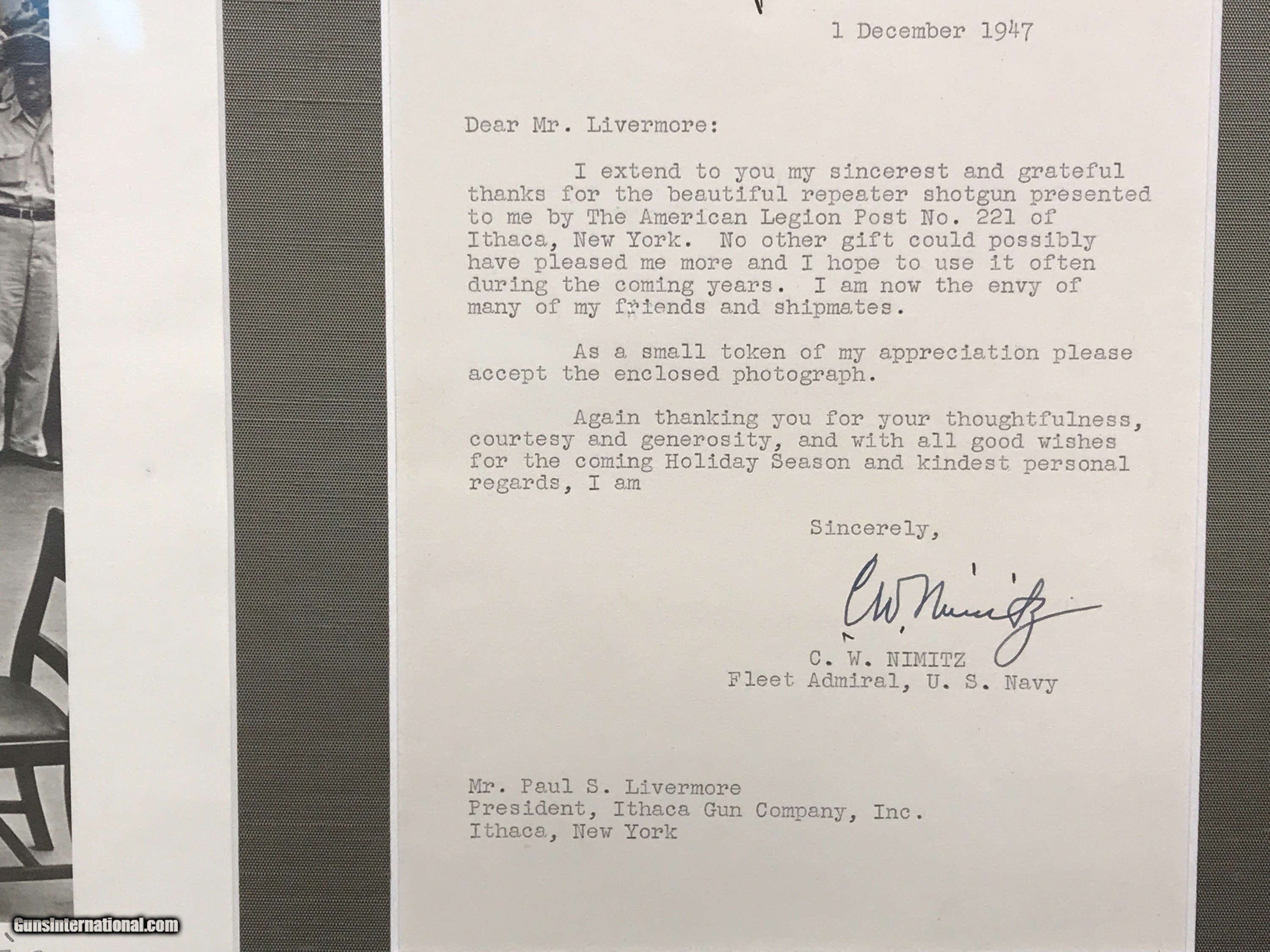 Description: So I have a very unique Ithaca 2 barrel set that was shipped to the military in 1942 , the gun letters as a 12ga Field with a set of 26'' skt/skt barrels it was built in 1936 /37 and shipped to a military finance officer in 1942 , the military would use skeet gun to train there WWll pilots as to how to lead targets for aerial combat , sometime in its life a set of 28'' barrels were added they are choked MOD/FULL .015-.040 , the 26'' skeet barrels are choked .010-.020 they are factory marked SKT/SKT and have the ordinace marks on them .LOP is 14'' to a replacement pad , DAC 1 1/2 DAH 2 3/4 , automatic ejectors , wieght is 7.8 pounds with the 28'' barrels , SST , There are no splits or cracks in the wood , the barrels are in great shape with no rust or pitting , ejectors are strong and in time . The picture of Admiral Nimitz does not come with the gun but it will come with the Ithaca Gun information letter . Shipping is 65.00 to your FFL Please feel free to call with questions 607-227-4088 607-539-6271 Thanks for looking . Brian Hunt SOLD |