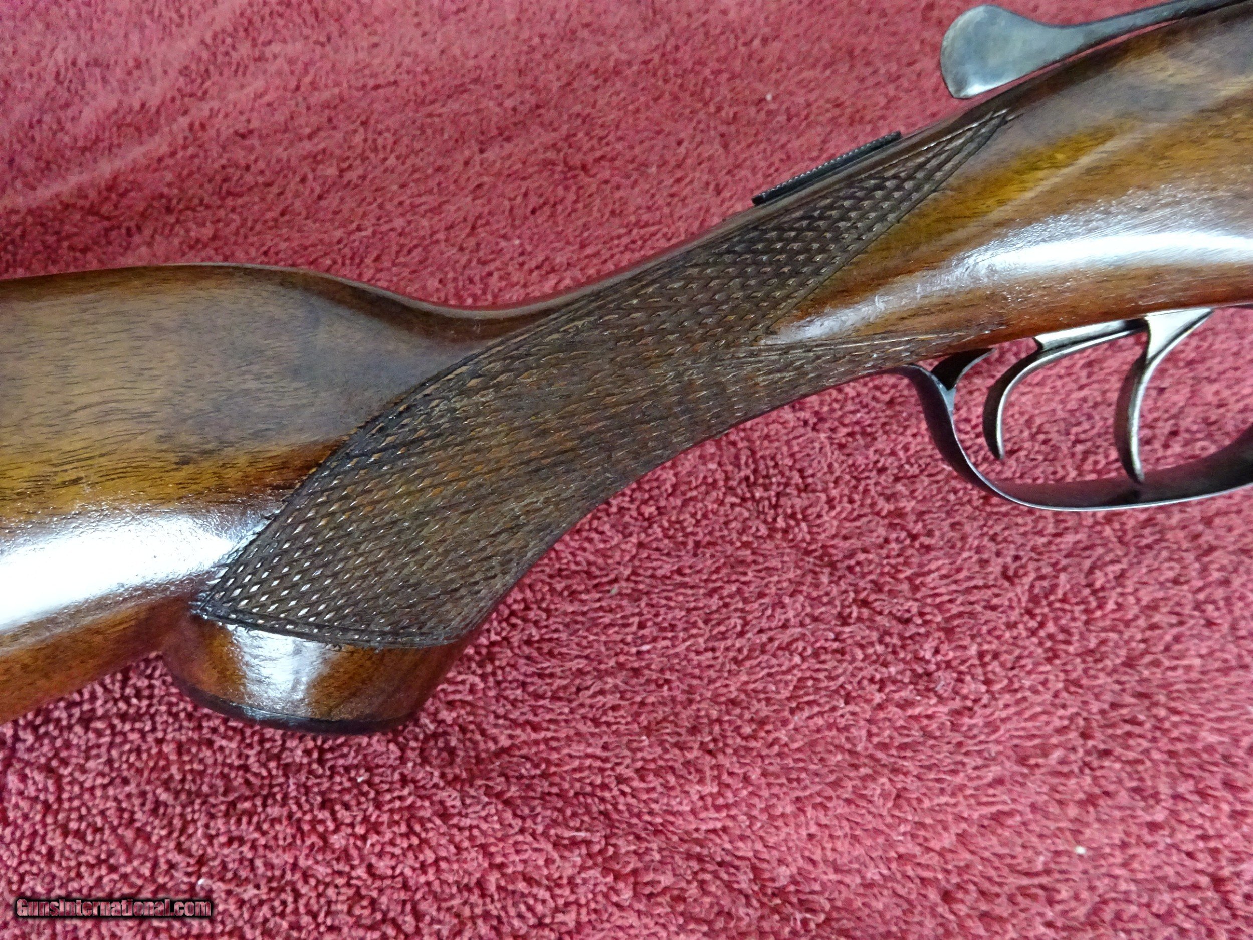Description: ITHACA, N.I.D., FIELD GRADE 410 GAUGE. 26" BARRELS, MIRROR PERFECT BORES, MODIFIED & FULL, 2 1/2" CHAMBERS, 99% BRIGHT BLUE, TWIN IVORY SIGHTS, BARRELS RING BEAUTIFULLY. STAR ENGRAVED VARIATION, BOLD VIVID CASE COLOR OVER ENTIRE FRAME, POINTING DOGS ON BOTH SIDES, COCKING INDICATORS, TOP LEVER TO THE FAR RIGHT, TIGHT ON FACE. TRIGGERGUARD AND FOREARM IRON ALSO HAVE 99%^ BRIGHT BLUE. PISTOL GRIP STOCK, SPLINTER FOREARM, ORIGINAL GRIP CAP AND ITHACA SUNBURST PAD, VERY GOOD WOOD AND CHECKERING. GREAT DIMENSIONS - 1 1/2" X 2 1/2" X 14 3/8", 5 POUNDS 14 OUNCES. THE ORIGINAL METAL FINISH IS TRULY OUTSTANDING. SCARCE LITTLE DOUBLE MADE IN 1926, LESS THAN 800 MADE. $4500.00 + $50.00 Insured shipping to an FFL address. See all Pats listings We also have hundreds of pieces of ORIGINAL gun company advertising & memorabilia available for sale. We have no reprints or reproductions. Email for more information. SOLD Curio/Relic: Yes |