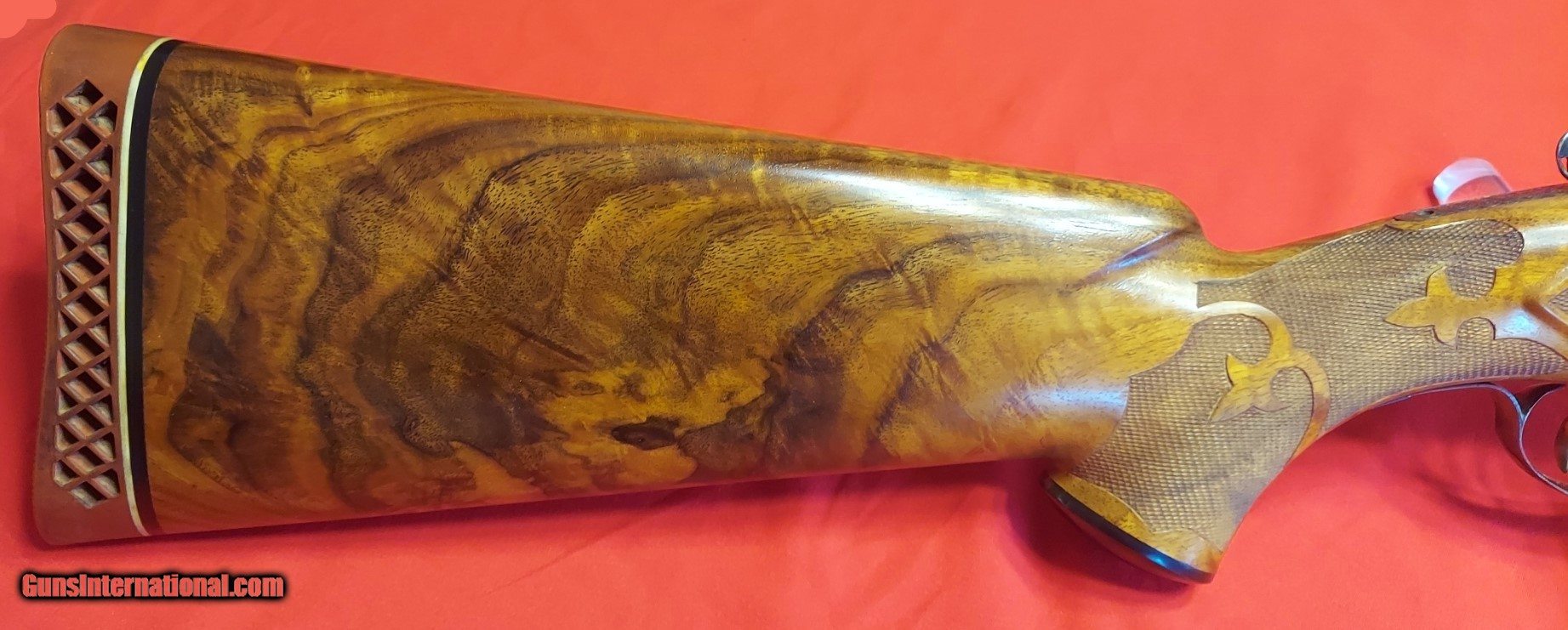 Description: Ithaca SBTG Victory grade made in 1949 and engraved by Walter Kolouch in 1964 for Bill Jaqua of Jaqua's Firearms in Findley Ohio. This is the only gun of the six Walter made that has the rib and posts engraved. Mr. Kolouch was trained by Ferlach as a master gunsmith and engraver. The left side of the action has 4 gold quail and 1 setter, the right side has 3 gold ducks and 1 white gold setter. The lower receiver has a gold eagle with a white gold rabbit in its talons, and a white gold setter with a duck in its mouth. To the best of my knowledge this gun is a full choke and does not show signs of any aftermarket modification. The gold is 24 kt at .030-.040 thick with 1/3 set into the steel and 2/3 above the steel. The engraving is Arabesque scrolls. The rib and the posts as well as 5 inches of the barrel at the breach are also engraved along with the trigger guard. Per Mr. Kolouch by phone in 2019 $2000-$3000 worth of gold was used to do the gold inlays. In a letter dated Sept. 18 2019 Mr. Kolouch said the replacement cost today would be about $ 17,000. Open to realistic offers if you are serious about this gun. SOLD Curio/Relic: Yes Shotgun Gauge: 12 Gauge Manufacturer: Ithaca Model: V4 Serial Number: 403137 Ejectors: yes Condition: excellent Metal Condition: excellent Wood Condition: excellent Bore Condition: bright and shinny Barrels: 1 Action: SBT Triggers: pull trigger Stock Comb: 1 3/8 Stock Heel: 1 1/2 Butt Pad: yes LOP: 15 1/4 Manufacture Date: 1949 Chokes: Full Engraving: Walter Kolouch |