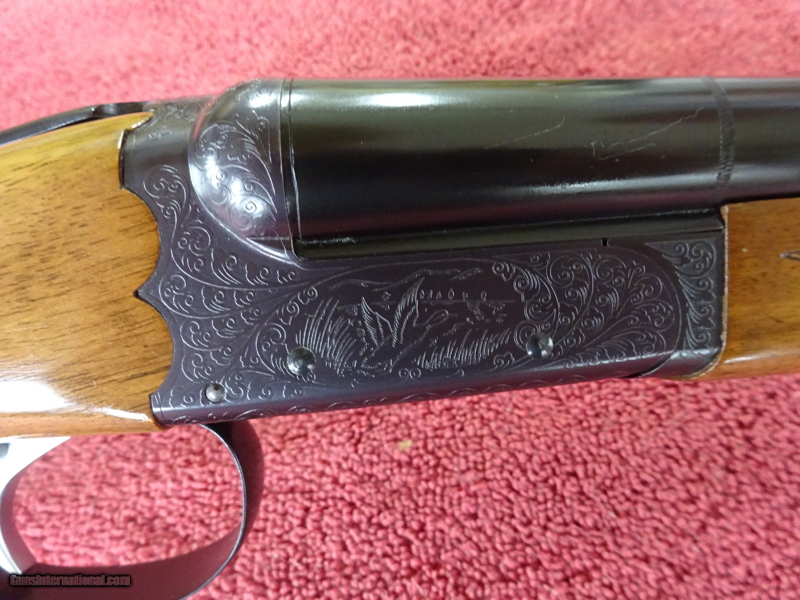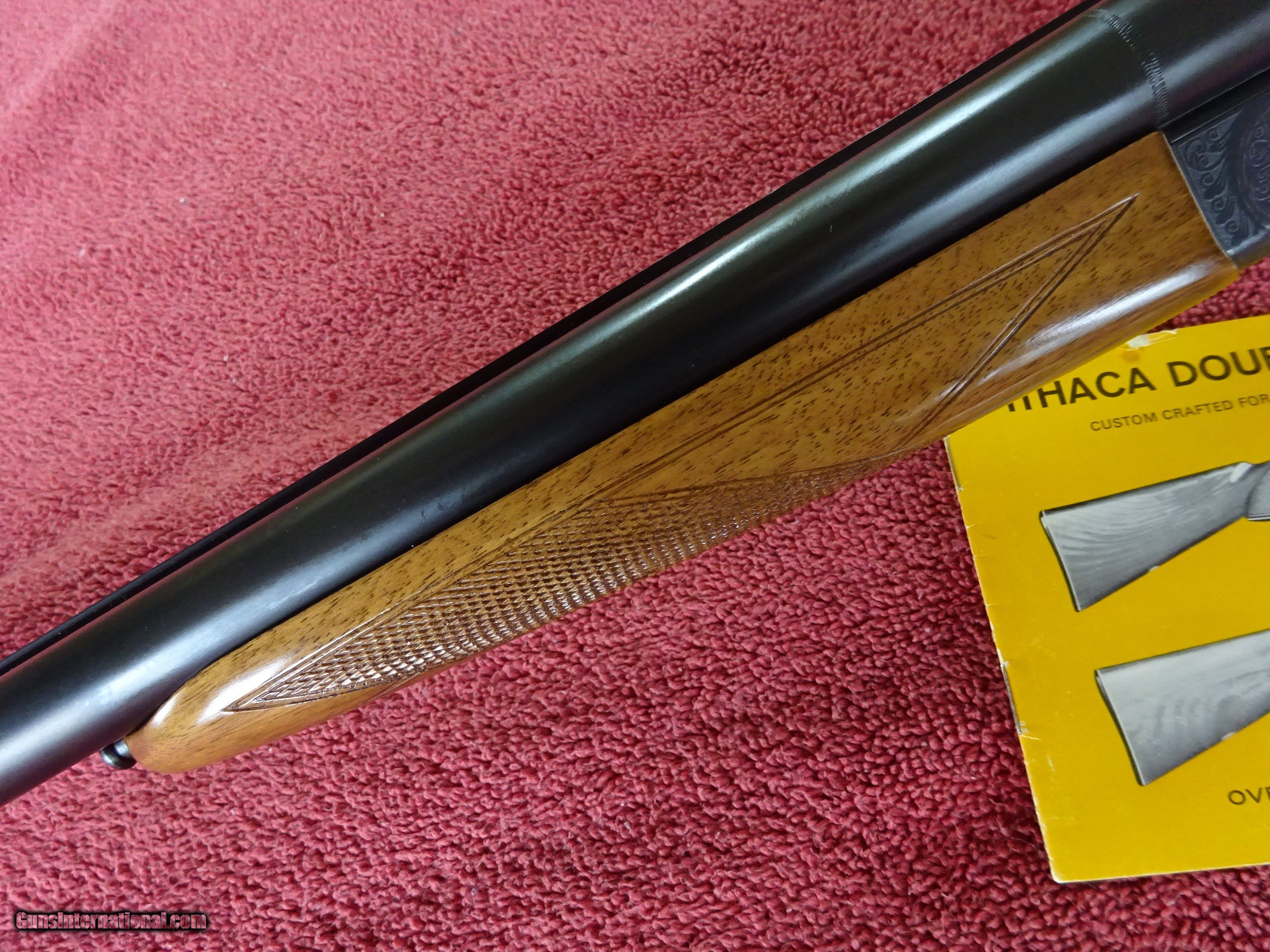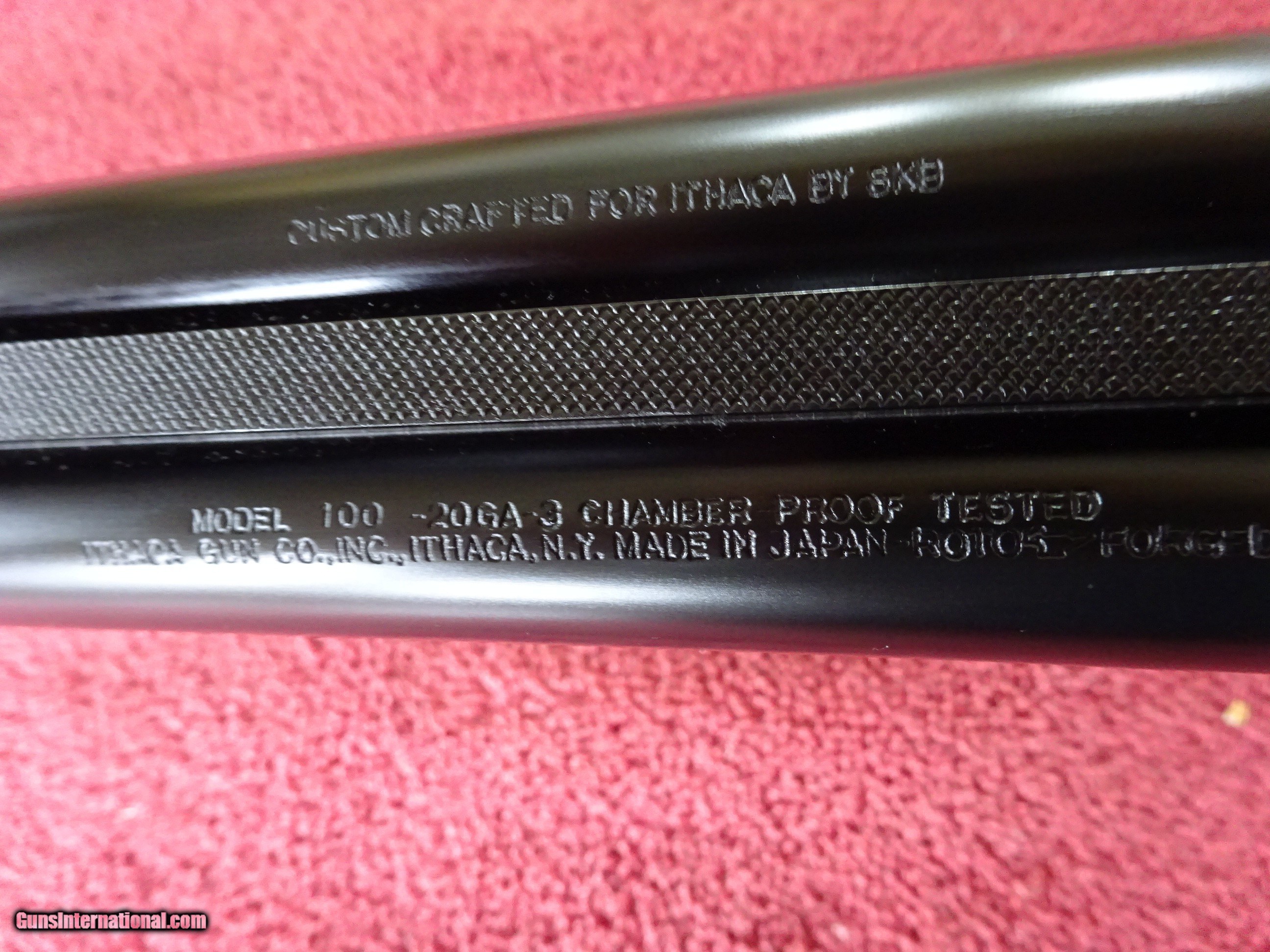 Description: ITHACA SKB MODEL 100, 20 GAUGE. 25" BARRELS, IMCYL. AND MODIFIED, 3" CHAMBERS. MIRROR PERFECT BORES, SINGLE SIGHT. MARKED "CUSTOM CRAFTED FOR ITHACA BY SKB". SCALLOPED BOXLOCK FRAME, FULLY ENGRAVED, MALLARD IN FLIGHT ON RIGHT SIDE, PHEASANT ON LEFT SIDE, PLUS SCROLLWORK AND BORDERS, ENGRAVED SCREWS. SINGLE SELECTIVE TRIGGER, AUTO SAFETY. PISTOL GRIP STOCK, SPLINTER FOREARM, ORIGINAL GRIP CAP AND ITHACA MARKED BUTTPLATE. OVERALL CONDITION IS LIKE NEW. NO BLUE WEAR, NEAR PERFECT CHECKERING AND WOOD FINISH, 1 1/2" X 2 1/2" X 14", 5 POUNDS 10 OUNCES. MADE 1967 TO 1977. INCLUDES ORIGINAL INSTRUCTION BOOKLET, 16 PAGES FULLY ILLUSTRATED, NO BOX. $1475.00 + $70.00 Insured shipping to an FFL address. Layaway is available. See all Pats gun listings on this site! We also have hundreds of ORIGINAL gun company advertising & memorabilia pieces available for sale on our site SPORTINGCOLLECTIBLES. We have no reprints or reproductions. Email for more information. If you need to call, morning or evening is best, and please note the Seller's Inventory number. SOLD Curio/Relic: Yes |