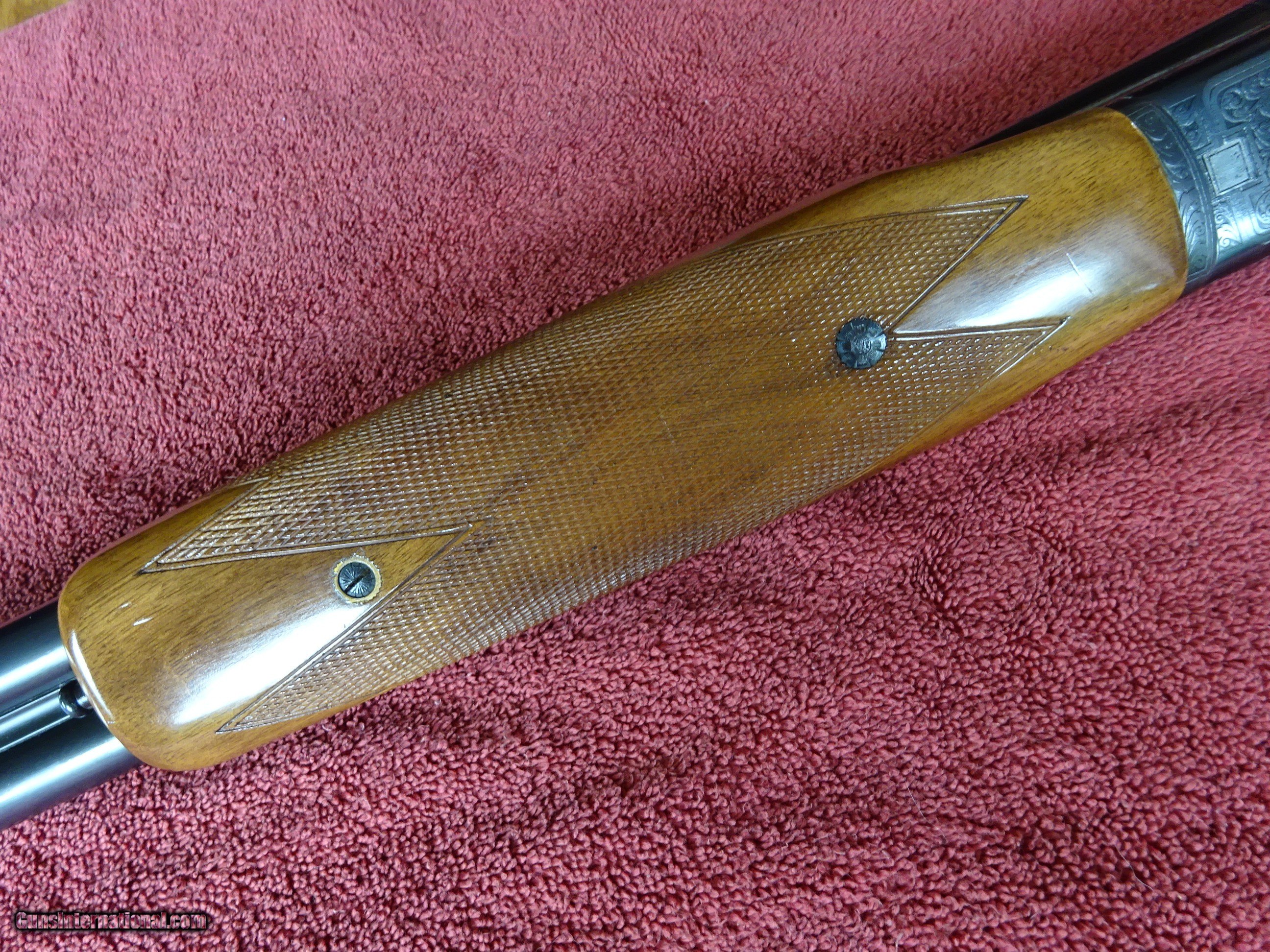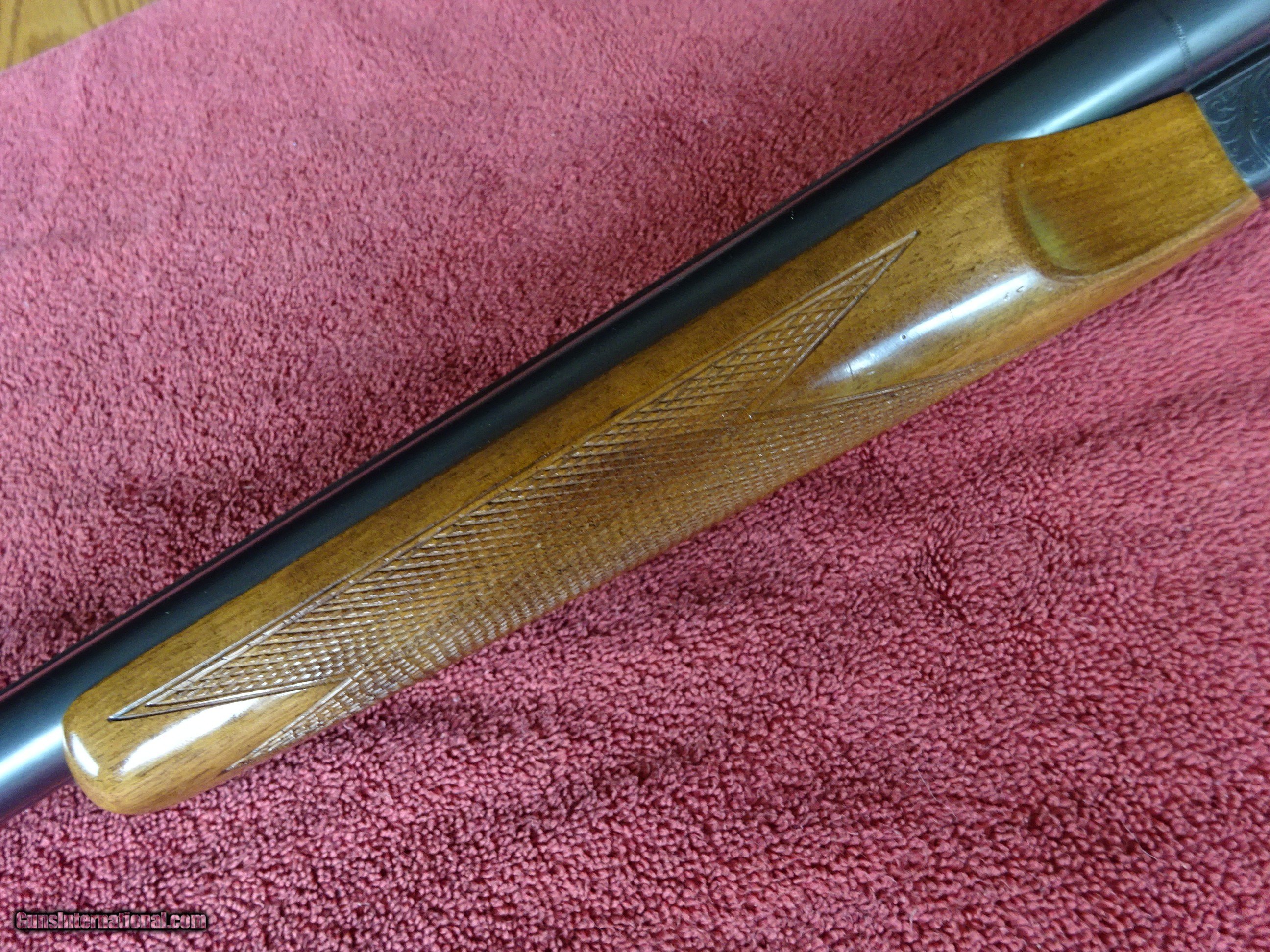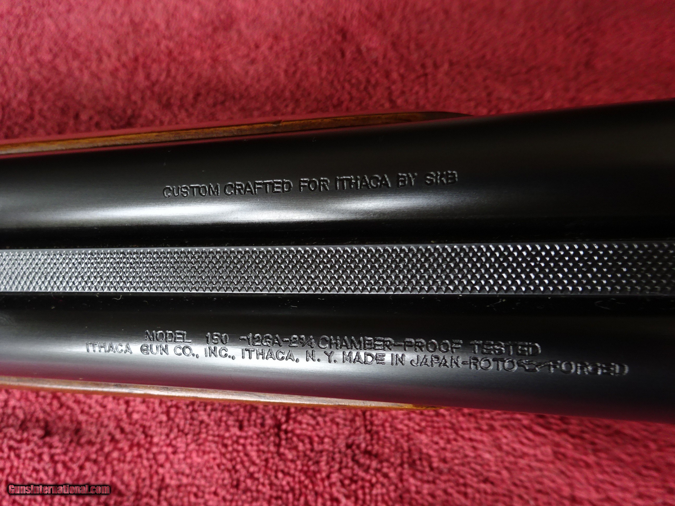 Description: ITHACA-SKB MODEL 150 SIDE BY SIDE 12 GAUGE. EXTRACTORS, 28" BARRELS, MODIFIED AND FULL, 2 3/4" CHAMBERS, MARKED "CUSTOM CRAFTED FOR ITHACA BY SKB". 100% BRIGHT BLUE, MIRROR PERFECT BORES, SINGLE SIGHT. SCALLOPED BOXLOCK FRAME, GAME SCENE ENGRAVING PATTERN - DUCK IN FLIGHT ON RIGHT SIDE, PHEASANT ON LEFT SIDE, PLUS SCROLLWORK AND FINE LINE BORDERS, SINGLE SELECTIVE TRIGGER. FRAME, TRIGGERGUARD AND FOREARM IRON ALSO HAVE 100% BLUE. PISTOL GRIP STOCK, BEAVERTAIL FOREARM, EXCELLENT WOOD AND CHECKERING. ORIGINAL GRIP CAP AND BUTTPLATE, 1 1/2" X 2 1/2" X 14 1/8". EXACTLY SEVEN POUNDS. MADE FOR ONLY 2 YEARS, 1972-1974. SCARCE GUN IN 100% ORIGINAL CONDITION. $1450.00 + $70.00 Insured shipping to an FFL address. Layaway is available. See all Pats gun listings on this site! We also have hundreds of ORIGINAL gun company advertising & memorabilia pieces available for sale on our site SPORTINGCOLLECTIBLES. We have no reprints or reproductions. Email for more information. If you need to call, morning or evening is best, and please note the Seller's Inventory number. SOLD Curio/Relic: Yes |