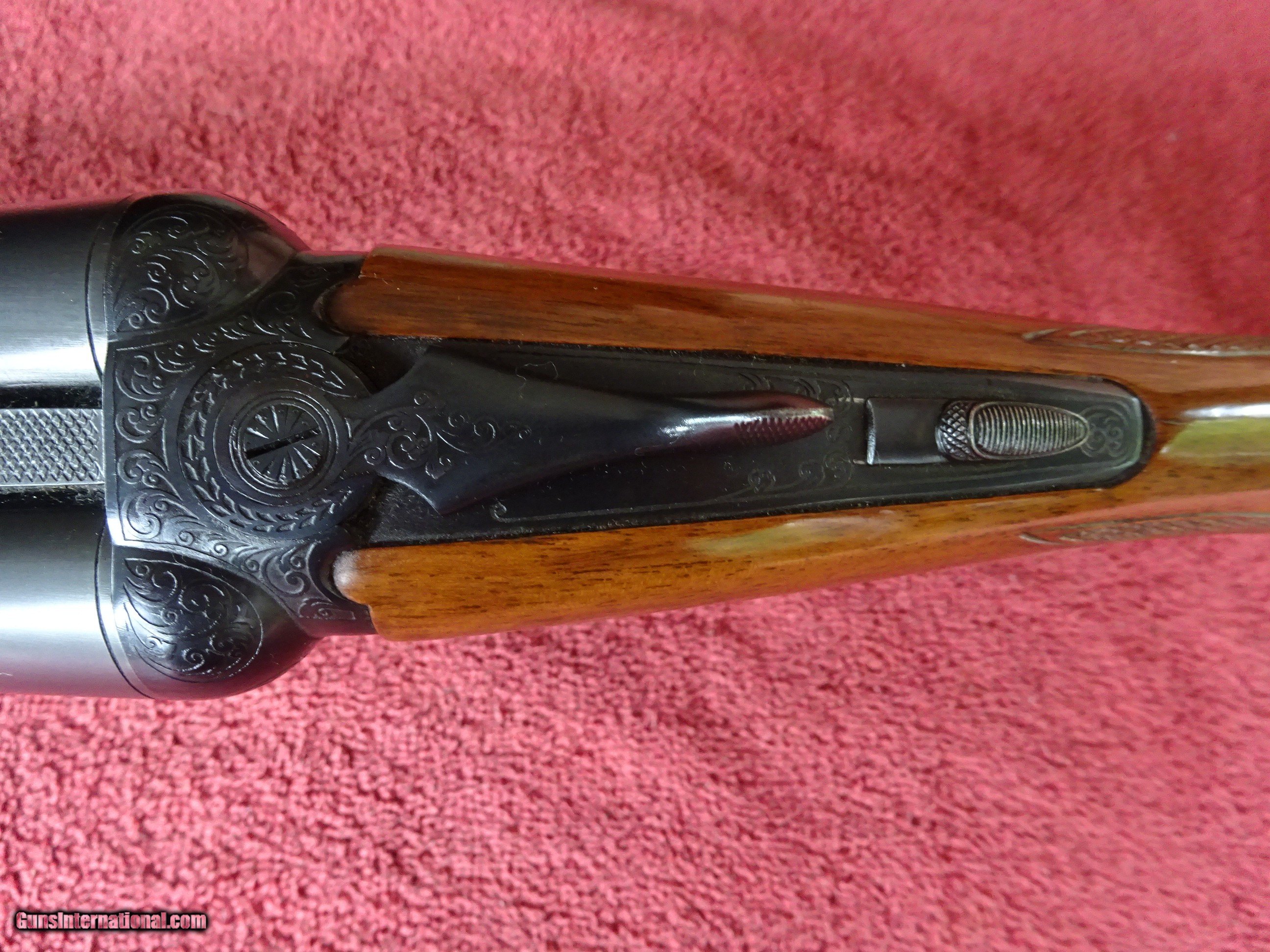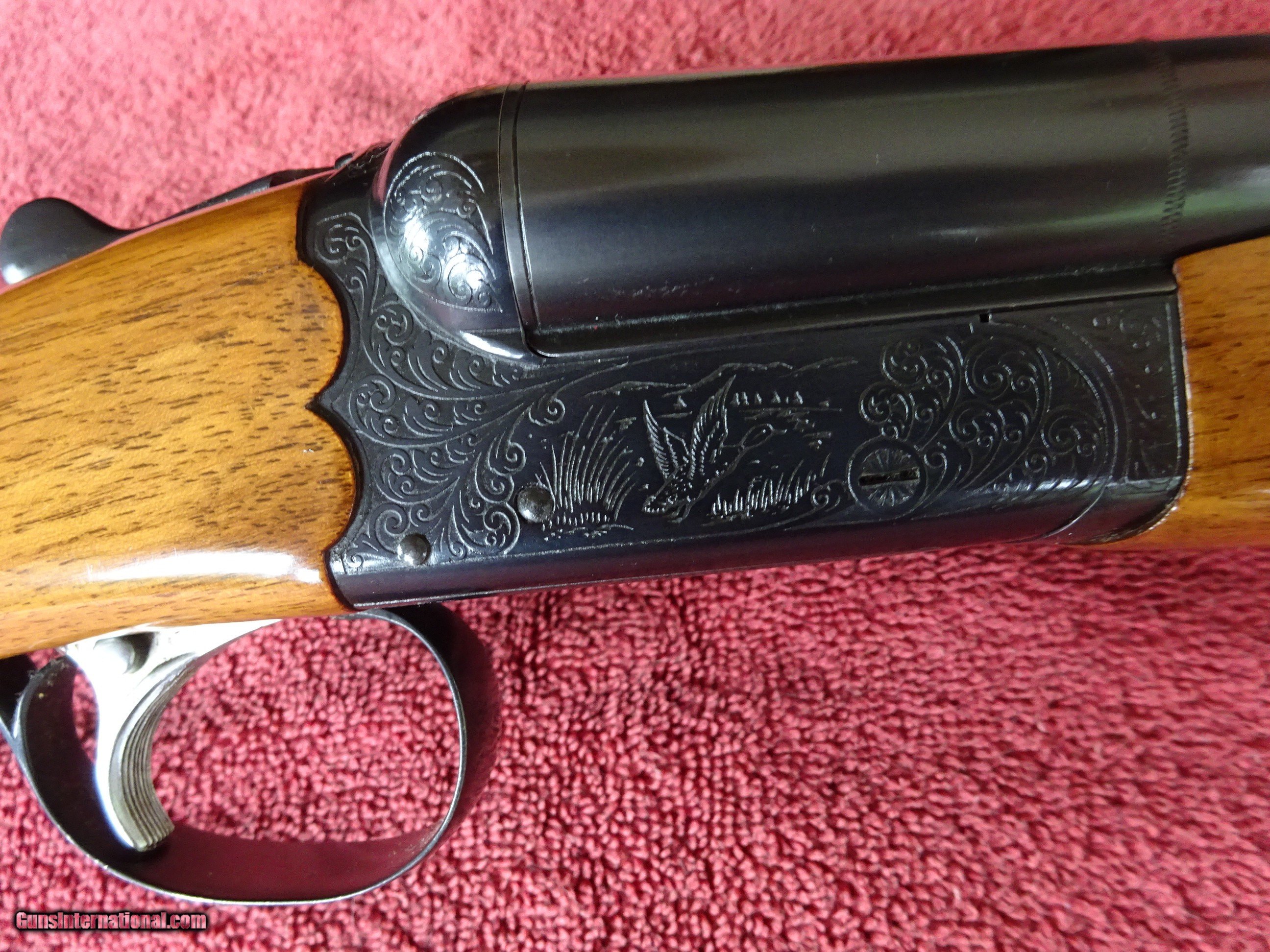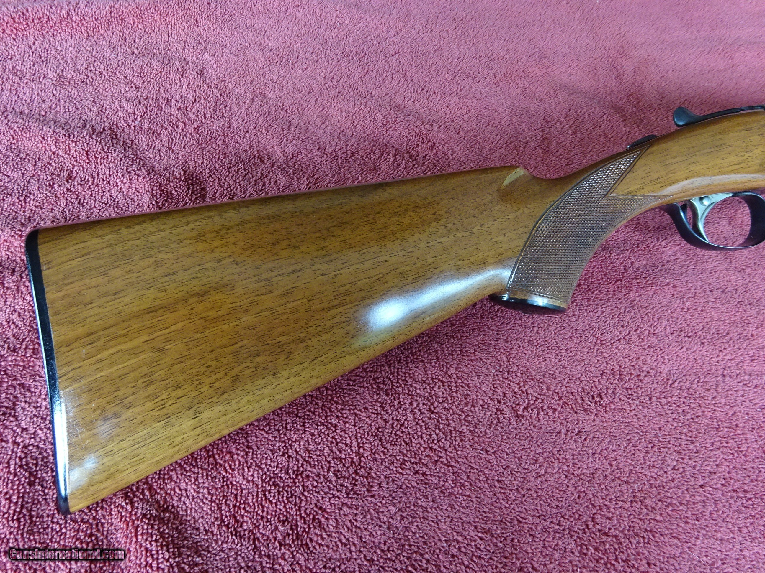 Description: ITHACA-SKB MODEL 150 SIDE BY SIDE 12 GAUGE. EXTRACTORS, 28" BARRELS, MODIFIED AND FULL, 2 3/4" CHAMBERS, MARKED "CUSTOM CRAFTED FOR ITHACA BY SKB". 100% BRIGHT BLUE, MIRROR PERFECT BORES, SINGLE SIGHT. SCALLOPED BOXLOCK FRAME, GAME SCENE ENGRAVING PATTERN - DUCK IN FLIGHT ON RIGHT SIDE, PHEASANT ON LEFT SIDE, PLUS SCROLLWORK AND FINE LINE BORDERS, SINGLE SELECTIVE TRIGGER. FRAME, TRIGGERGUARD AND FOREARM IRON ALSO HAVE 100% BLUE. PISTOL GRIP STOCK, BEAVERTAIL FOREARM, EXCELLENT WOOD AND CHECKERING. ORIGINAL GRIP CAP AND BUTTPLATE, 1 1/2" X 2 1/2" X 14 1/8". EXACTLY SEVEN POUNDS. MADE FOR ONLY 2 YEARS, 1972-1974. SCARCE GUN IN 100% ORIGINAL CONDITION. $1450.00 + $70.00 Insured shipping to an FFL address. Layaway is available. See all Pats gun listings on this site! We also have hundreds of ORIGINAL gun company advertising & memorabilia pieces available for sale on our site SPORTINGCOLLECTIBLES. We have no reprints or reproductions. Email for more information. If you need to call, morning or evening is best, and please note the Seller's Inventory number. SOLD Curio/Relic: Yes |