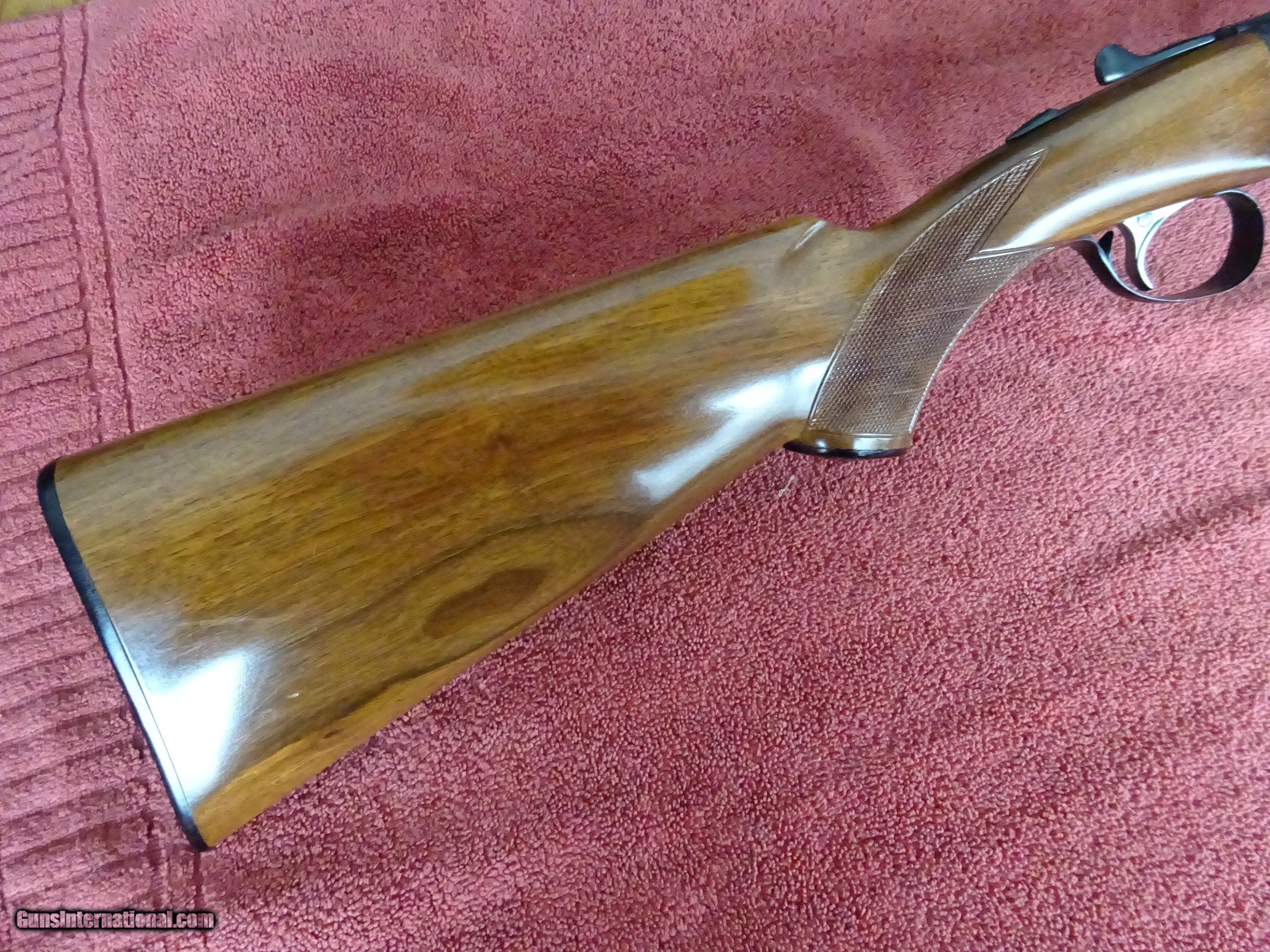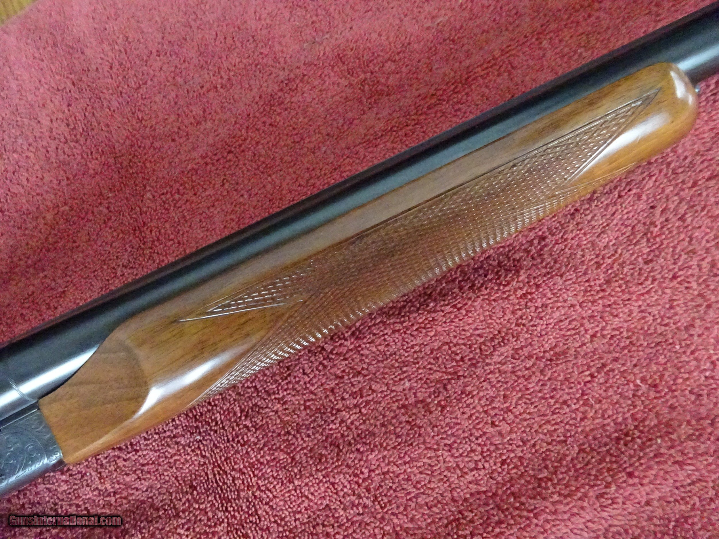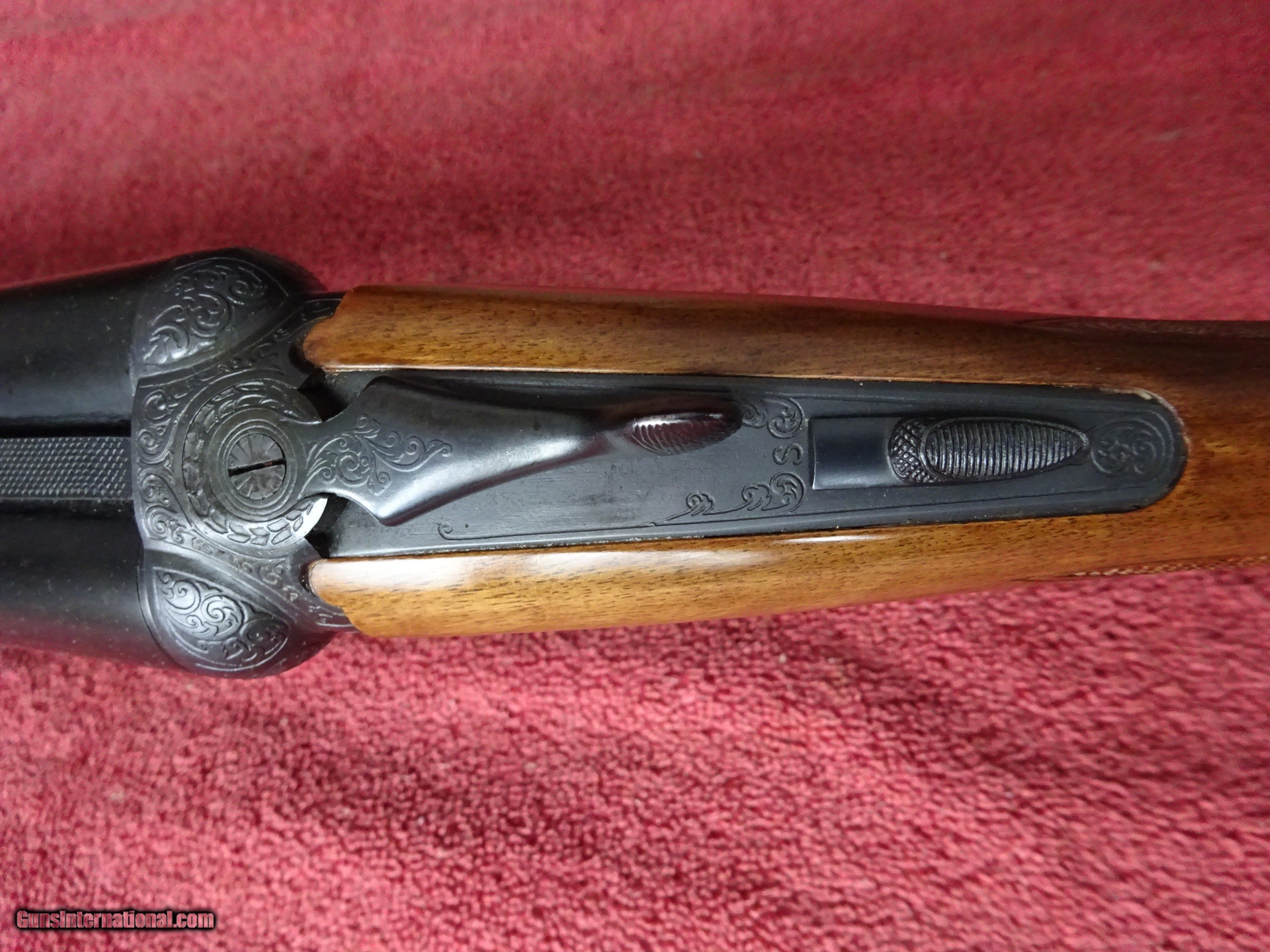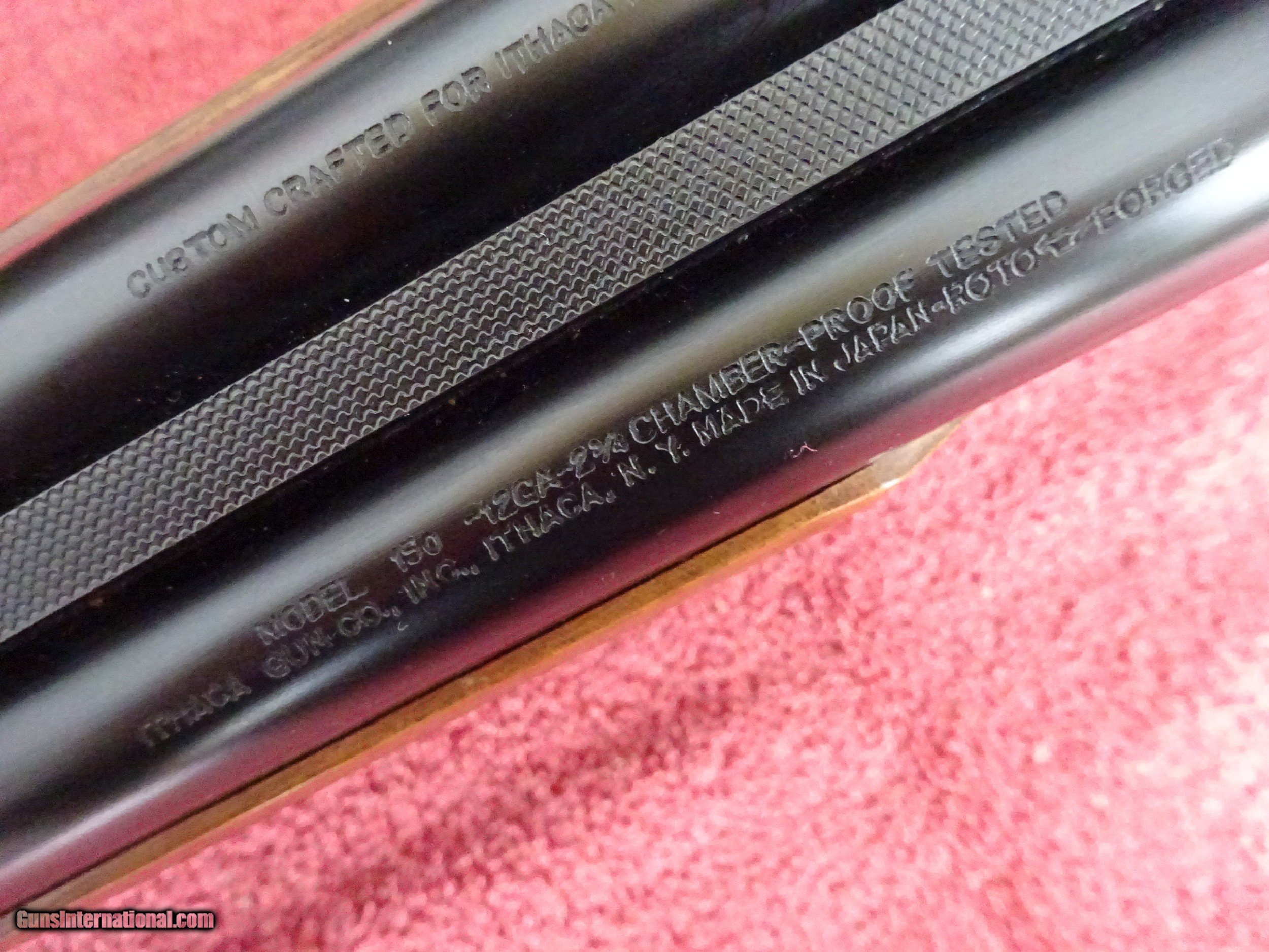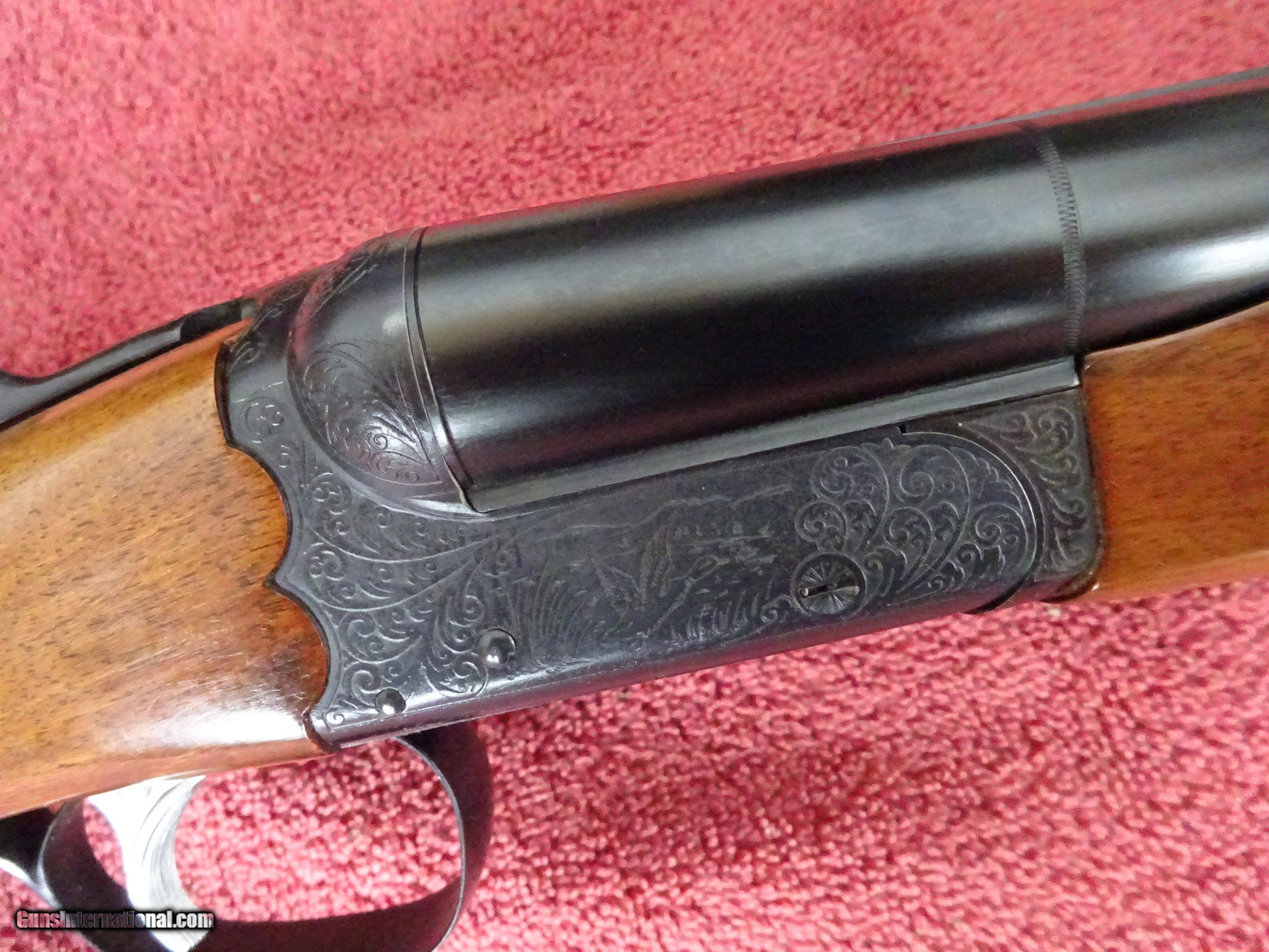 Description: ITHACA SKB MODEL 150 SIDE BY SIDE. 12 GAUGE 28" BARRELS, MODIFIED AND FULL, 2 3/4" CHAMBERS, 100% BLUE, MIRROR PERFECT BORES, SINGLE SIGHT. SCALLOPED FRAME, FULLY ENGRAVED WITH A MALLARD IN FLIGHT ON RIGHT SIDE AND PHEASANT ON LEFT SIDE, PLUS SCROLLWORK AND BORDERS, SINGLE SELECTIVE TRIGGER, EXTRACTORS. PISTOL GRIP STOCK, BEAVERTAIL FOREARM, ORIGINAL GRIP CAP AND BUTTPLATE. LIKE NEW, 100% ORIGINAL CONDITION. NO INDICATION THE GUN WAS SHOT. THE MODEL 150 PRODUCTION WAS LIMITED. MADE ONLY 1972-1974. SCARCE GUN. $1575.00 + $50.00 Insured shipping to an FFL address. See all Pats gun listings on this site! We also have hundreds of pieces of ORIGINAL gun company advertising & memorabilia available for sale on our site SPORTINGCOLLECTIBLES. We have no reprints or reproductions. Email for more information. SOLD Shotgun Gauge: 12 Gauge |