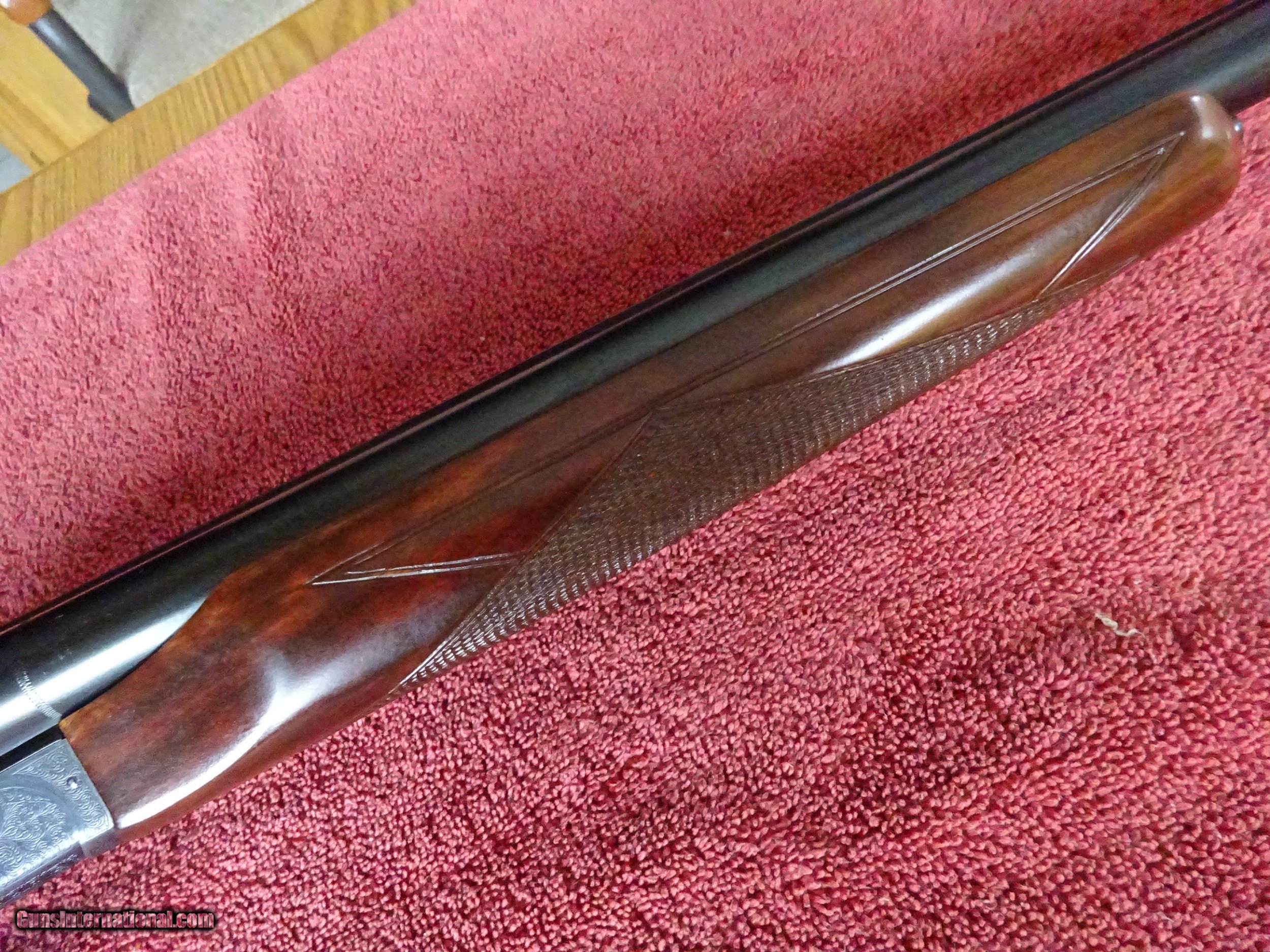 Description: ITHACA SKB MODEL 280 20 GAUGE. 28" BARRELS, MODIFIED AND FULL, 100% BLUE, MIRROR PERFECT BORES, TWIN SIGHTS, 3" CHAMBERS, AUTOMATIC EJECTORS. SINGLE SELECTIVE TRIGGER, FULLY ENGRAVED, 100% COVERAGE, GAME BIRDS AND TINY FINE SCROLLWORK. STRAIGHT GRIP STOCK, BEAVERTAIL FOREARM, FINE CHECKERING, ATTRACTIVE WOOD WITH DARK STREAKS. ORIGINAL BUTTPLATE, 1 1/2" X 2 1/2" X 13 3/4", 6 1/4 POUNDS. THE GUN SHOWS VIRTUALLY NO WEAR, NO INDICATION OF EVER BEING FIRED. INCLUDES THE ORIGINAL INSTRUCTION BOOKLET DATED 1968. $1795.00 + $45.00 Insured shipping to an FFL address. See all Pats listings We also have hundreds of pieces of ORIGINAL gun company advertising & memorabilia available for sale. We have no reprints or reproductions. Email for more information. SOLD |