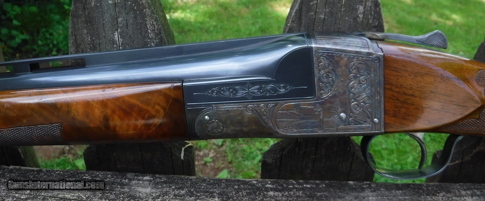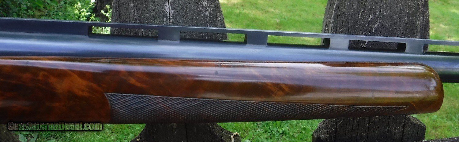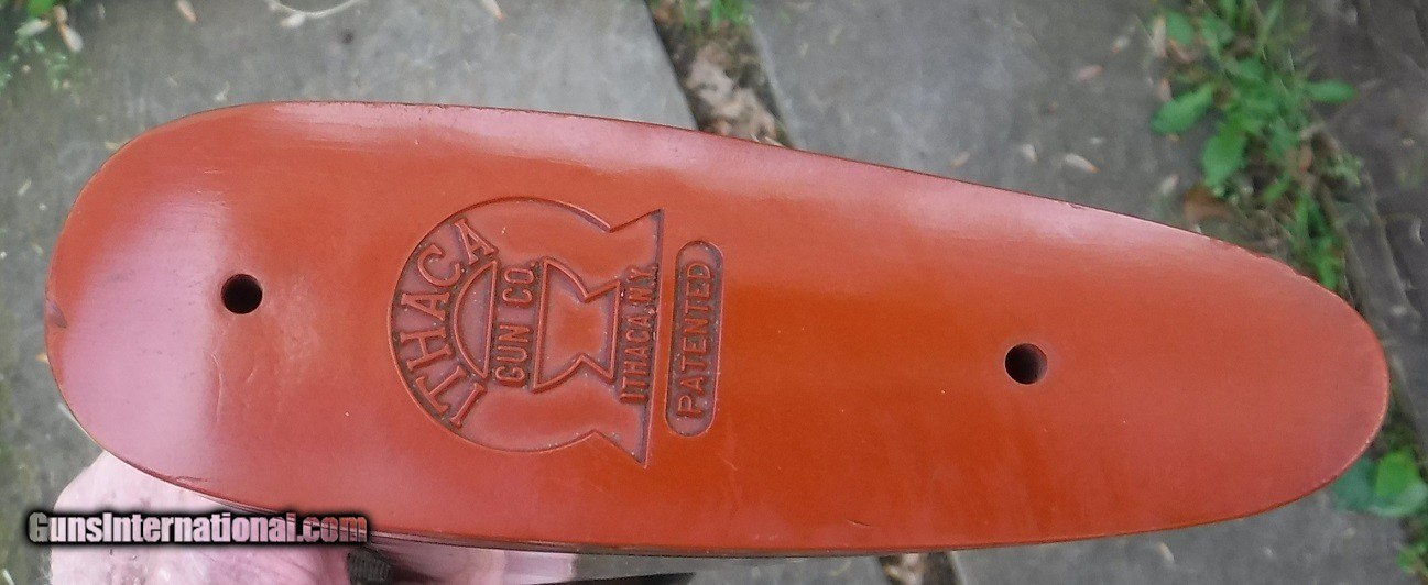 Description: ITHACA 4 E SINGLE BARREL TRAP - KNICERBOCKER MODEL - 32" VENT RIB CHOKED FUL LL ( .042) - LOP 14 3/8" OVER ITHACA SUN BURST PAD - DROP COMB 1 1/2" - DROP HEEL 1 3/4" - METAL BLUE IS 99.9% - CASE COLORS ON ACTION ARE 98% - - WOOD IS VERY GOOD WITH ONLY A FEW SLIGHT HANDLING MARKS - ORIGINAL VARNISH FINNISH SHOWING SOME CRAZING , AS THE ORIGINAL FINNISH WAS PRONE TO DO WITH AGE. - RECEIVER ENGRAVING HAS TRAP SHOOTER ON LEFT SIDE AND INDIAN WITH BOW ON RIGHT SIDE. - TOP LEVER IS VERY FAR RIGHT OF CENTER - WEIGHT 8 LBS 9 OZS. - THIS IS AN EXCEPTIONALY CLEAN AND ALL ORIGINAL 4 E READY FOR A COLECTION OR THE TRAP FIELD. SOLD |