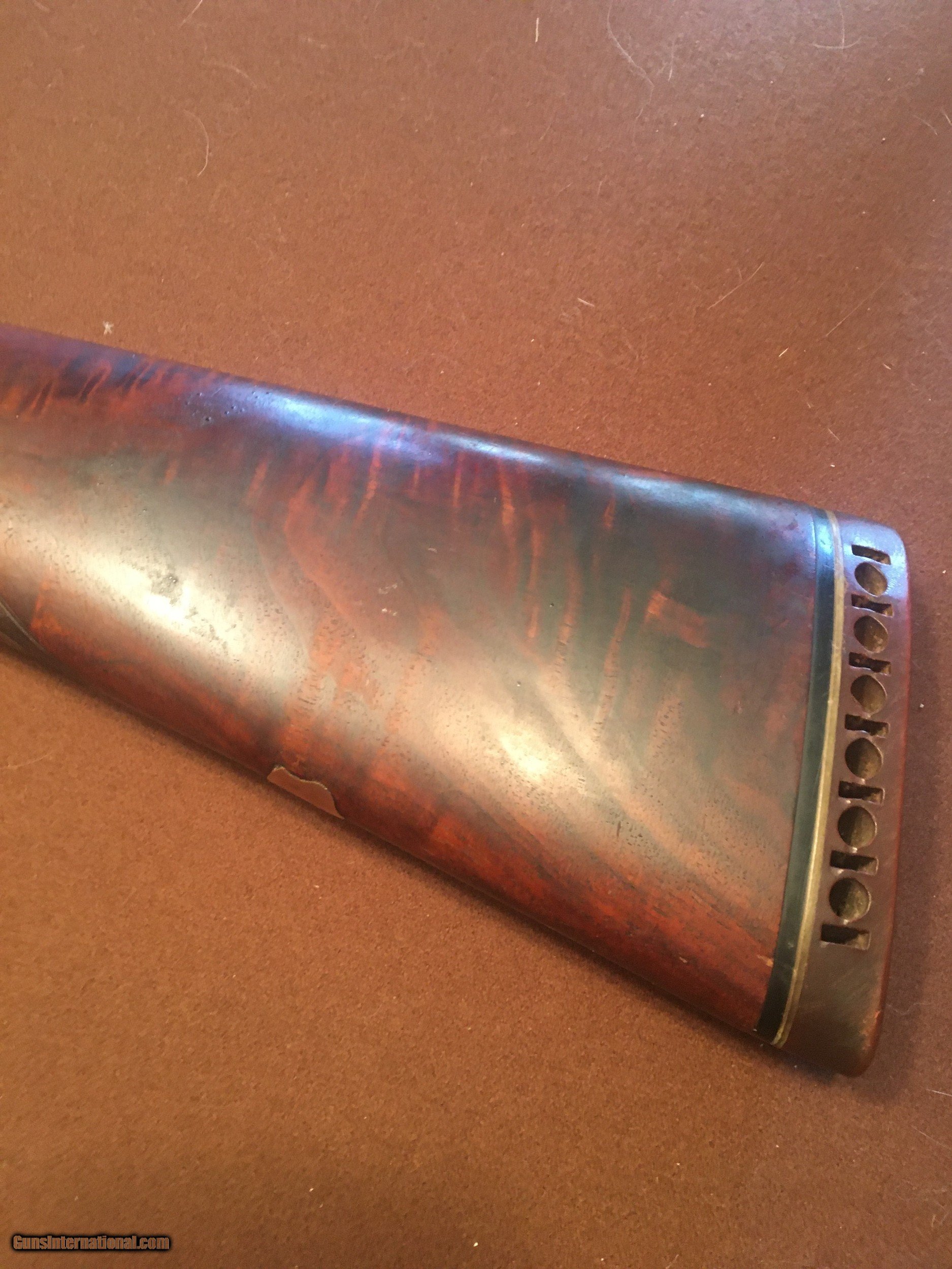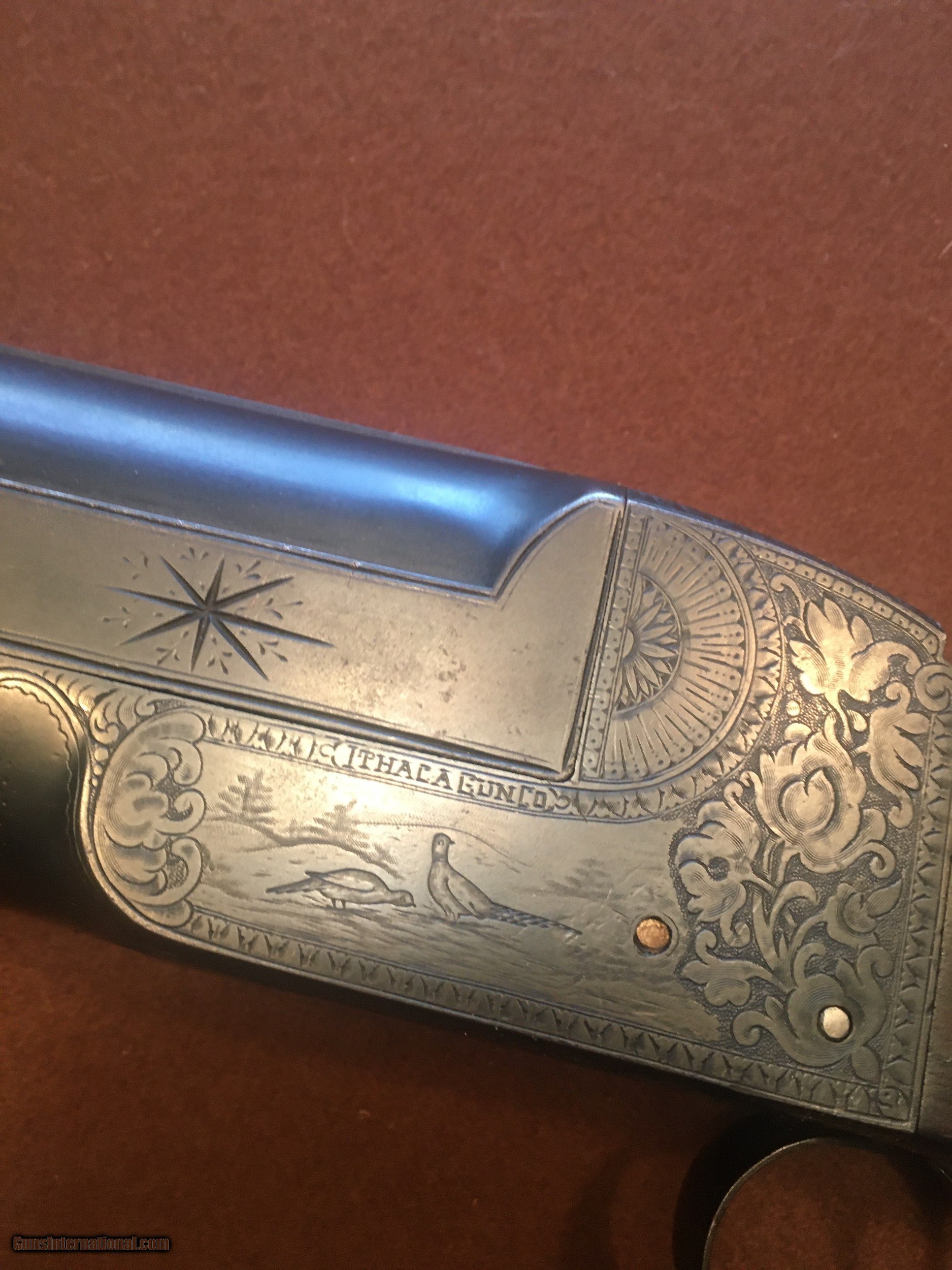 Description: Scarce First Year Ithaca Fleus Single Barrel Trap 12 Guage Grade 4 Deluxe Engraved Shotgun . High Quality well figured walnut stocks with beautiful fine Fleus De Lis checkering .Very good overall original condition Serial # 260xxx .Very early first year Grade 4 example before Ithaca switched their Grade 4 pattern to the Federal Eagle and Shooters on a firing line . This one has the earlier and scarce extensive Arabesque style with a pheasant game scene on the left side of the receiver and field dog on point on the right .The receiver shows very little blue loss . All markings are crisp . 32" vented rib barrel is very good with only very light scattered surface wear .Bright shiny bore . Gun locks up tight with lever still to the right .Small tight repair to shoulder stock top left of lever . Beavertail forend has a couple closed cracks approaching the receiver .The single trigger function is currently not working and will need repair ."Blue Line" recoil pad is still serviceable . 14 1:2" LOP . Sold as is , no returns .I'll pay shipping and insurance CONUS only . Ships my FFL guy to your FFL guy .United States Postal Money Order Only accepted . Can't beat the price in this condition Good Luck SOLD Shotgun Gauge: 12 Gauge, 12 Gauge Manufacturer: Ithaca Fleus 12 Guage Model: Single Barrel Trap Serial Number: 260xxx Barrel Length: 32” Chambers: 2 3/4” Condition: Very Good Metal Condition: Very Goid Wood Condition: Very Good Bore Condition: Bright and Shiny Butt Pad: Blue Line LOP: 14 1/2” Rib: Vented Finish: Blue Sights: Front and mid Manufacture Date: 1915/16 |