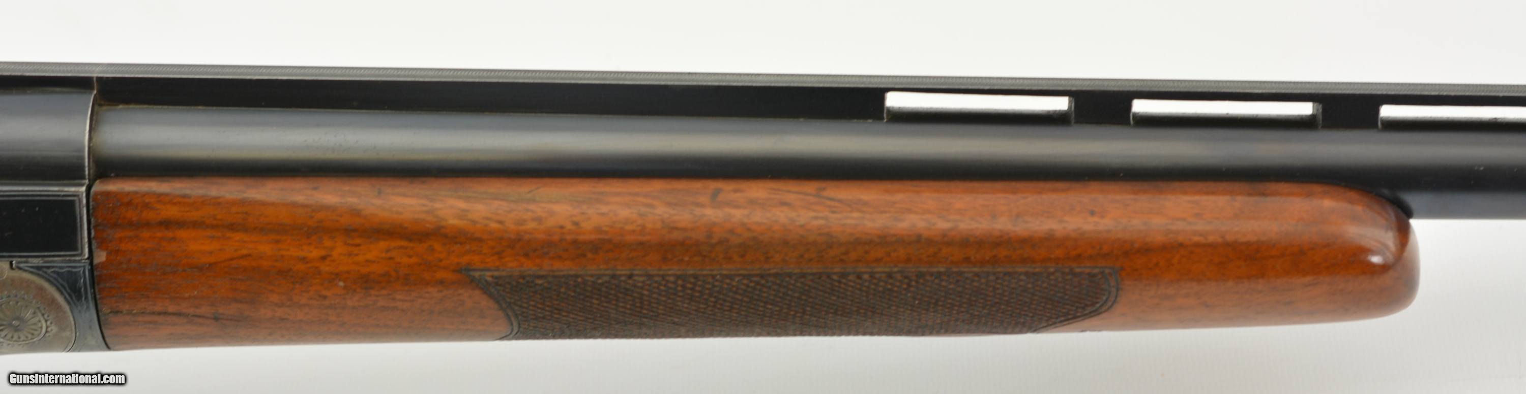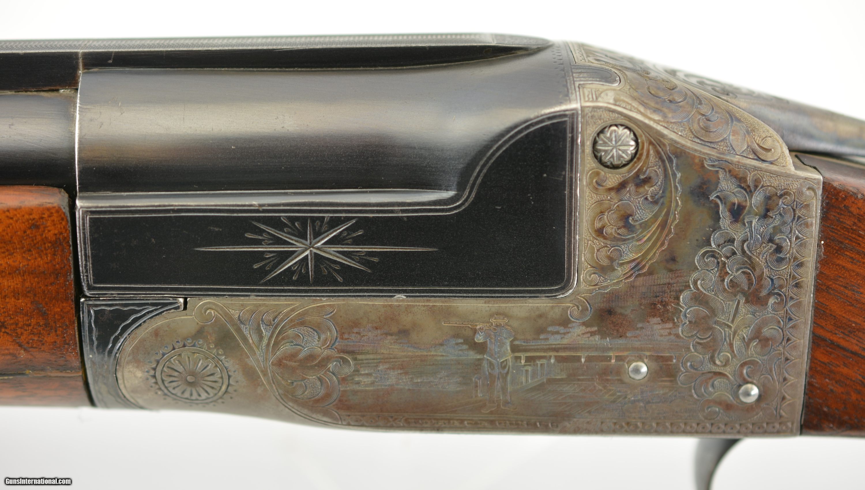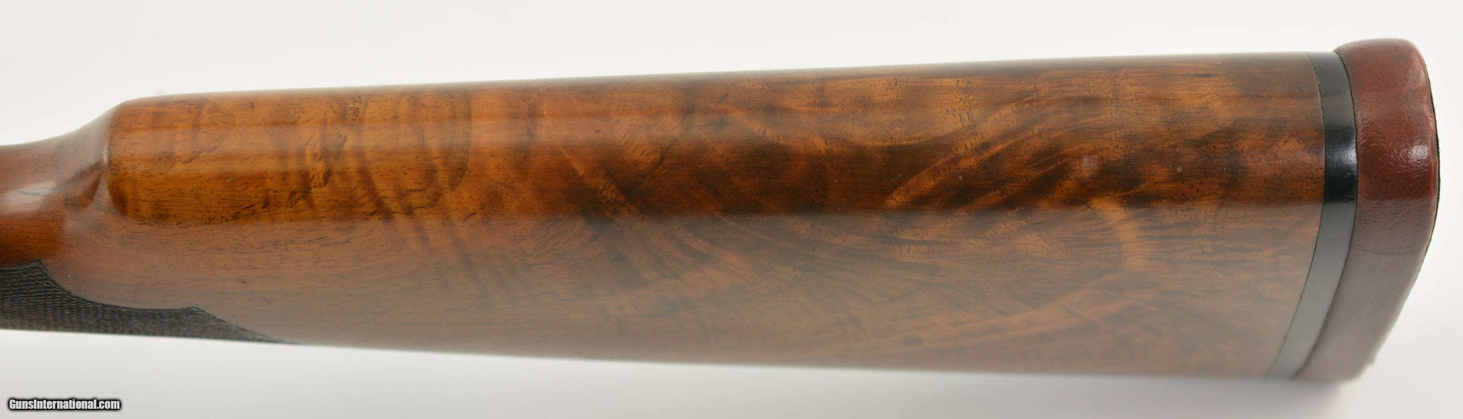 Description: Serial #290153-T, 12 Ga. (2 3/4"), 32" VR barrel choked full with a fine, bright bore that has very mild freckling ahead of the forcing cone. The barrel retains about 95-97% original blue, with some silvering at the muzzle, as well as along some of the high edges. The Grade 4 engraved frame retains 60-70% of the original color case-hardening, still quite vivid on the top of the frame and the left flat, with the right side toning to mottled plum-gray, the carry point on the bottom of the frame has a warm plum-brown patina. The typical open flowing Ithaca foliate engraving is crisp with the right flat featuring the American Eagle, land derby-wearing trap shooter on the left. The straight grip American walnut buttstock rates very fine with scattered light handling marks and small blemishes in the origial varnish, and a very nice fleur-de-lis checkering pattern which has nice grain and figure. The shield-shaped monogram plate along the toeline is blank, and the length of pull to the period recoil pad is 14 1/2 inches with drops of 1 1/2' and 2 1/2 inches respectively. The semi-beavertail target style forearm rates very good and has four small cracks at the iron. The fit is a bit loose. The lock-up is still quite tight, with the lever at about dead center with the gun closed. There is a slight amount of lateral play, but the barrel remains on-face. The rib features dual ivory target beads and the gun is functional, with a robust ejector. This is a handsome Grade 4 Trap and rates very good plus condition overall. SOLD Manufacturer: Ithaca Model: Trap Serial Number: 290153-T Caliber Info: 12 Ga. Gauge Info: 12 Ga. |