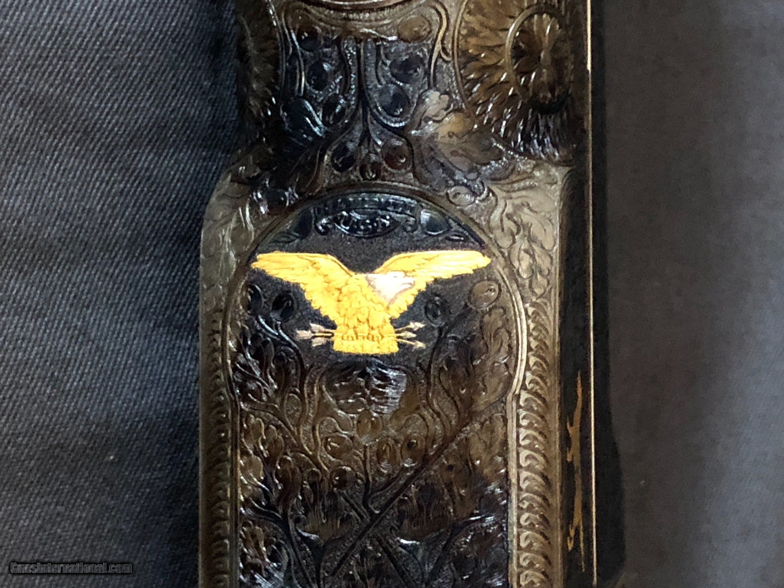 Description: SOLD !!! A Dandy of a High Grade American Single Barrel Trap gun! Professionally restored by Bachelder Master Gunmakers. Rare! Locks up tight . Bright bores. Spectacular engraving. Nice wood. See photos for condition. Please call Mark 715-814-1295 Pack and ship $45 LAYAWAY: Layaway is available with 1/3 down of final total price including shipping/insurance within 7 days . Balance due in 45 days. Layaway Sales and guns modified at time of sale are FINAL with no refunds, no inspections, no returns. Chokes my be opened to your choice at time of sale for $50 per barrel . SOLD Curio/Relic: Yes Shotgun Gauge: 12 Gauge Manufacturer: ITHACA Model: GRADE 7 FLUES SBT Barrel Length: 34IN Chambers: 2 3/4IN Ejectors: YES Condition: VERY NICE Bore Condition: BRGHT Stock Comb: 1 5/8IN Stock Heel: 1 7/8IN LOP: 13 3/4IN Weight: 8LBS 9OZ Manufacture Date: 1916 Chokes: FULL |