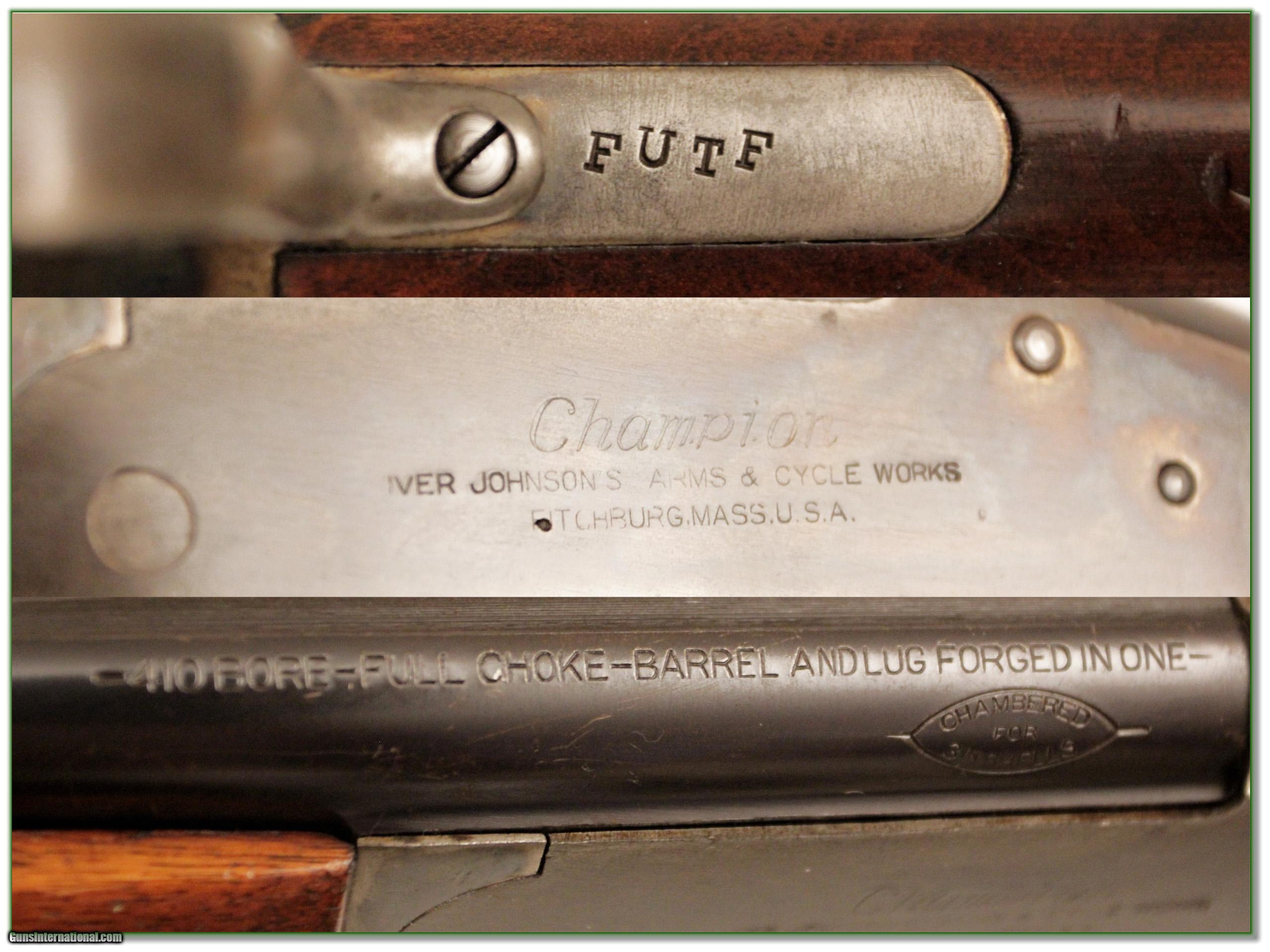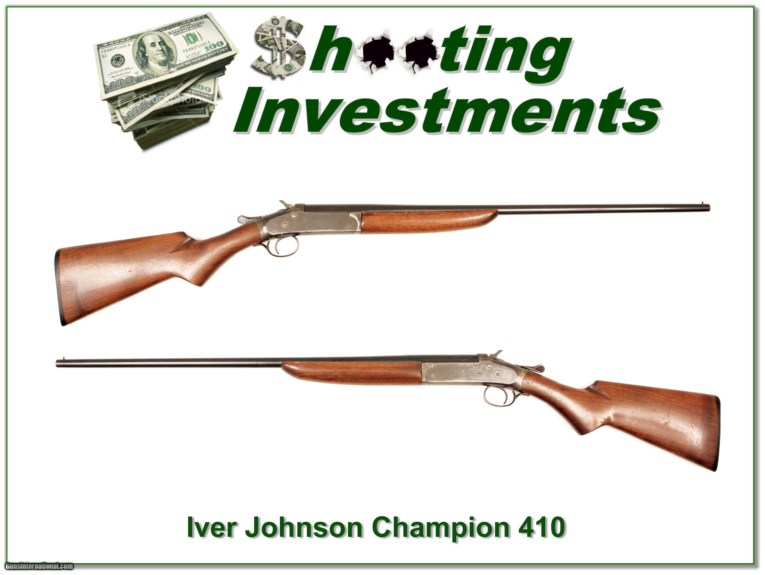 Description: This is a nice example of the vintage Iver Johnson Champion. It is a single shot 410 bore with full choke. I am selling this one on consignment and as such lay-a-way can’t be used. It does of course have the standard 3 day inspection. Shipping and insurance is $35 or $15 more if you want it shipped in a new Plano hard case. Please email me with any questions or larger pictures. (I now consign quality firearms only 10%! Let me know if you have any you would like to sell!) [16-0308] Payment: Payment is by Money Order, Cashiers Check or Personal Check. I can now also accept MasterCard and Visa with a 3% convenience fee. PayPal can be used for some items but never firearms. Please let us know if you would like to pay via PayPal. Shipping: The shipping charge will be listed in each description. It is $35 for most guns. Some heavy guns or those insured for over $2000 will be higher. Shipments to Alaska and Hawaii are higher because air shipment is required. Most firearms are shipped within 5 days of receipt of payment. We prefer shipping at the beginning of the week to avoid firearms in transit over weekends. We package all shipments carefully and insure them for the full purchase price, rounded up to the next $100. In the unlikely event that damage occurs, it is important that you save all packaging material for the claims process. Optics are shipped Priority Mail and most other non-firearm shipments are shipped First Class. Returns: Our return policy is simple. If for any reason you are not pleased with your purchase, you may return your item for a refund. The only exception is ammunition, it cannot be returned. It is important to us that you are happy. Guns cannot be fired or dissembled before returning them and must be returned in the same condition as received. Notification of a return must occur with-in 3 days of receipt at your dealer. Shipping, convenience and dealer fees are not refundable and are the responsibility of the buyer. Lay-a-way: If needed, we offer a 60 day lay-a-way option on most firearms. It is 1/3 now, 1/3 in 30 days and 1/3 in 60 days. Lay-a-way firearm sales are final. Consigning your firearms with Shooting Investments: We will help you get top dollar for your firearms. While most local guns shops charge 20% or more, our fee is only 10% with a minimum of $50. At your local gun shop it might take months to sell. Selling on-line provides instant access to thousands of interested buyers. You won’t find any other on-line dealer willing to sell your firearms for only 10% or listing every gun on 4 separate s. Selling through an House typically costs the seller 15% and the buyer an addition 15% (so 30%) and you have to wait several months to sell and longer to receive funds. If properly priced, we will sell your firearms in a week or two. Send us an email or give us a call and we’ll explain how easy it is for you to get top dollar. Trading: We collect guns and usually just trade for guns we want to add to our collections. We often sell guns for others wanting to purchase one of ours. We find this the most fair to both of us. Our Commission is only 10% and we hold the gun you want until yours sells. Please contact us if you want to sell one of yours to buy one of ours. Help for California Buyers: We are happy to ship to California. It is the buyer’s responsibility to make sure any item you buy is legal in your state. We are also happy to help with your purchase of a firearm from someone other than us. If you see a gun you would like to buy but the seller can’t or won’t ship to California we can help. You buy the gun and have it shipped to us. We’ll then ship it to your California dealer. The cost for this service is only $30 + shipping. Let me know if we can help! SOLD |