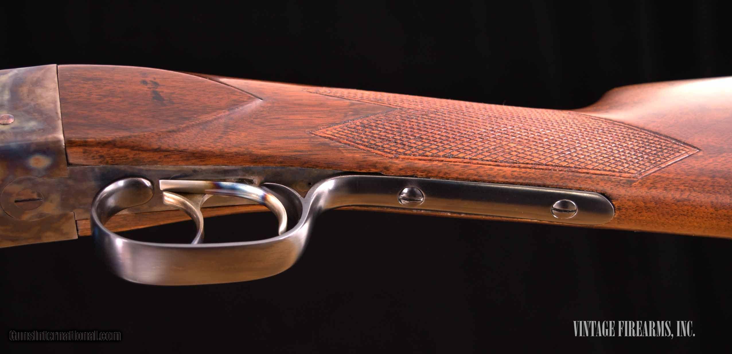 Description: Iver Johnson Hercules .410 Bore EJECTORS, LIKE NEW, ENGLISH STOCK General Specs: Iver Johnson, Year 1930, .410 Gauge, 6lbs 2oz, SxS Serial Number: 959E Now I know that the Iver Johnson Hercules is NOT a Parker, L.C. Smith, or an Ithaca NID. But Iver Johnson was a maker of well-respected guns in the early days of the 20th century and an important part of America's firearm heritage. In the world of vintage American doubles, the .410 bore has always been highly sought after and costly. Of the big 5 makers, only Ithaca, Parker, and L.C. Smith produced the .410, and in miniscule numbers. To purchase one of the above guns in good factory original condition, the price tag starts at $5000 and in the case of the Parker, exceeds $20,000! Enter the Iver Johnson Arms and Cycle Works Hercules Grade side by side in .410 bore. With its case colored frame, checkered walnut stocks, and rust blue barrels it was a quality gun at an affordable price. This cool little .410, sn959E built in about 1930, is a great example of the Iver Johnson Hercules. Built on a “BABY FRAME” scaled .410 frame, this one with ejectors and an English style stock, this is a great little .410 double shotgun. We have completely restored this gun from butt to muzzle. We Ultrasonic cleaned and inspected the inside of this gun (makes it a VFI CERTIFIED GUN WITH A 90 DAY WARRANTY), and it is a very well made, well designed little boxlock with quality forged action parts. Turnbull Restorations did the case color, and the gun has been lubricated and reassembled ready for another 80 years of service. It is very hard to find these little .410’s with desirable ejectors and straight hand stock, so this gun is special and very attractive. An affordable .410 vintage American double for sure. The wood has been nicely restored, not a split or chip anywhere in the wood. A great little gun for your shooting fun and a real find for your collection. An honest gun like this will always be desirable and a good investment. Thanks for looking! Barrels Barrel Length: 26" Chokes: .016 both F/F Bores: mirror Bore Diameter: .408 both % Blue: 100% Chambers: 3" Ribs: tight Sights: single Action Action: tight, right of center Ejectors or Extractors: ejectors, strong, timed Case Color: 100% case color Screws: perfect Engraving: stamped dog on left Trigger Type: double, crisp Trigger Guard Color: 100% Stock Type: english stock/splinter forend LOP: 14 3/16" LOP To End Of Wood: 13 1/4" DAH: 2 3/4" DAC: 1 5/8" Cast: 0 Checkering Condition: excellent Butt Treatment: silvers red rubber There are more photos upon request. We offer a 30 day mechanical warranty on this fine shotgun. Call us for full details. PLEASE SEE MY OTHER FINE VINTAGE FIREARMS. Just open one of my ads and click on the line that says “see all items from this seller” and a very nice list of fine sporting and collectible arms will appear. I have many more fine sxs shotguns not yet listed. Thanks for looking! COME JOIN US on FEBRUARY 24 & 25, 2018 for the FLY FISHING & WINGSHOOTING EXPO at the SPLIT ROCK RESORT in Lake Harmony, PA! We employ a full time gunsmith on premises and can perform alterations to suit your needs within a few weeks of purchase. Payment Methods: Money Order, Certified Check, Personal Check, Wire Transfer Inspection Period / Return Policy: Three Days from the date the item was received. Sales Tax: 6% Michigan Only Shipping & Insurance: Ground $45.00 We ship internationally! Item Condition: Used Requires FFL?: Yes If you have any questions about this item or payment, please email or call us directly, at #616-292-6240. Thanks! Vintage Firearms Inc We employ a full time gunsmith on premises and can perform alterations to suit your needs within a few weeks of purchase. Common requests are: -stock bending to suit your particular requirements -addition of any specified butt pad to increase length of pull -alteration of chokes to suit your shooting preferences -lengthening of chambers and forcing cones -darkening stock color with penetrating stains -restoring any part of the gun including rust blue, charcoal blue, bone and charcoal case color, wood restoration and checkering recuts. If you like one our guns but it needs "tweaked", let us know and we can quote you a time and price. Some enthusiasts like the guns "as found" and others want them "just so". We often list guns as found and let the particular buyer choose how they want their gun to fit or look. SOLD Curio/Relic: Yes |
