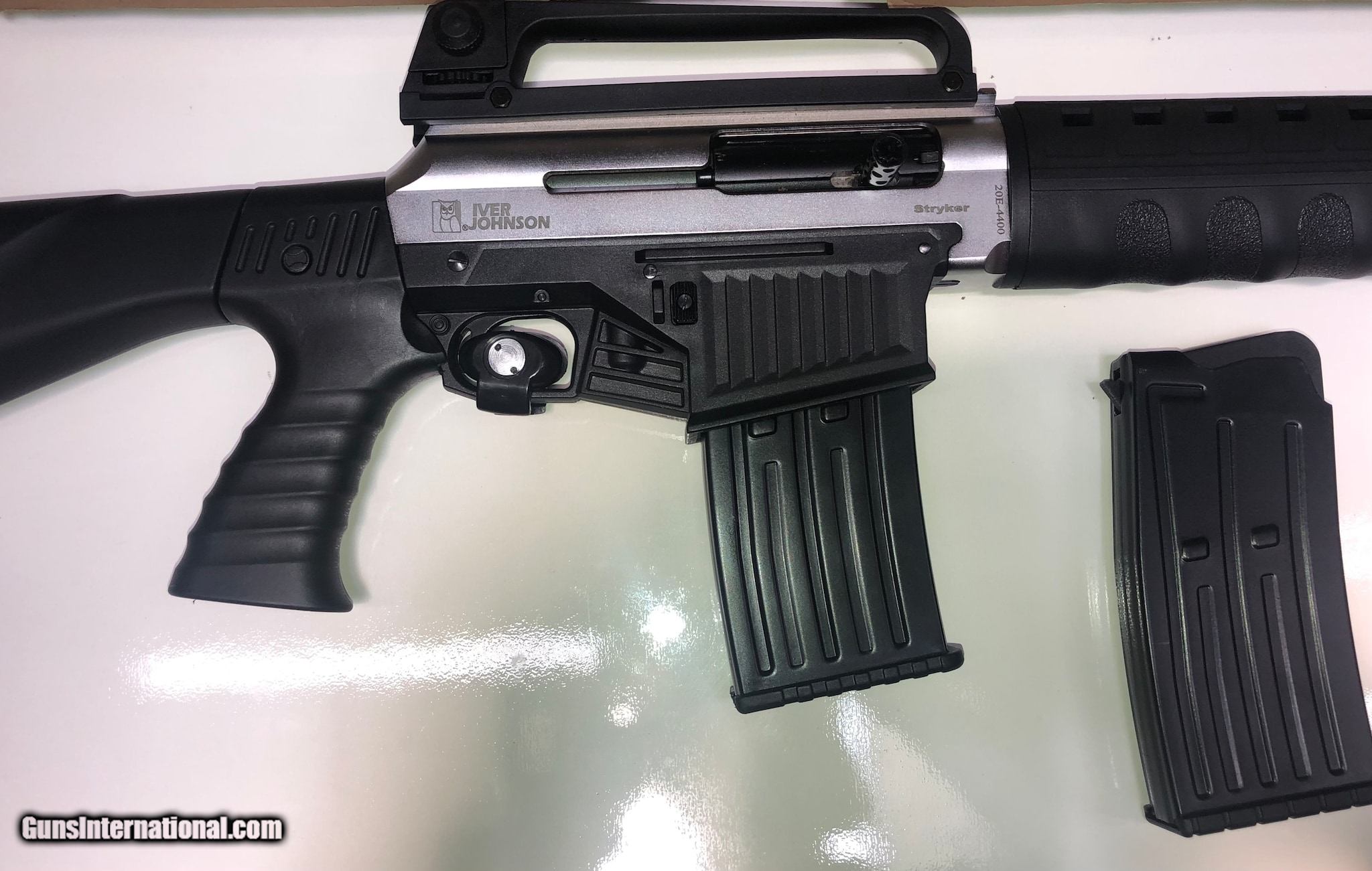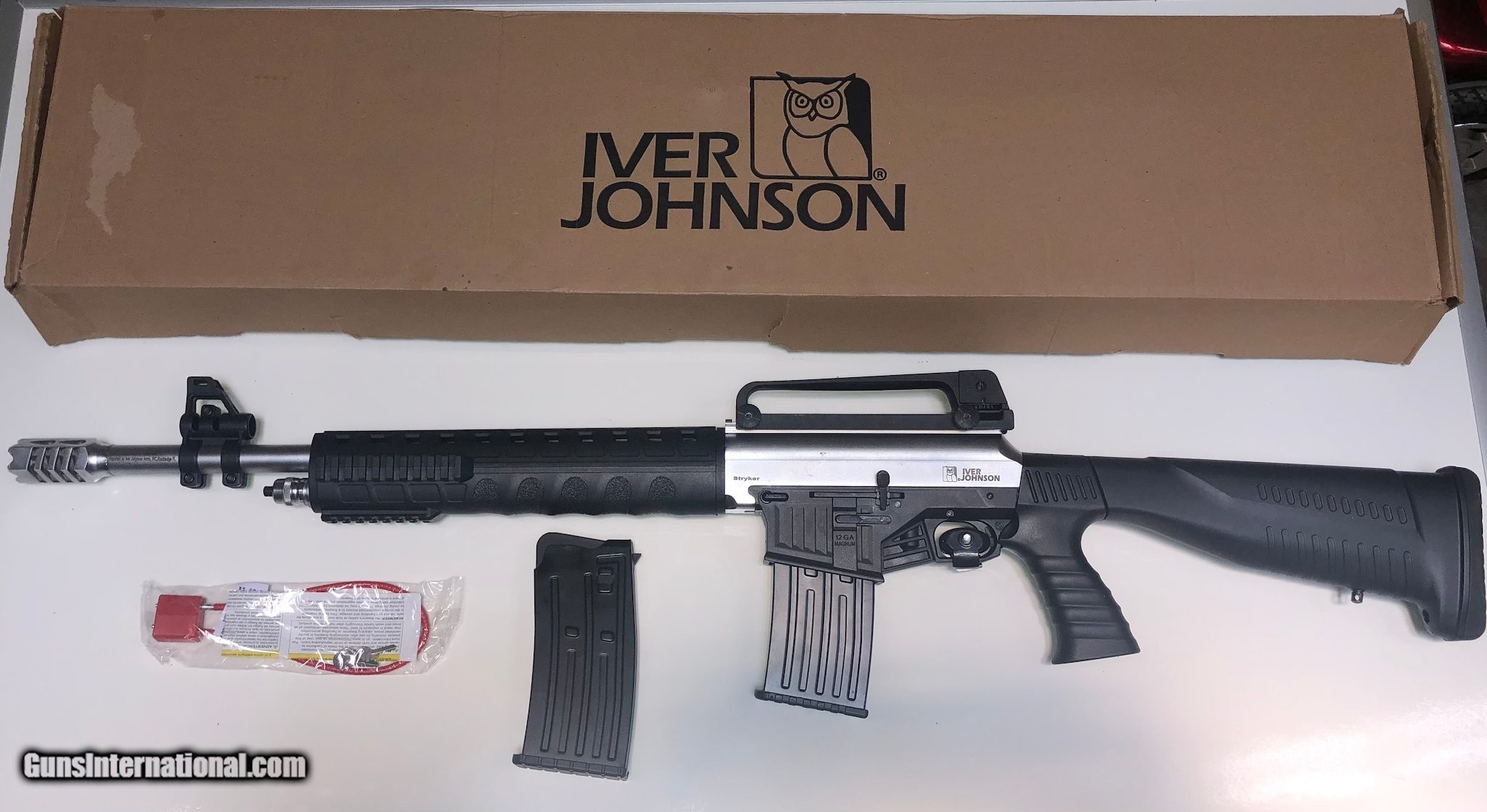 Description: Guns Listing ID: 519740 Iver Johnson 12ga Semi Automatic Shotgun, includes Original box with Trigger Lock along with 2 Magazines total and a removable Muzzle Break. SOLD Manufacturer: IVER JOHNSON Model: STRYKER Condition: Used - Non-Certified Barrels: 20 BARREL Gauge Info: 12GA Finish: BLACK AND GRAY |