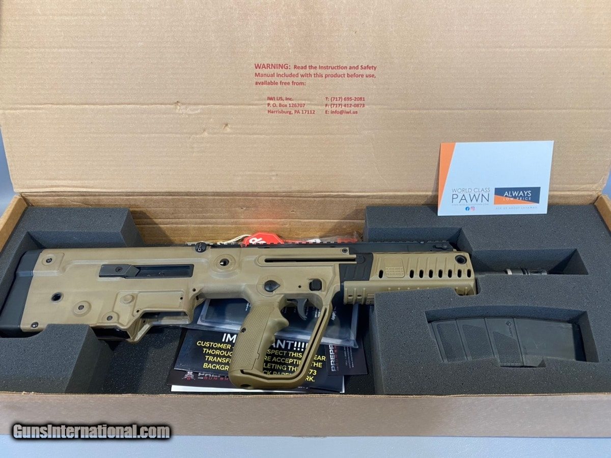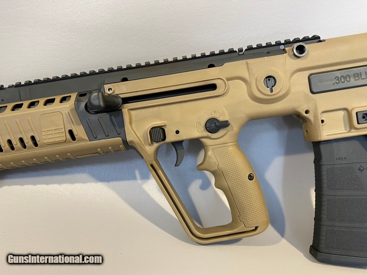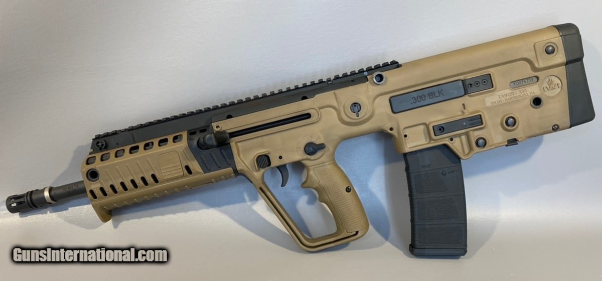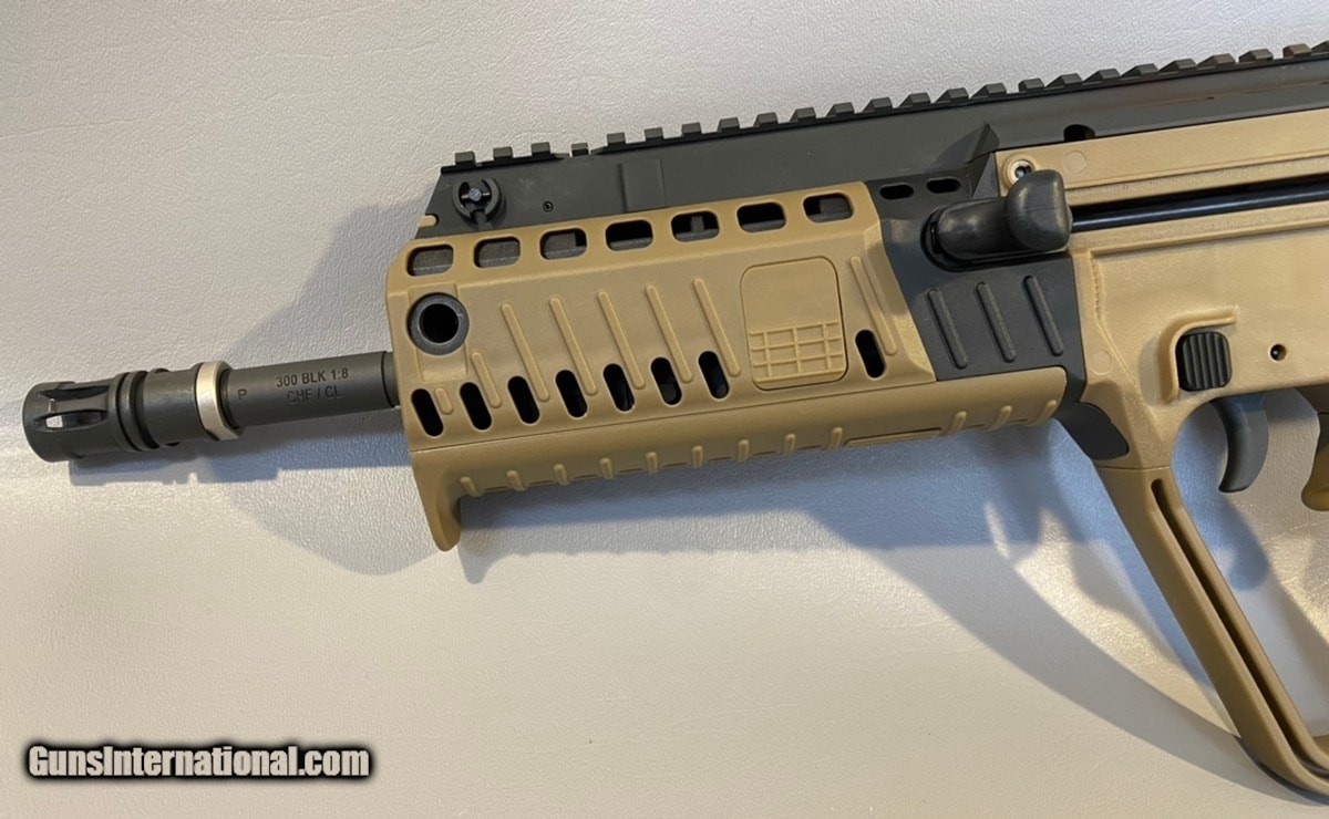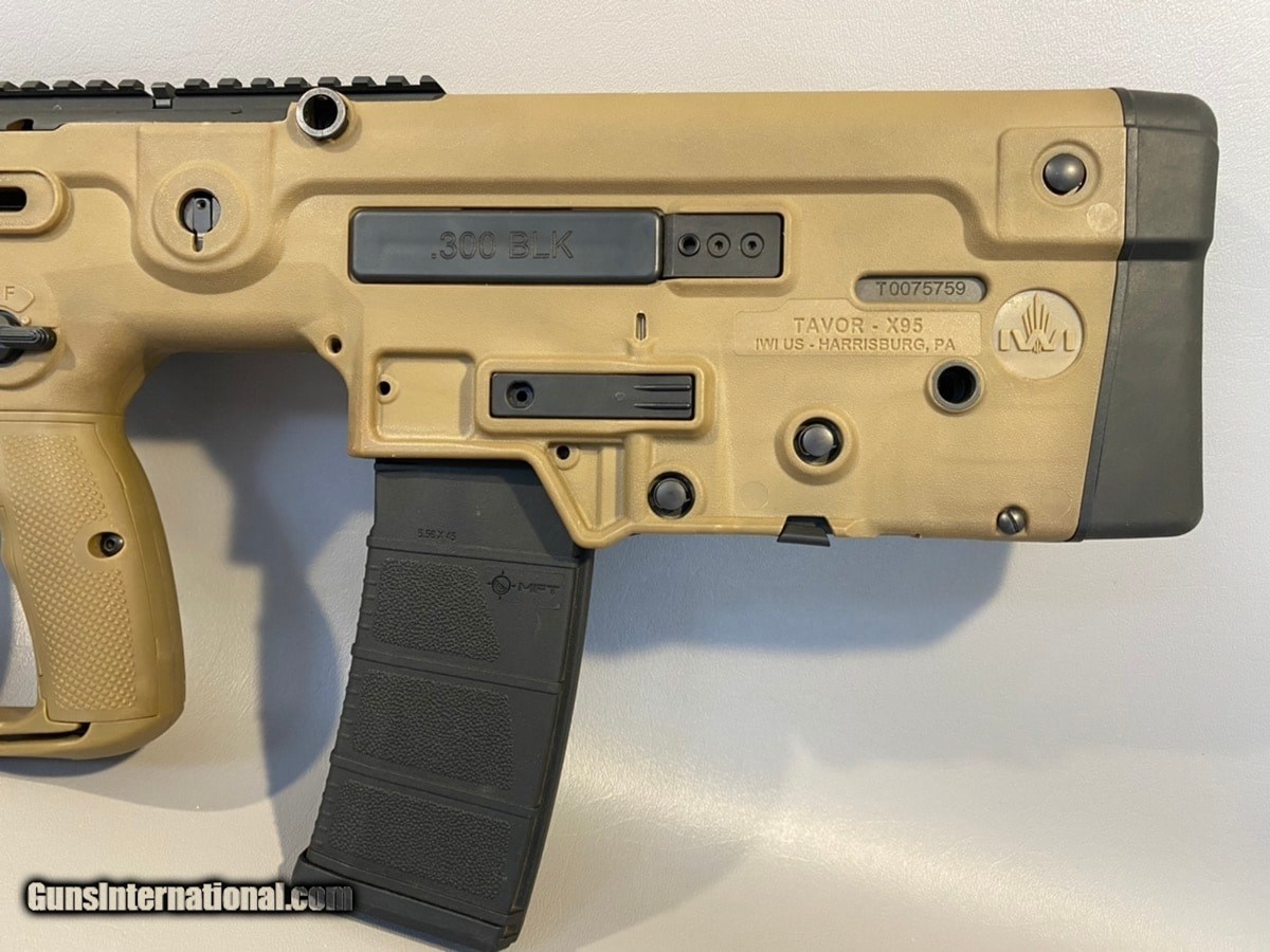 Description: Guns Listing ID: 667267 RIFLE: IWI TAVOR-X95, FLAT DARK EARTH, INCLUDES ORIGINAL BOX AND PAPERS, SEMI - AUTOMATIC, 300 BLK, 16\" BARREL DEALER SPECS: Tavor X95 is the next generation bullpup from IWI US, Inc. Upgrades and enhancements from the original TAVOR SAR include a new fire control pack with a 5-6 lb. trigger pull, repositioning of the ambidextrous mag release to an AR-15 location, a forearm with Picatinny rails at the 3, 6, and 9 o‚‚clock positions with removable rail covers, relocation of the charging handle closer to your center mass, a modular Tavor style pistol grip that can be swapped out to a standard pistol grip with traditional trigger guard, and a smaller, lower profile bolt release button. Caliber: 300 AAC Action/System: Semi-Auto/Gas Piston Material: Polymer Stock Color: FDE Sights: BUIS w/Tritium Front Post Barrel Length: 16.5” Barrel Twist: 1:8 Twist Direction: RH Barrel Muzzle Thread: 5/8 x 24 Overall Length 26.125\" Weight: 7.95 Magazine Capacity: 3 SOLD Manufacturer: IWI USA Model: TAVOR X95 Caliber Info: 300 AAC BLACKOUT Condition: Used - Non-Certified Barrels: 16.5 BARREL Finish: FDE |