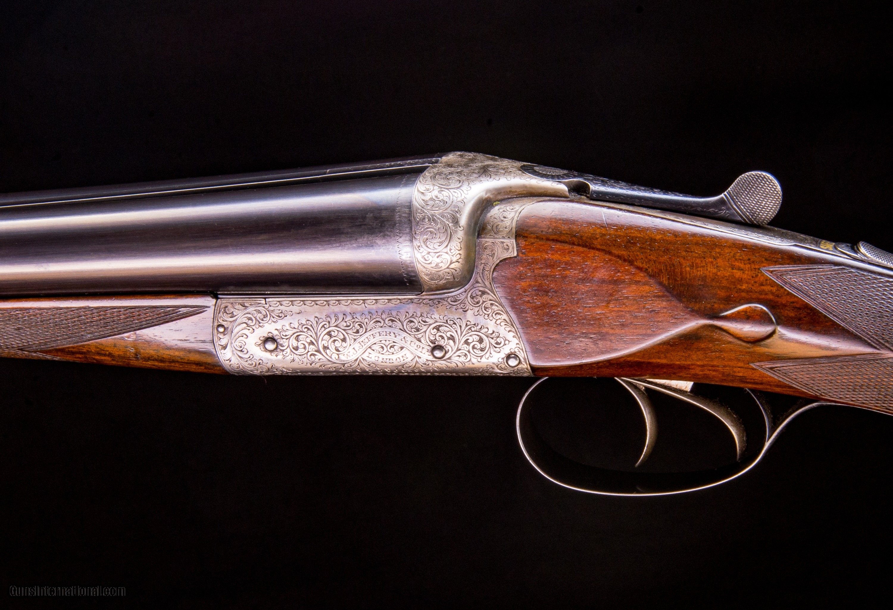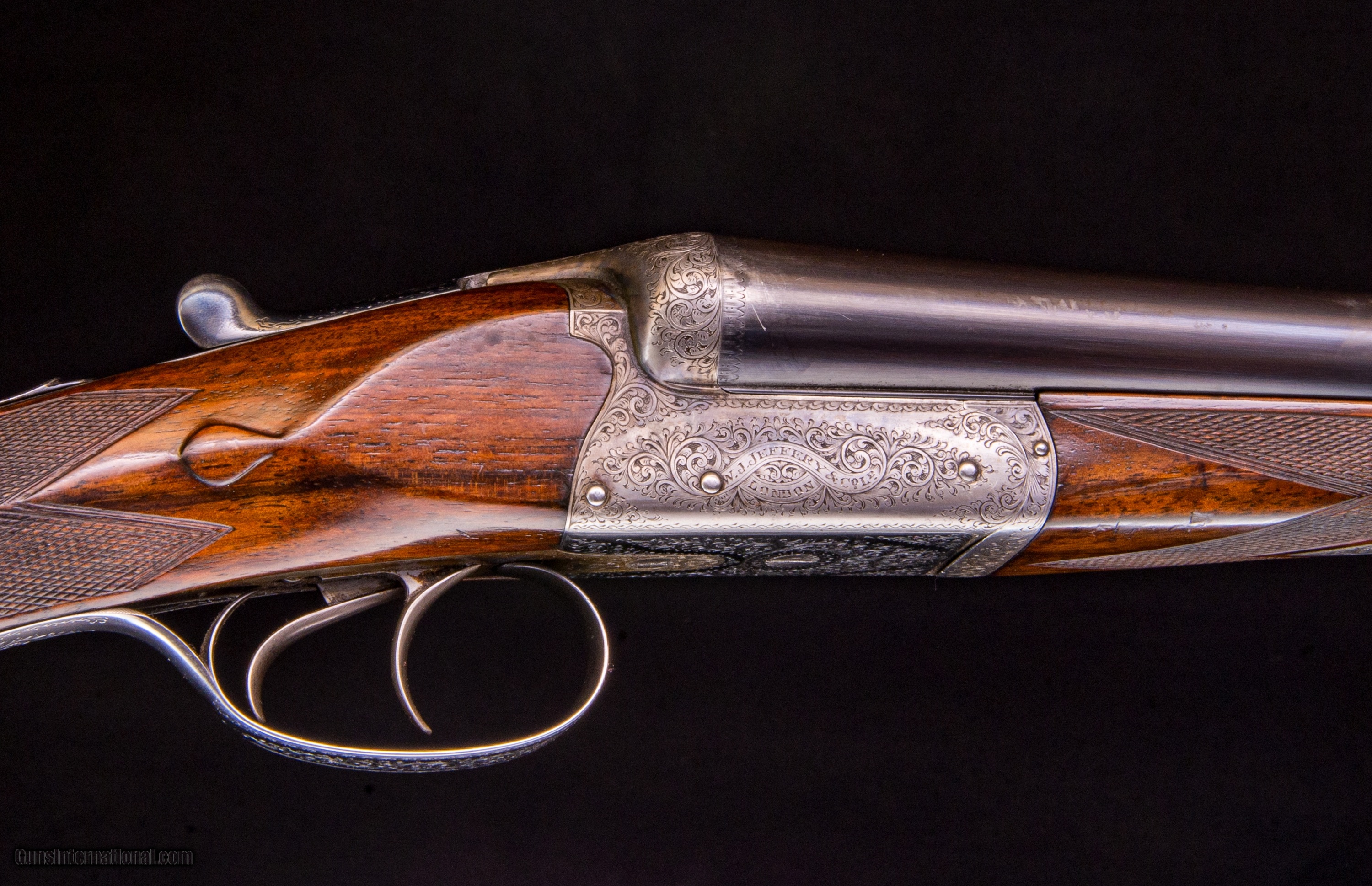 Description: Boxlocks - I really like this Jeffery. It balances perfectly and is tight on face with mirror bores. *This gun features a third bite using a hidden barrel extension with bolt over the top. Sometimes we call this a hidden third nose. *50% case color and beautiful engraving and scallops make this a higher-grade example.
